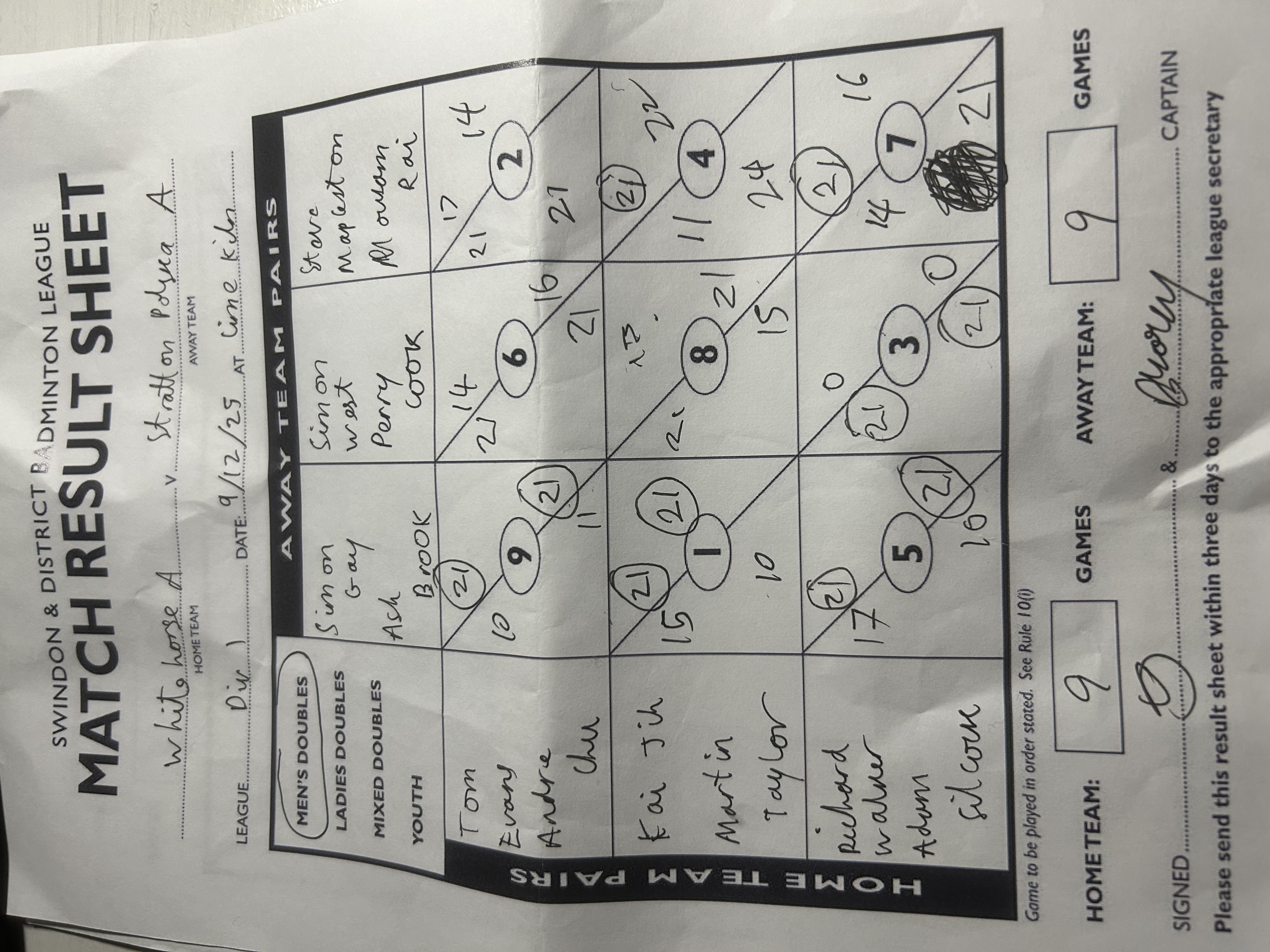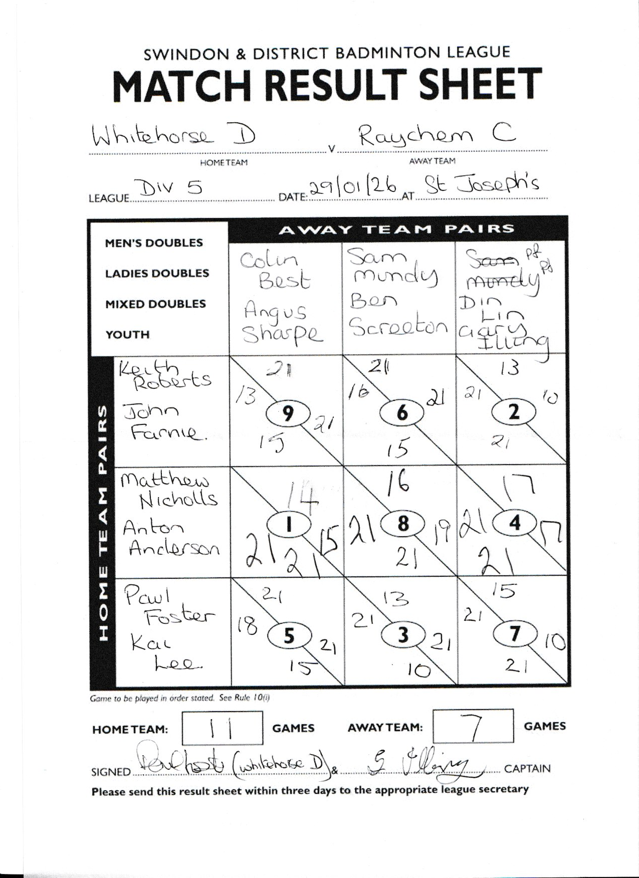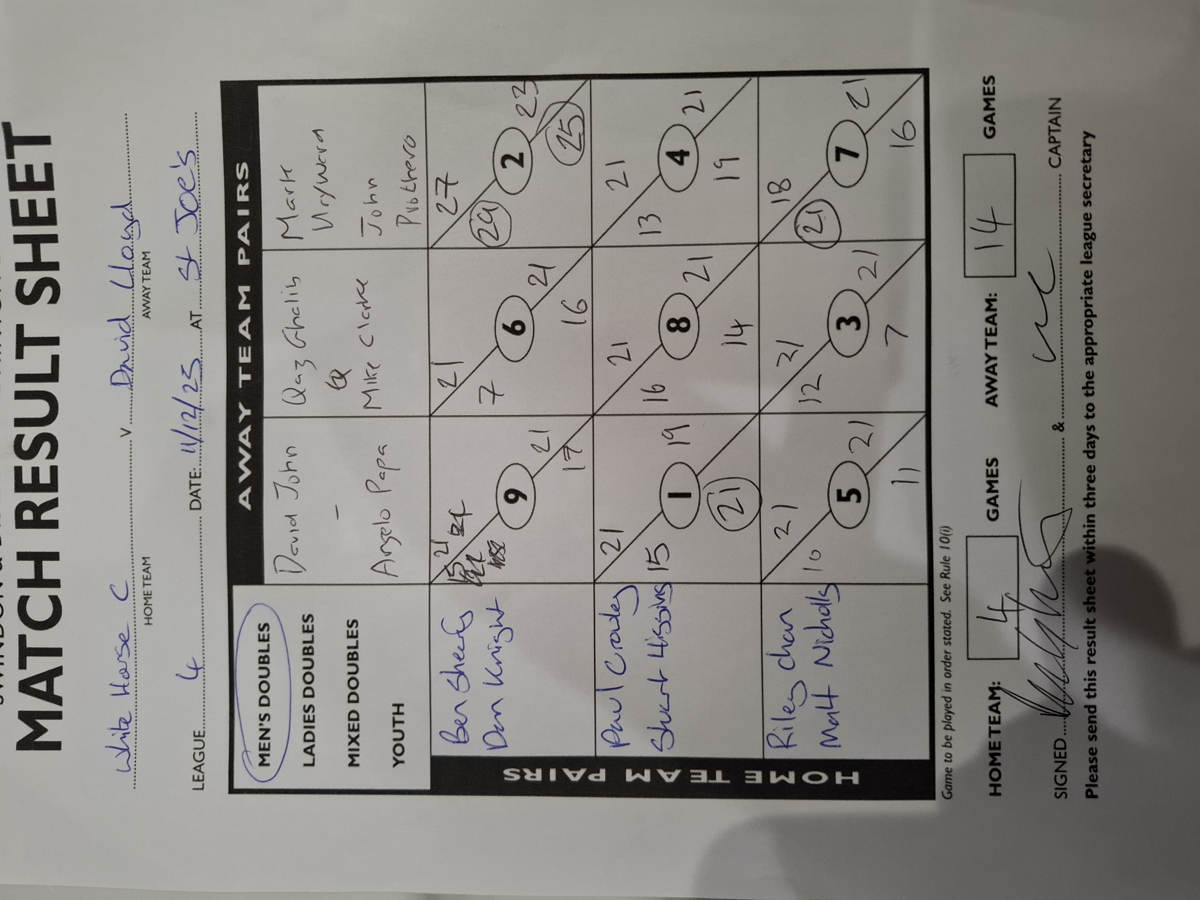 | 11-09-2025 | 20:00 | Thursday | Raychem B | Whitehorse C | Ridgeway Leisure Centre, Inverary Road, Wroughton, Swindon, SN4 9DJ | 13 - 5 | |