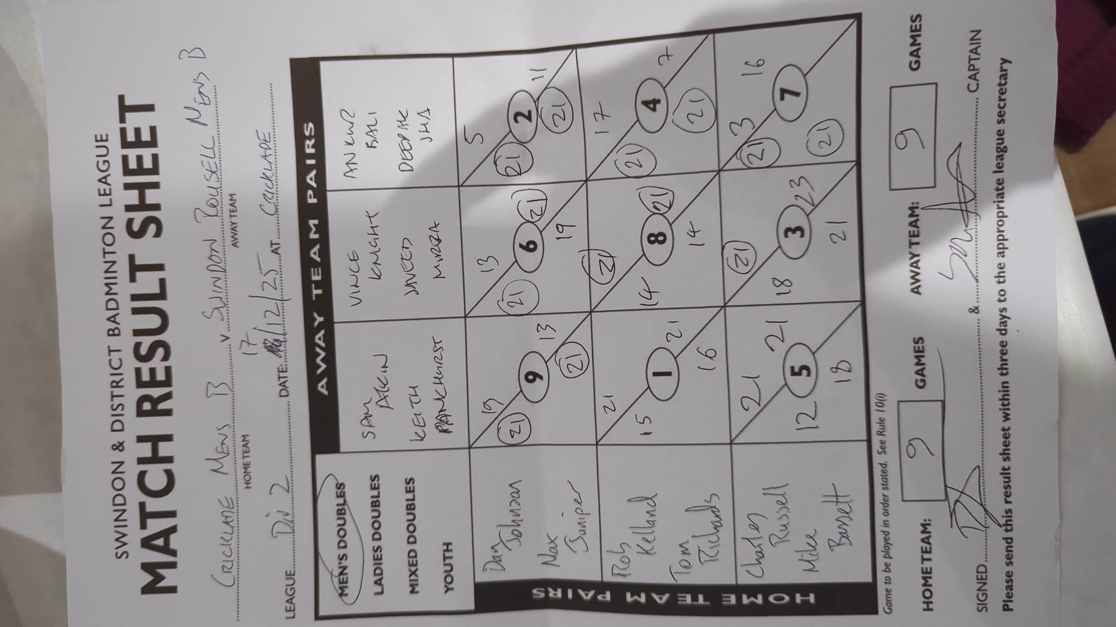 | 17-12-2025 | 19:30 | Wednesday | Cricklade B | Swindon-Roussel B | Cricklade Leisure Centre, Stones Lane, Cricklade, Swindon, Wiltshire, SN6 6JW | 9 - 9 | |