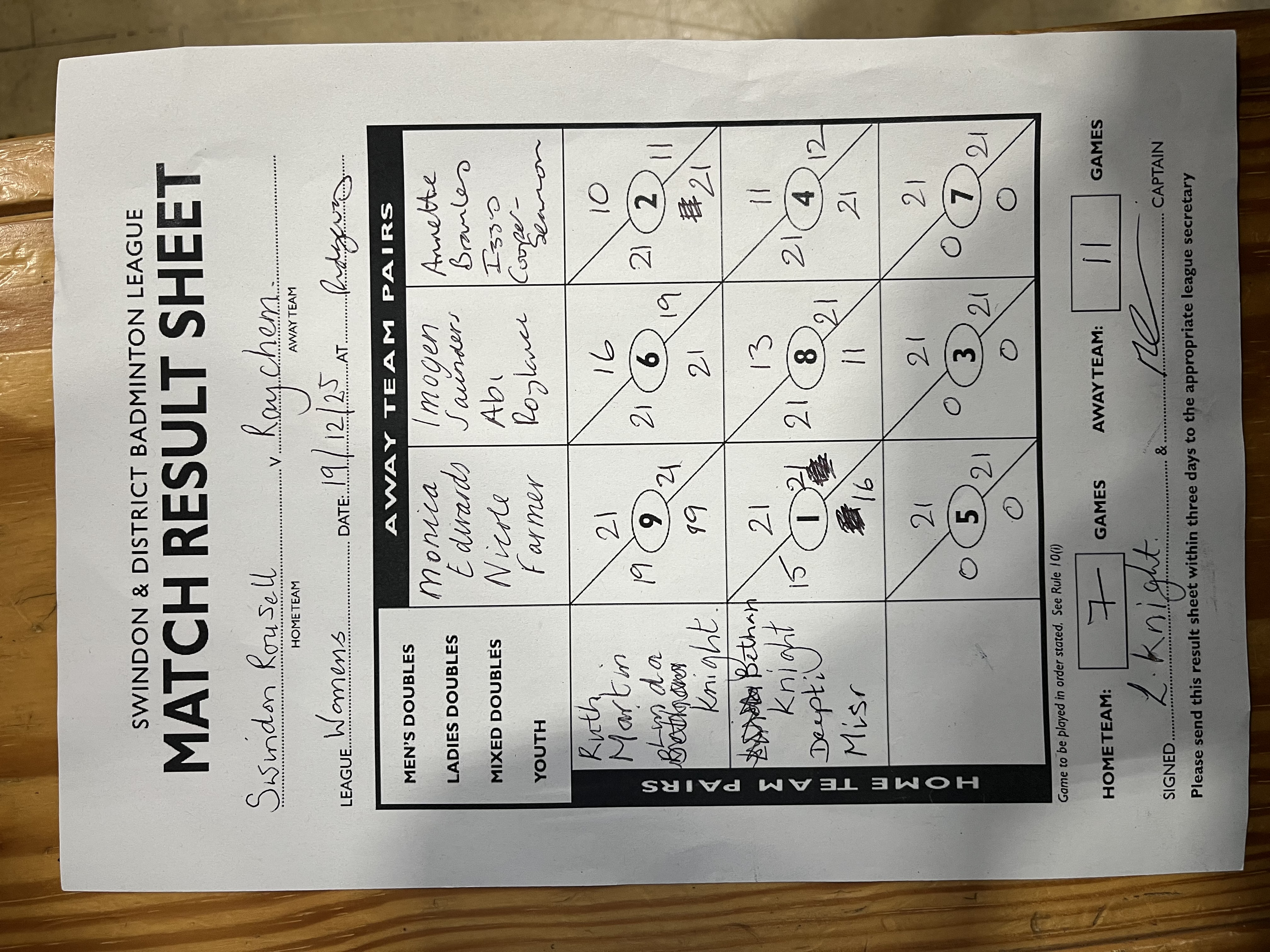 | 06-11-2025 | 20:00 | Thursday | Raychem A | Whitehorse B | Ridgeway Leisure Centre, Inverary Road, Wroughton, Swindon, SN4 9DJ | 11 - 7 | |