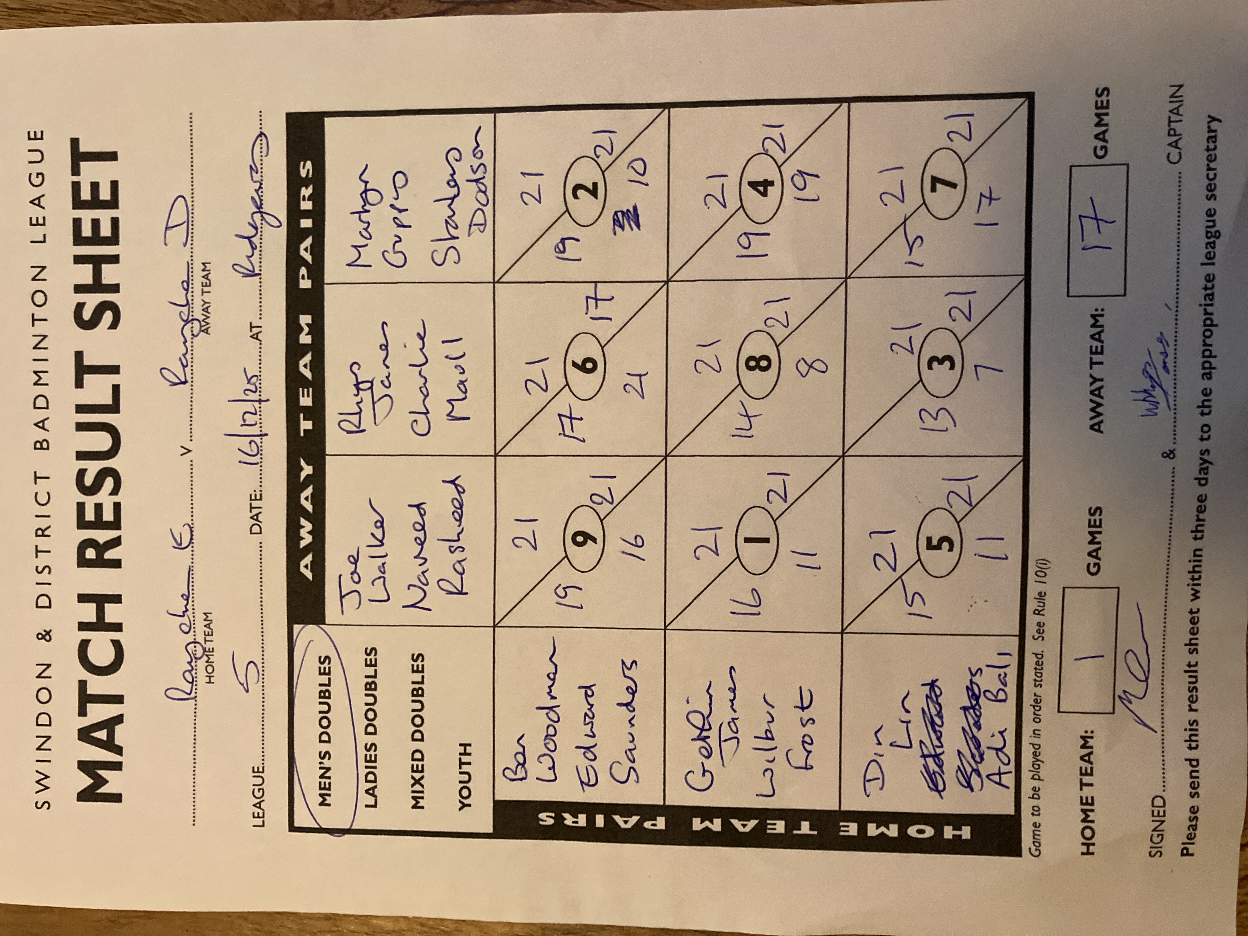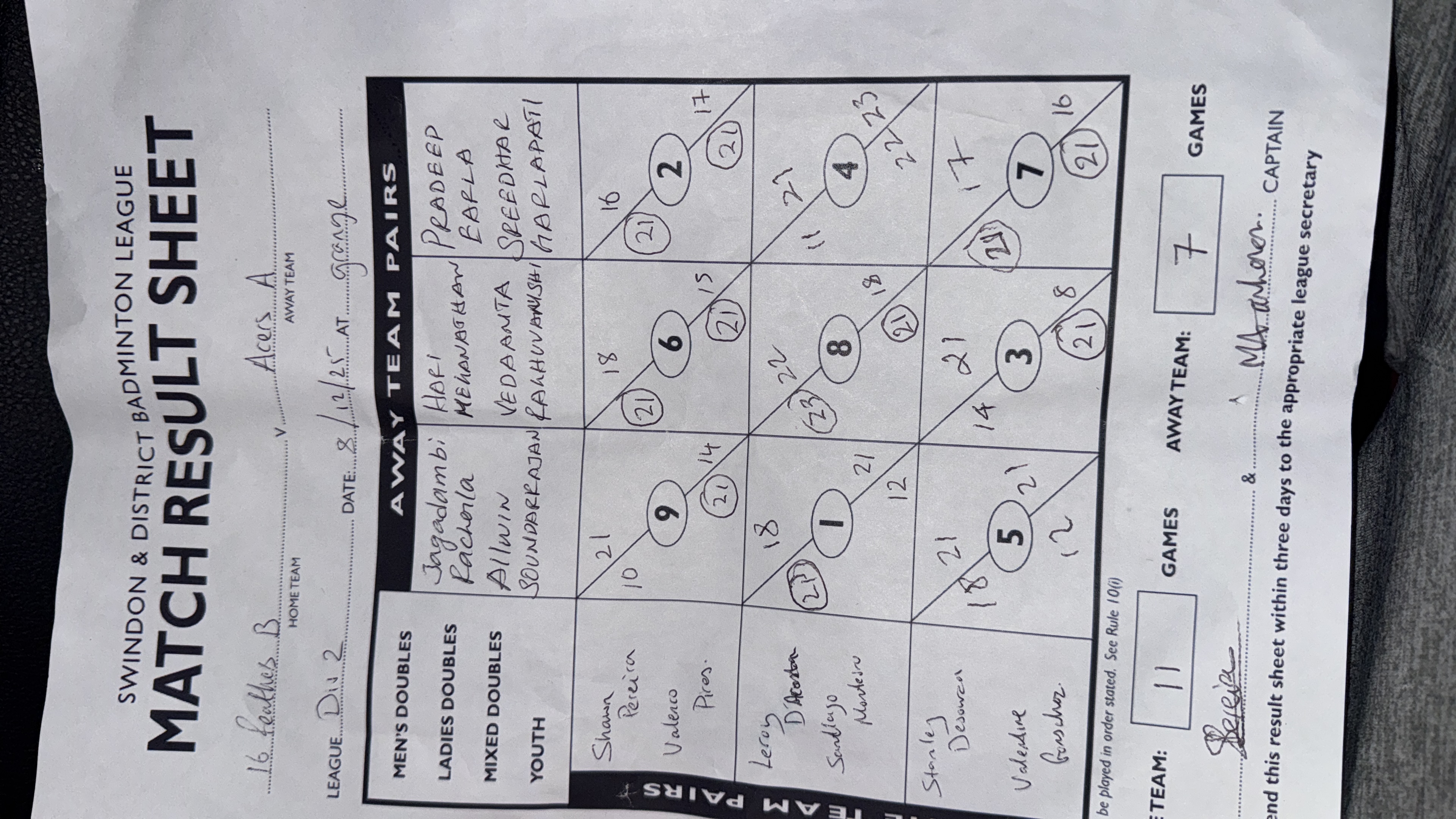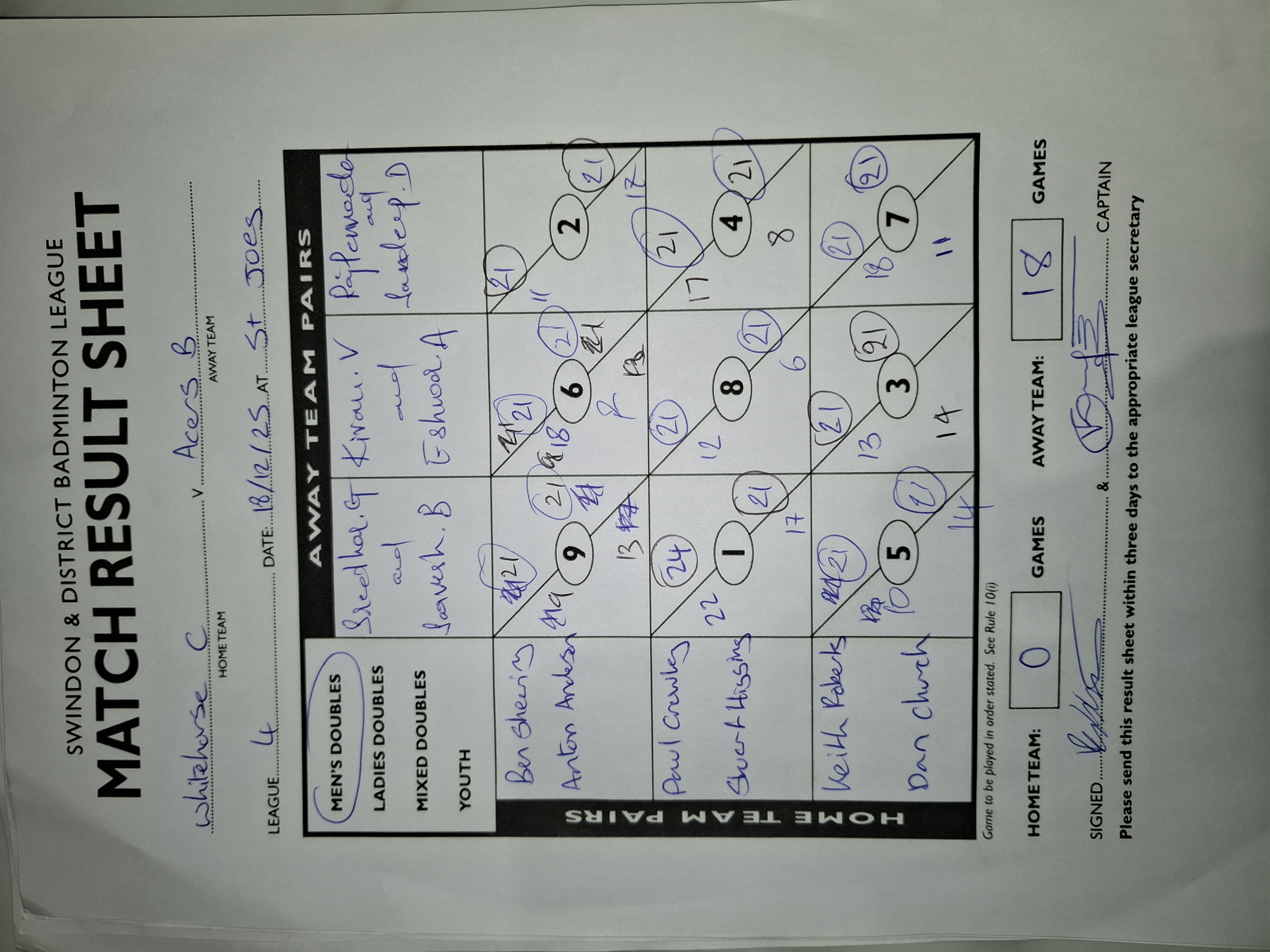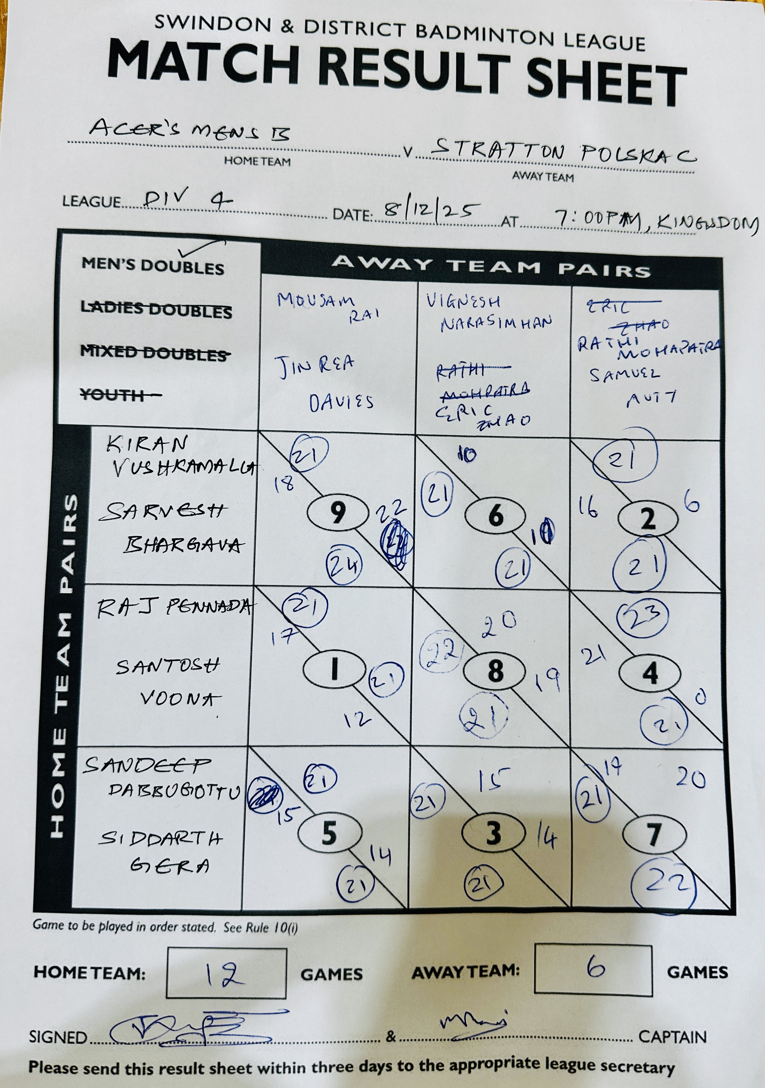 | 08-12-2025 | 19:00 | Monday | 16 Feathers B | Acers A | Grange Leisure and Community Centre, Grange Dr, Swindon, SN3 4JY | 11 - 7 | |
