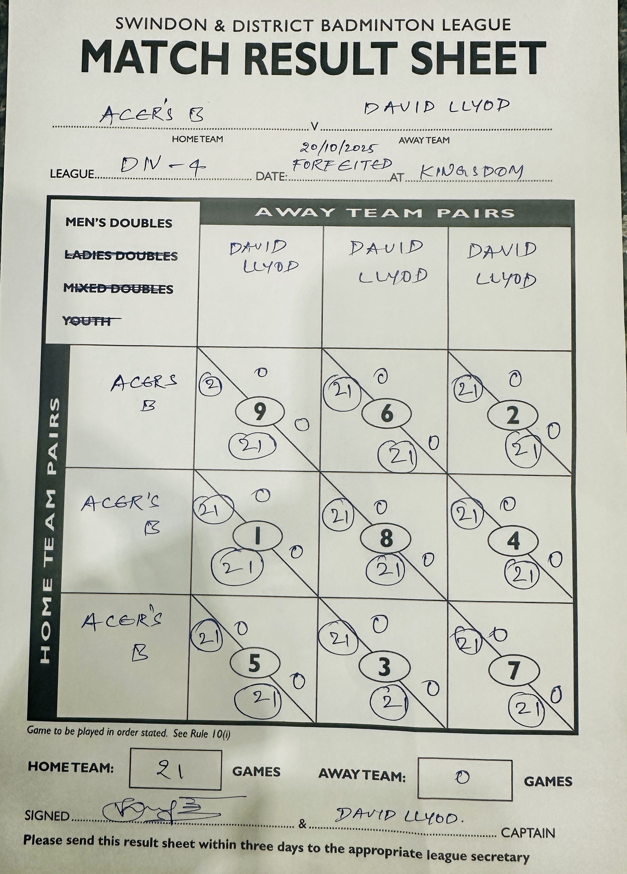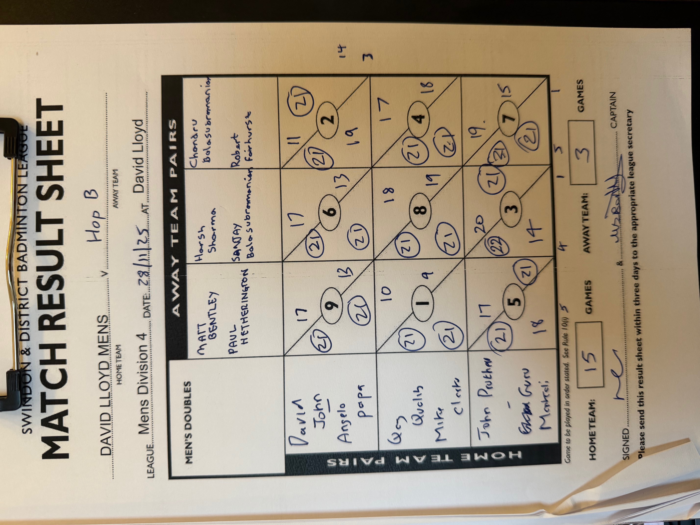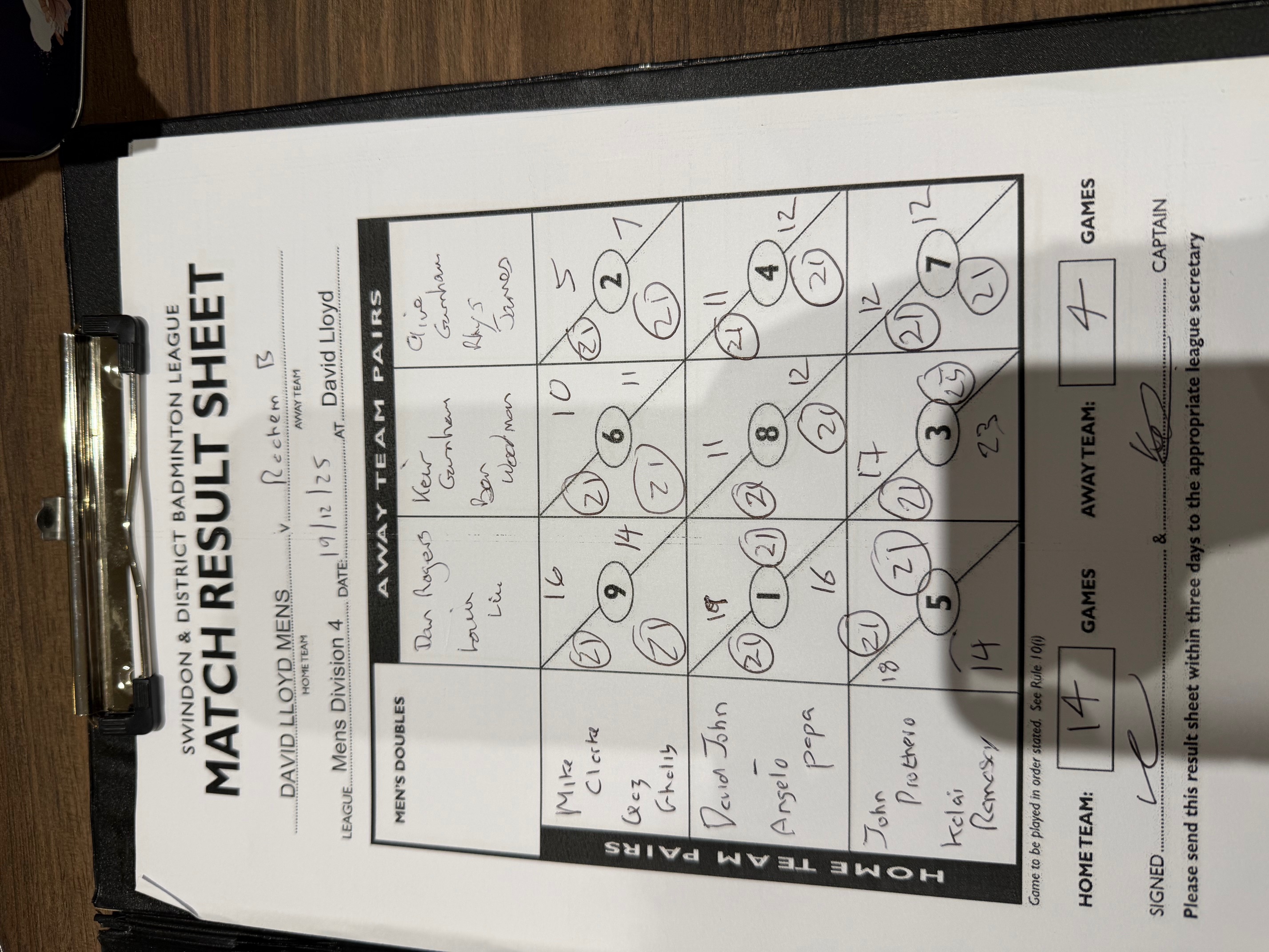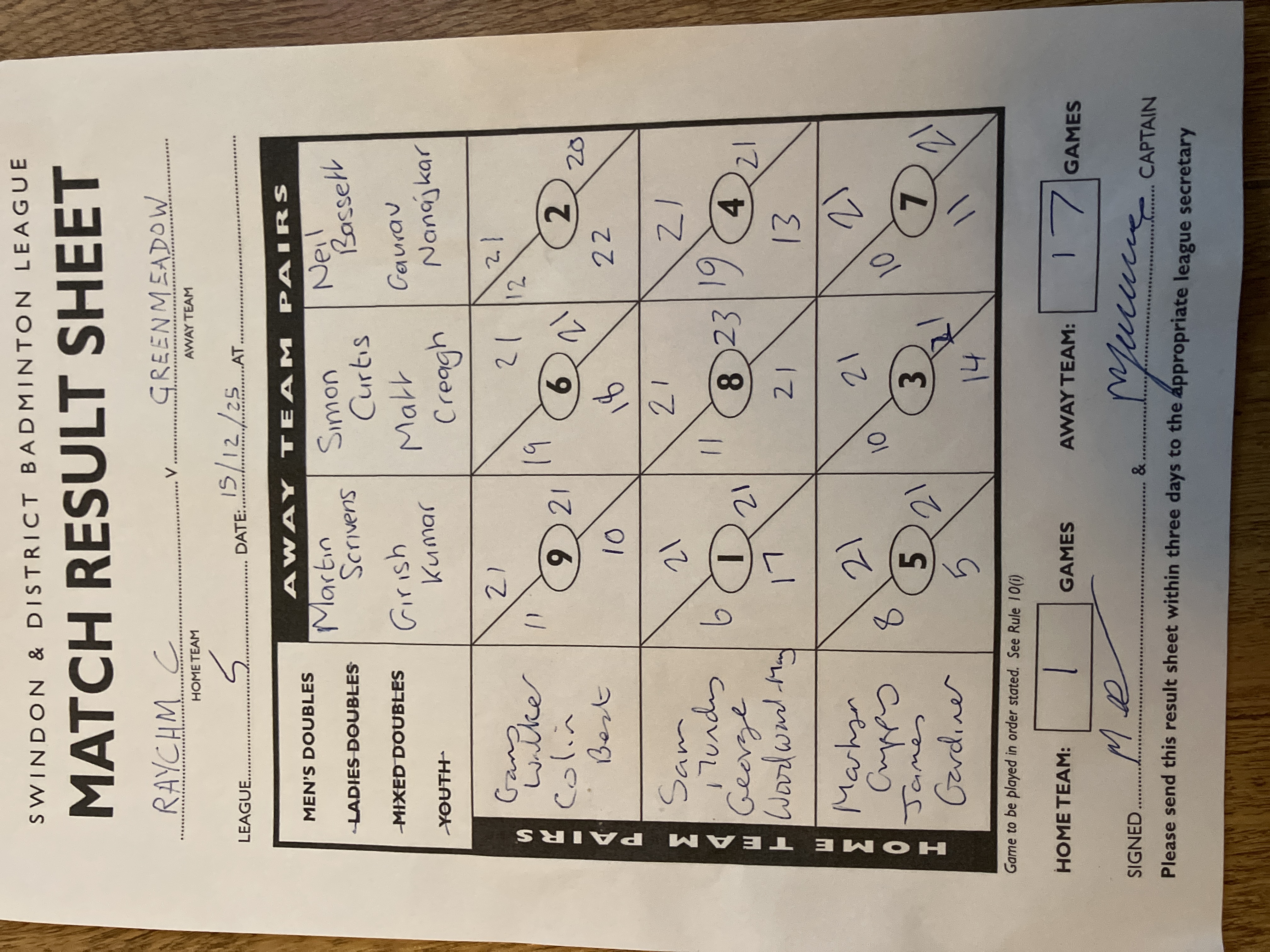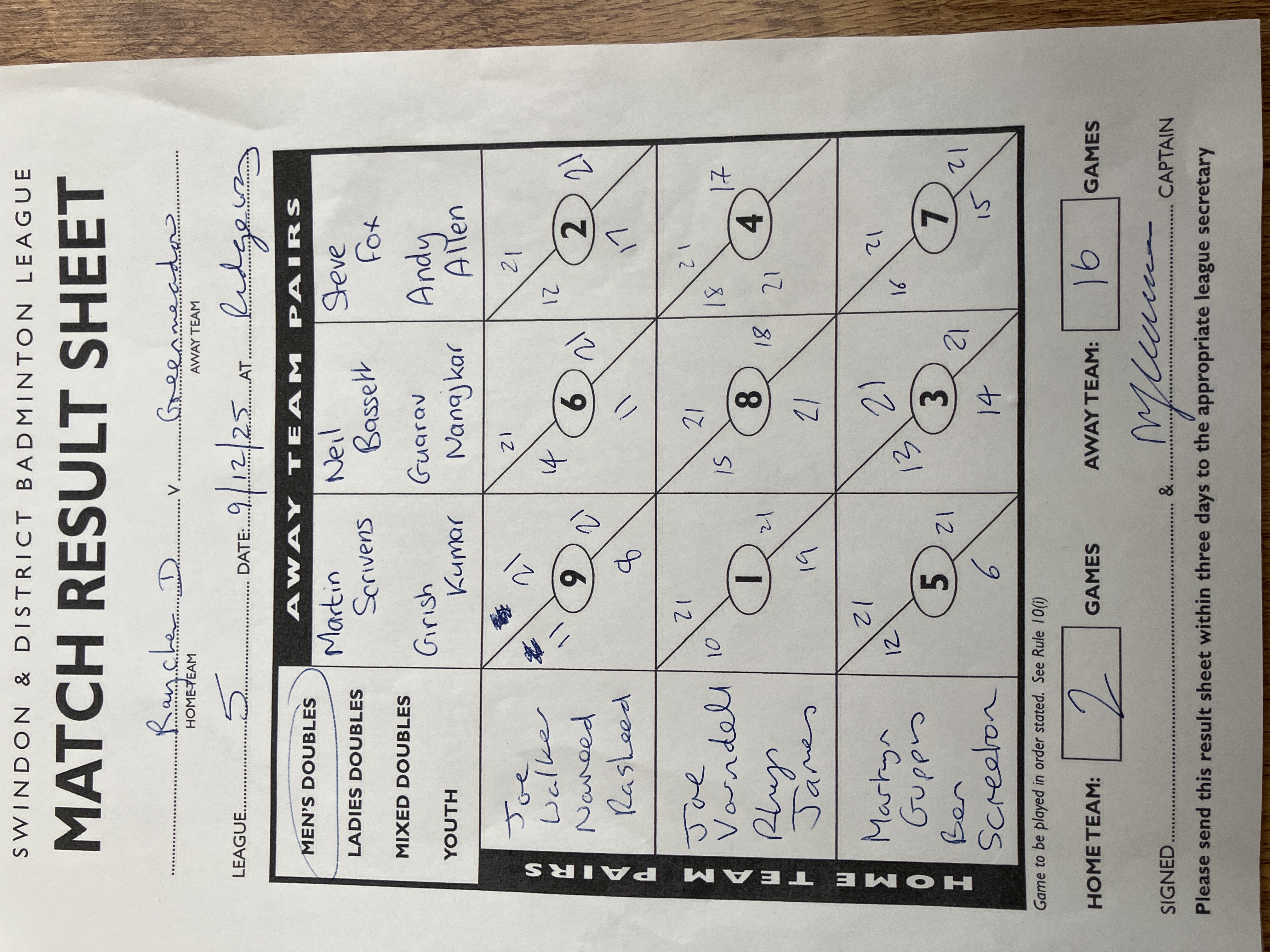 | 25-09-2025 | 20:00 | Thursday | Raychem B | David Lloyd | Ridgeway Leisure Centre, Inverary Road, Wroughton, Swindon, SN4 9DJ | 10 - 8 | |