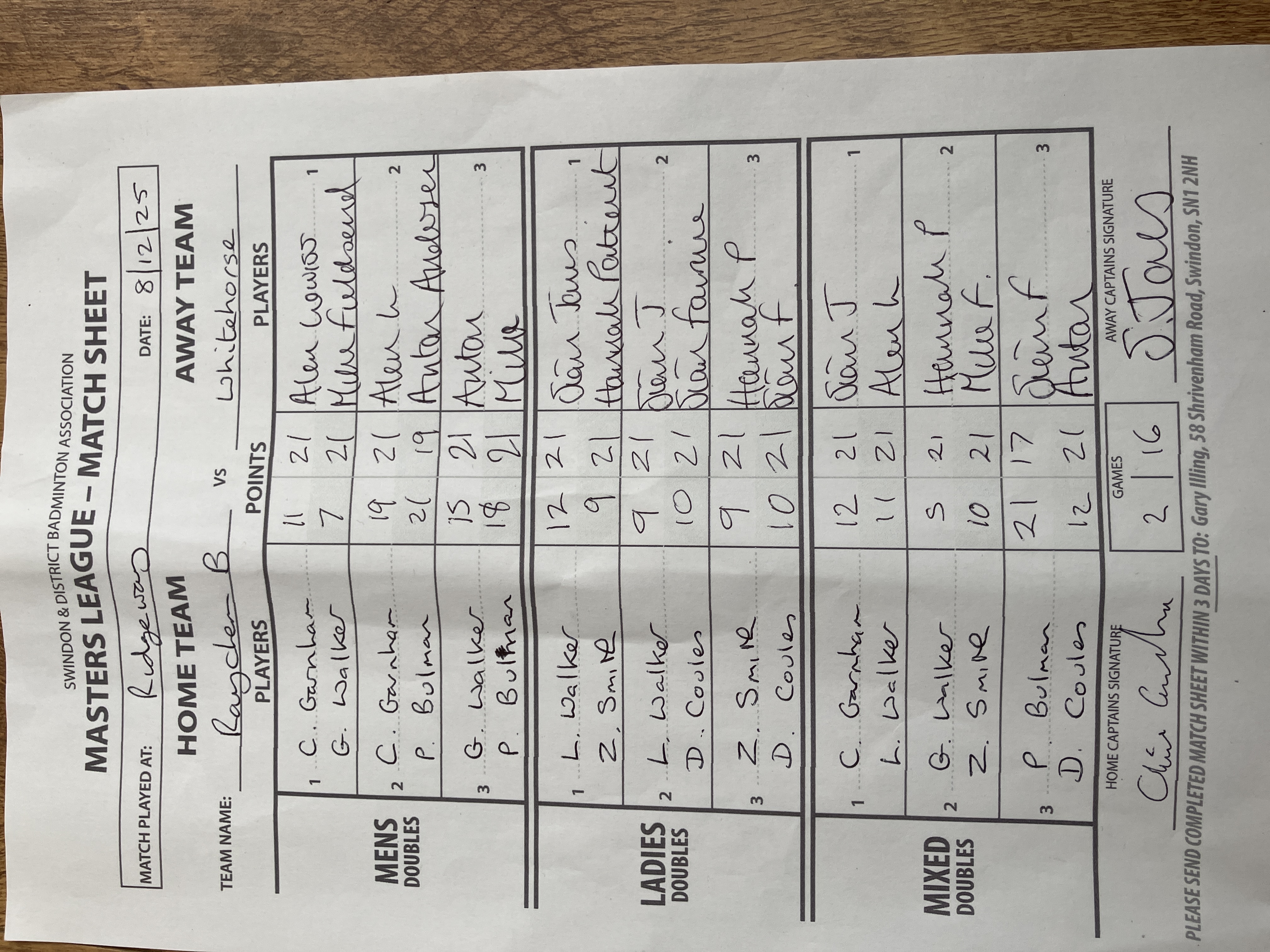 | 16-12-2025 | 20:00 | Tuesday | Whitehorse | Raychem A | Lime Kiln Leisure Centre, Royal Wootton Bassett, Swindon, SN4 7HG | Upload | |