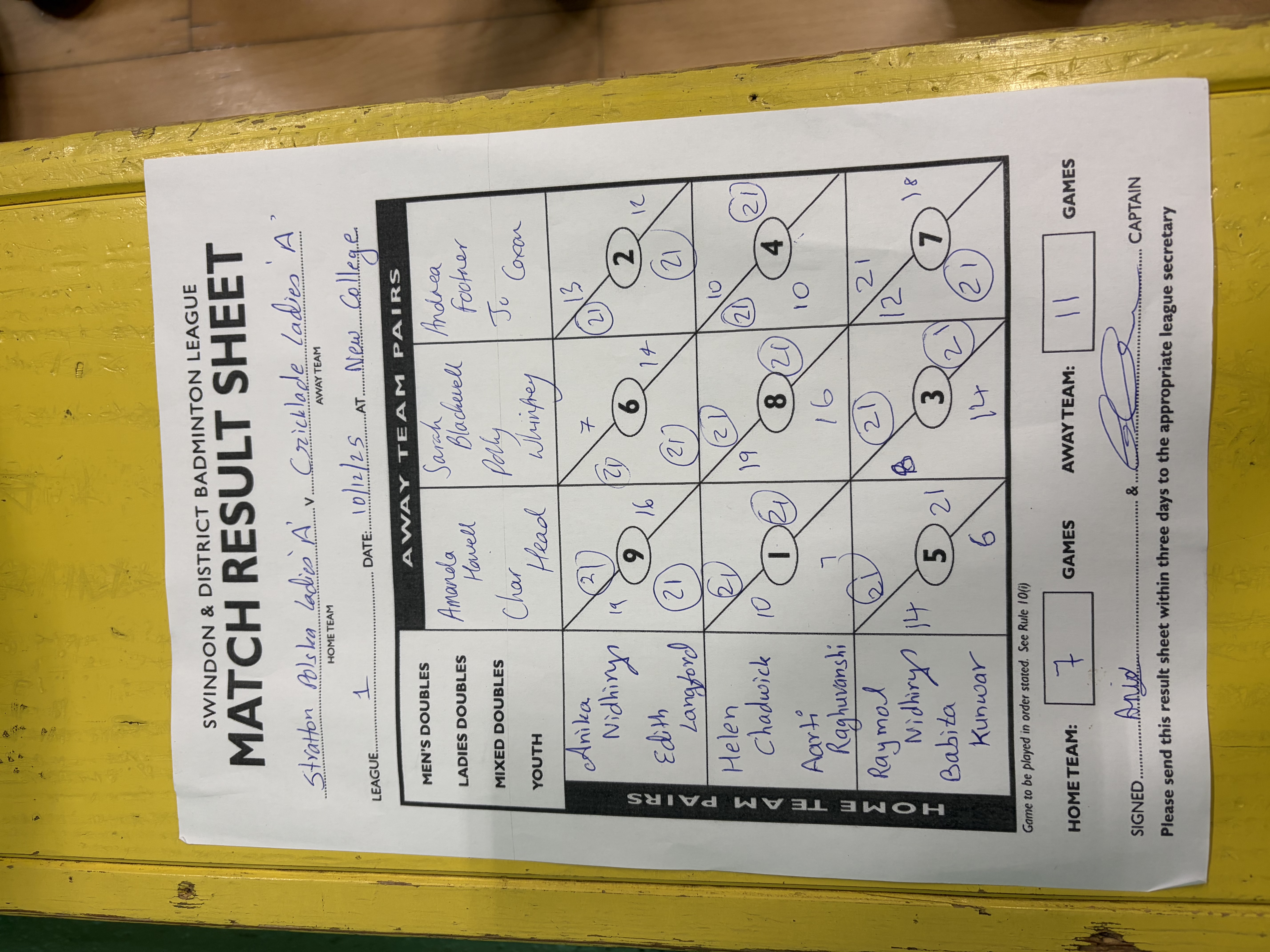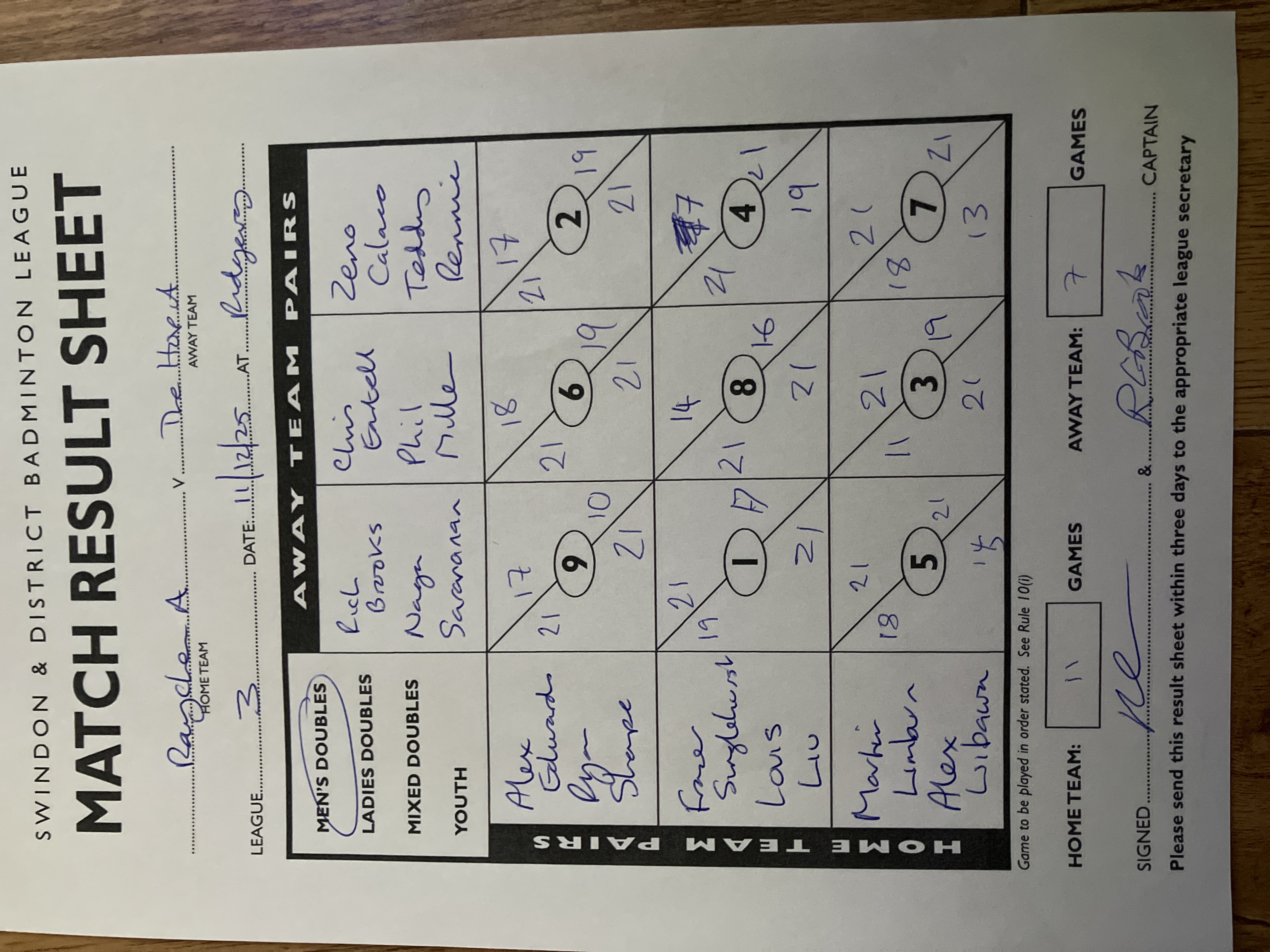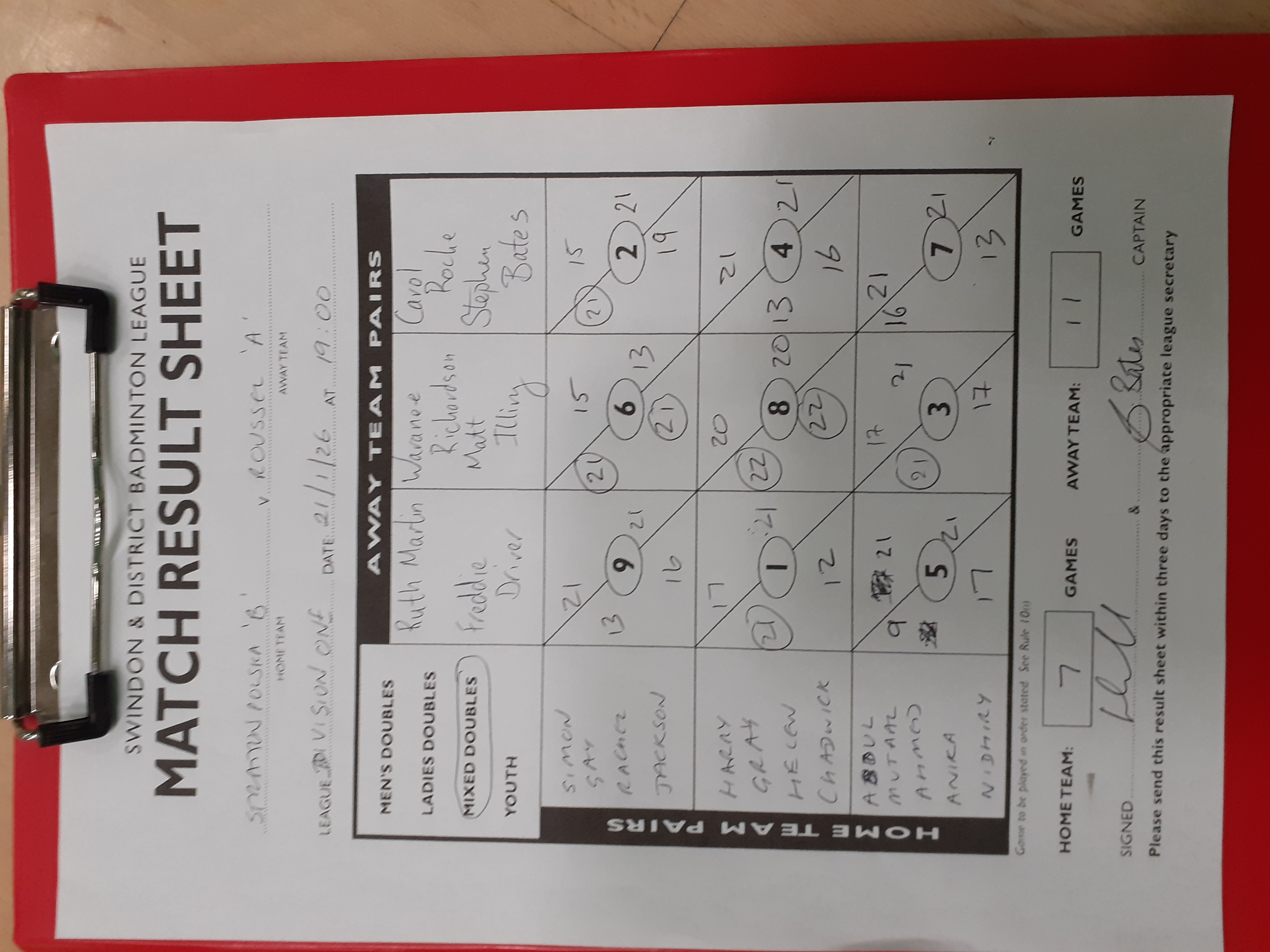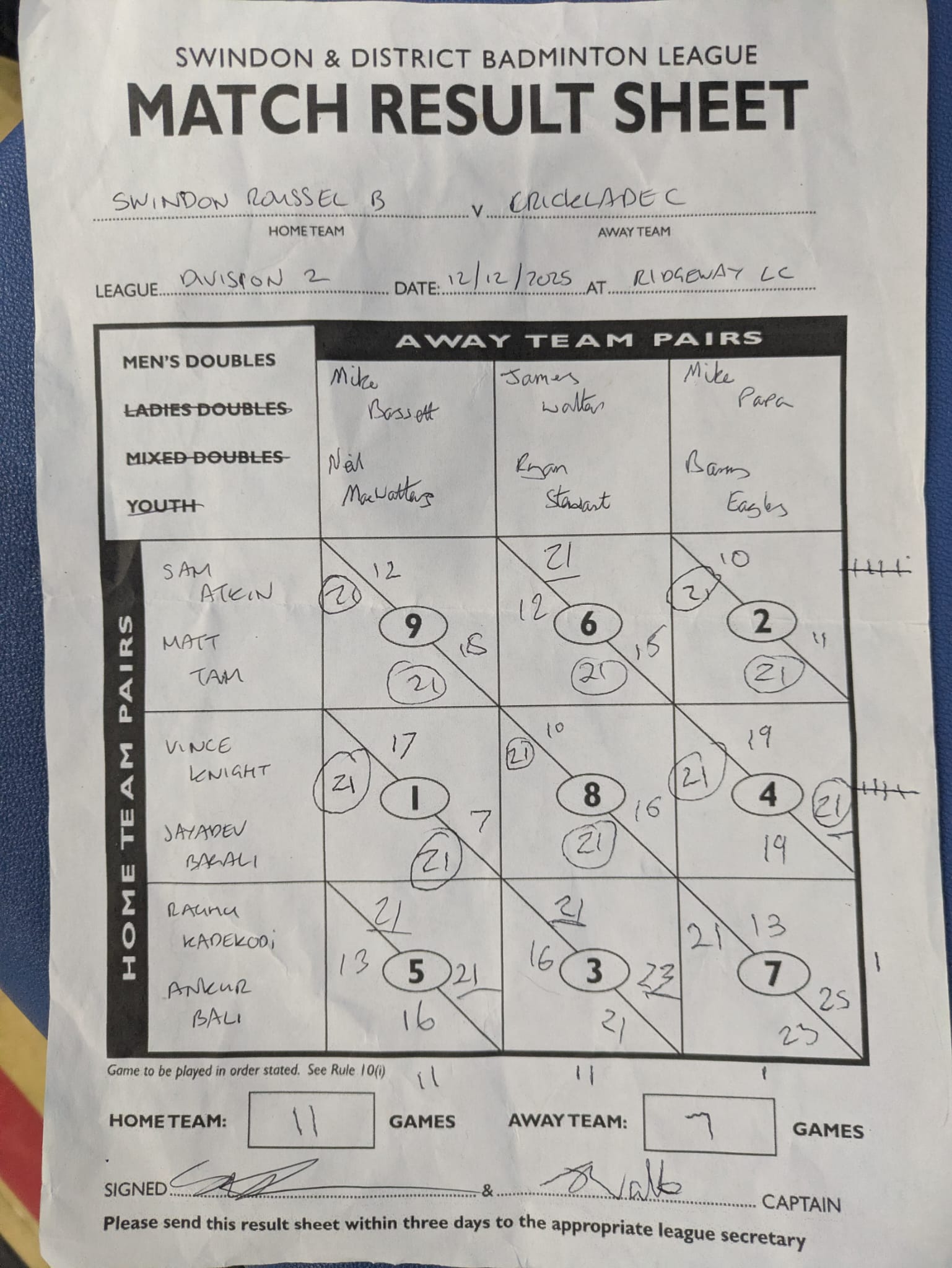 | 26-09-2025 | 19:00 | Friday | Swindon-Roussel B | 16 Feathers B | Ridgeway Leisure Centre, Inverary Road, Wroughton, Swindon, SN4 9DJ | 11 - 7 | |