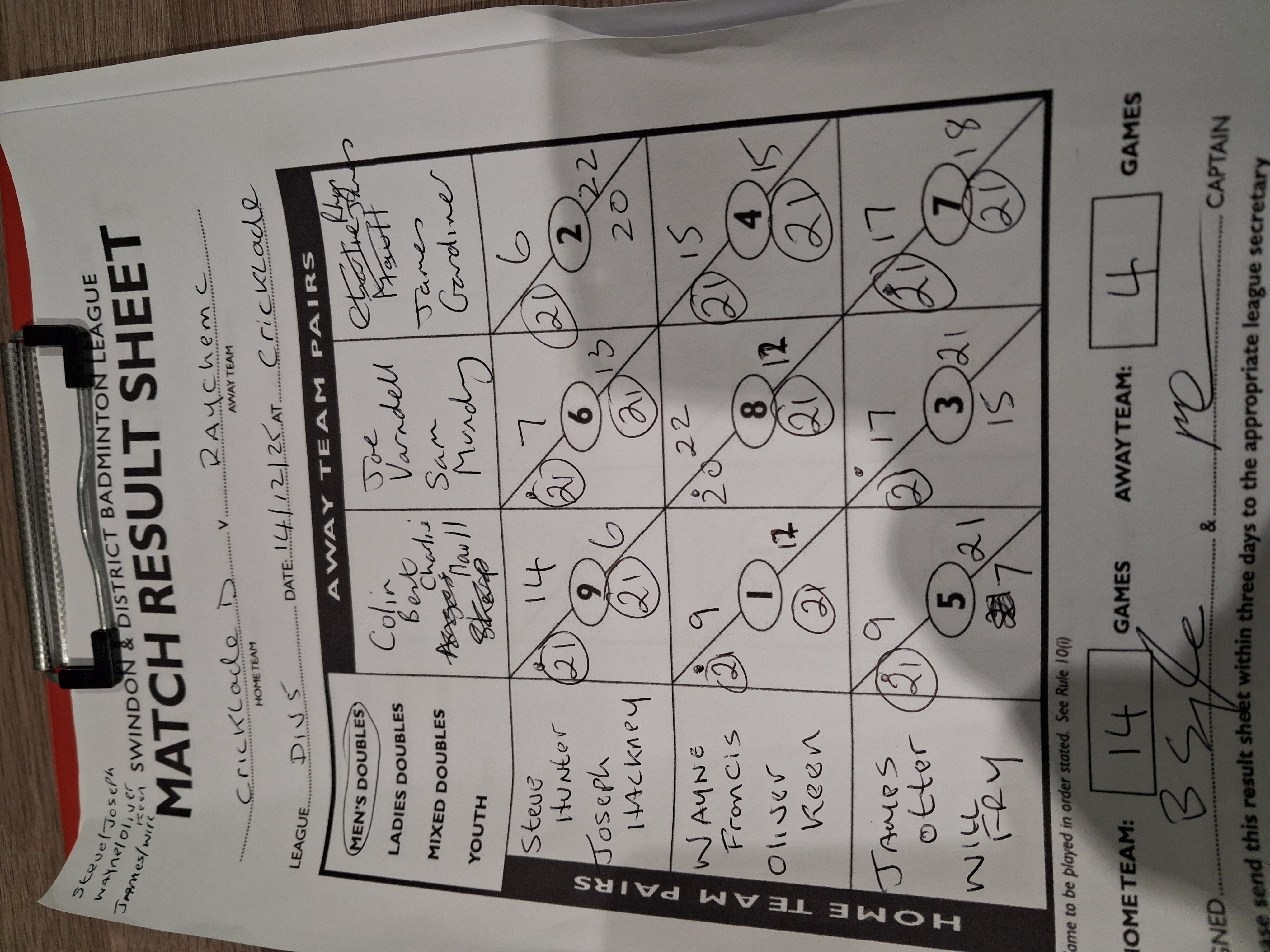 | 26-04-2026 | 18:45 | Sunday | Cricklade C | Swindon-Roussel B | Cricklade Leisure Centre, Stones Lane, Cricklade, Swindon, SN6 6JW | Upload | |