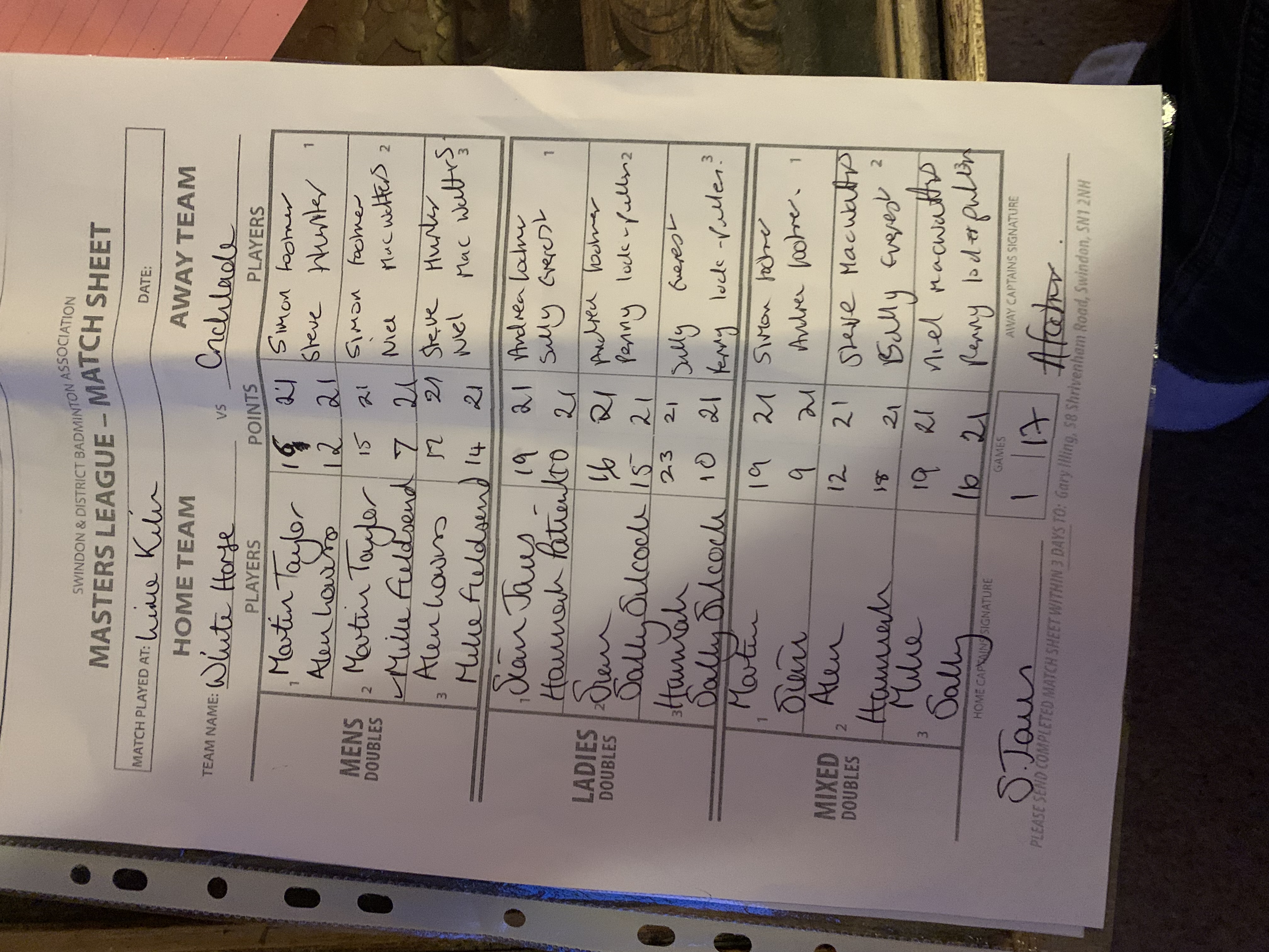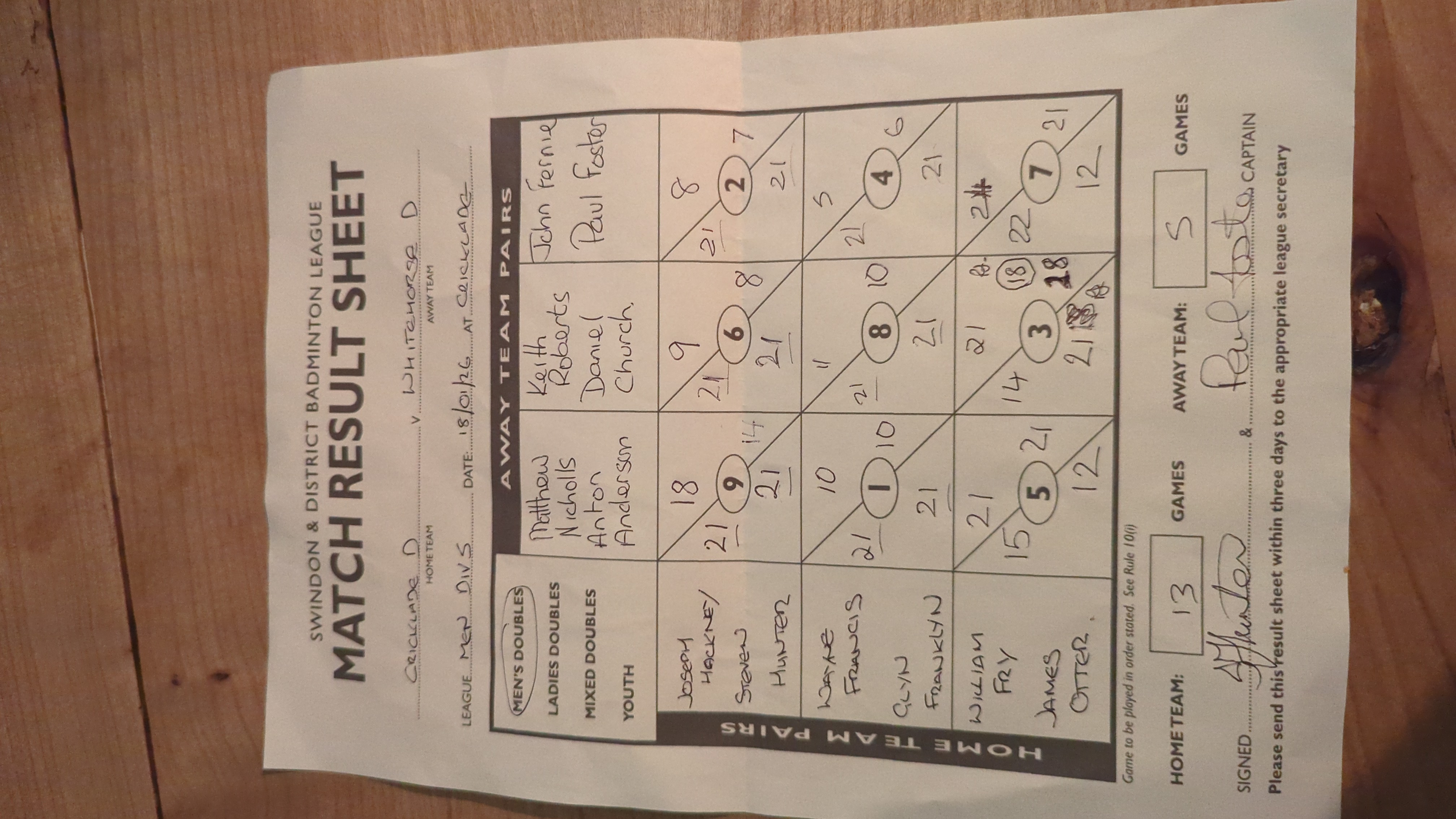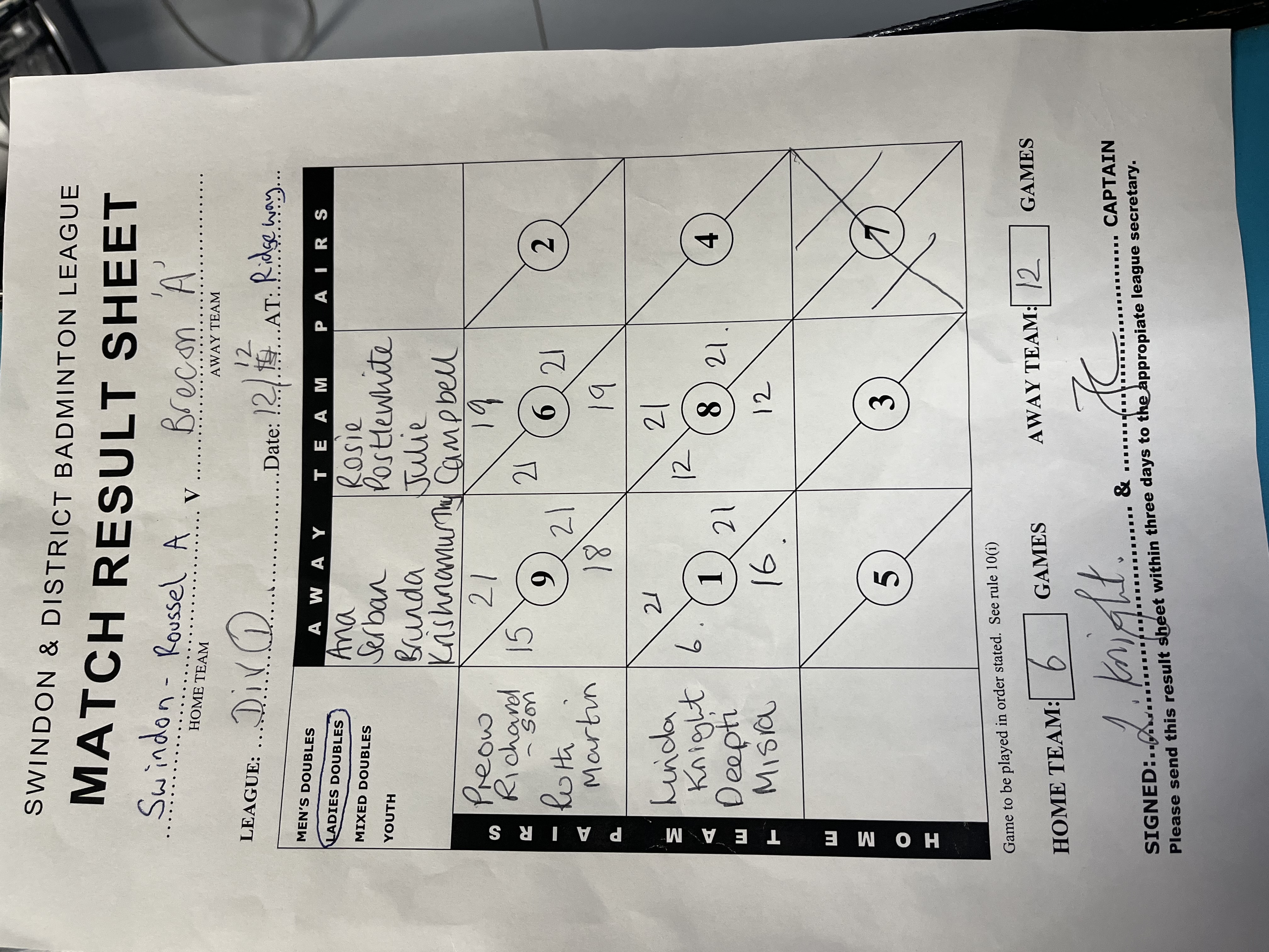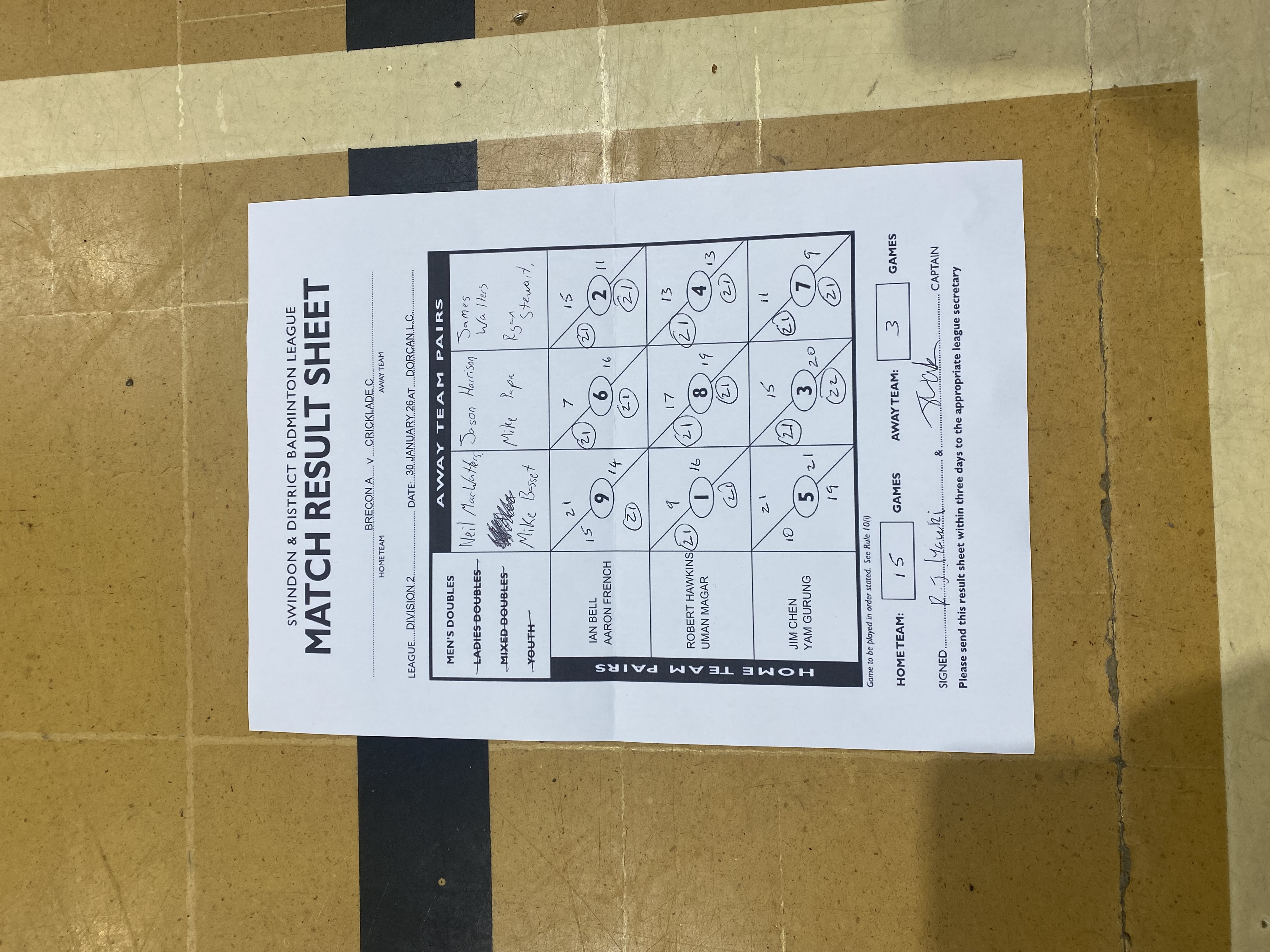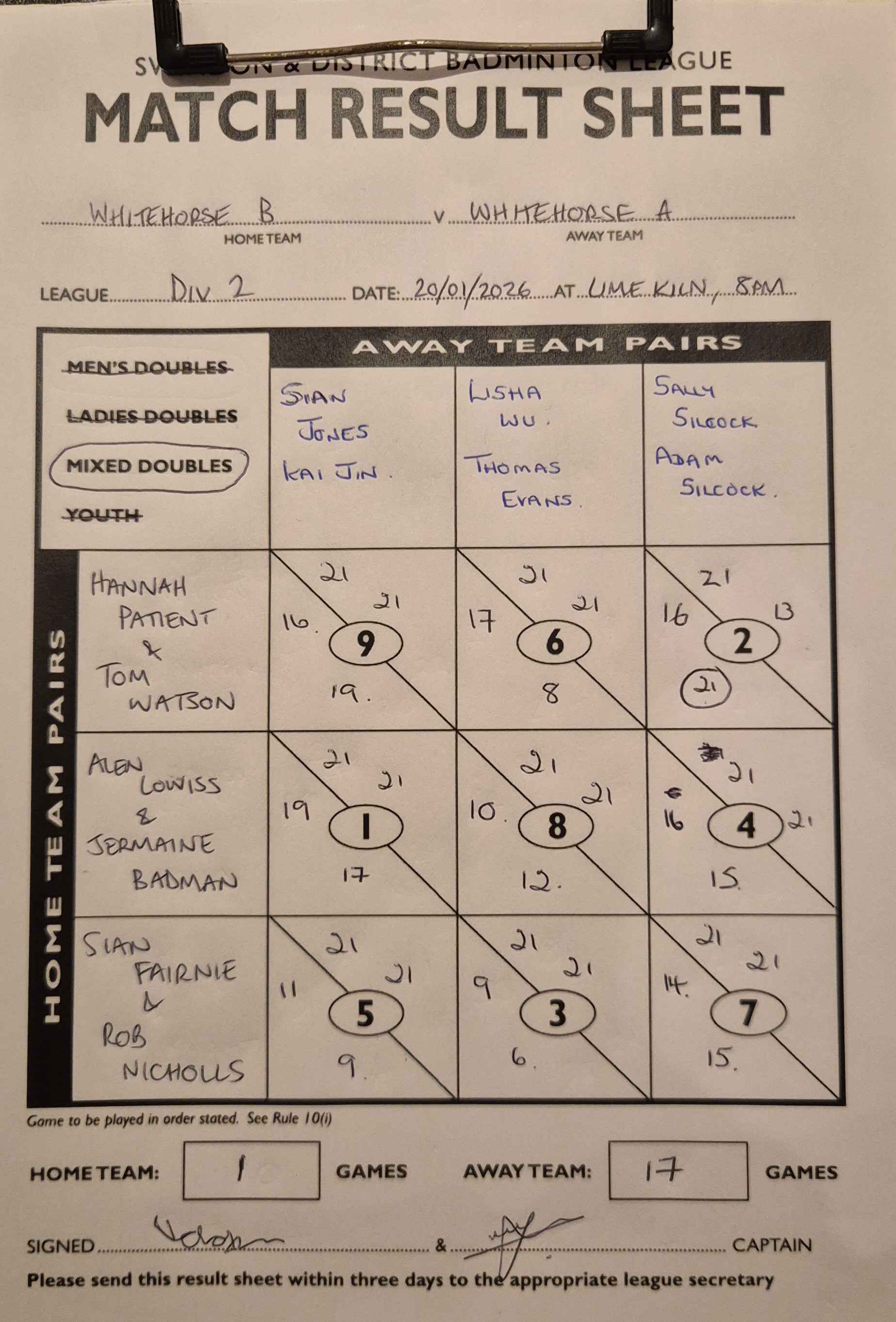 | 09-02-2026 | 19:30 | Monday | Swindon-Roussel C | Whitehorse B | Cricklade Leisure Centre, Stones Lane, Cricklade, Swindon, SN6 6JW | Upload | |