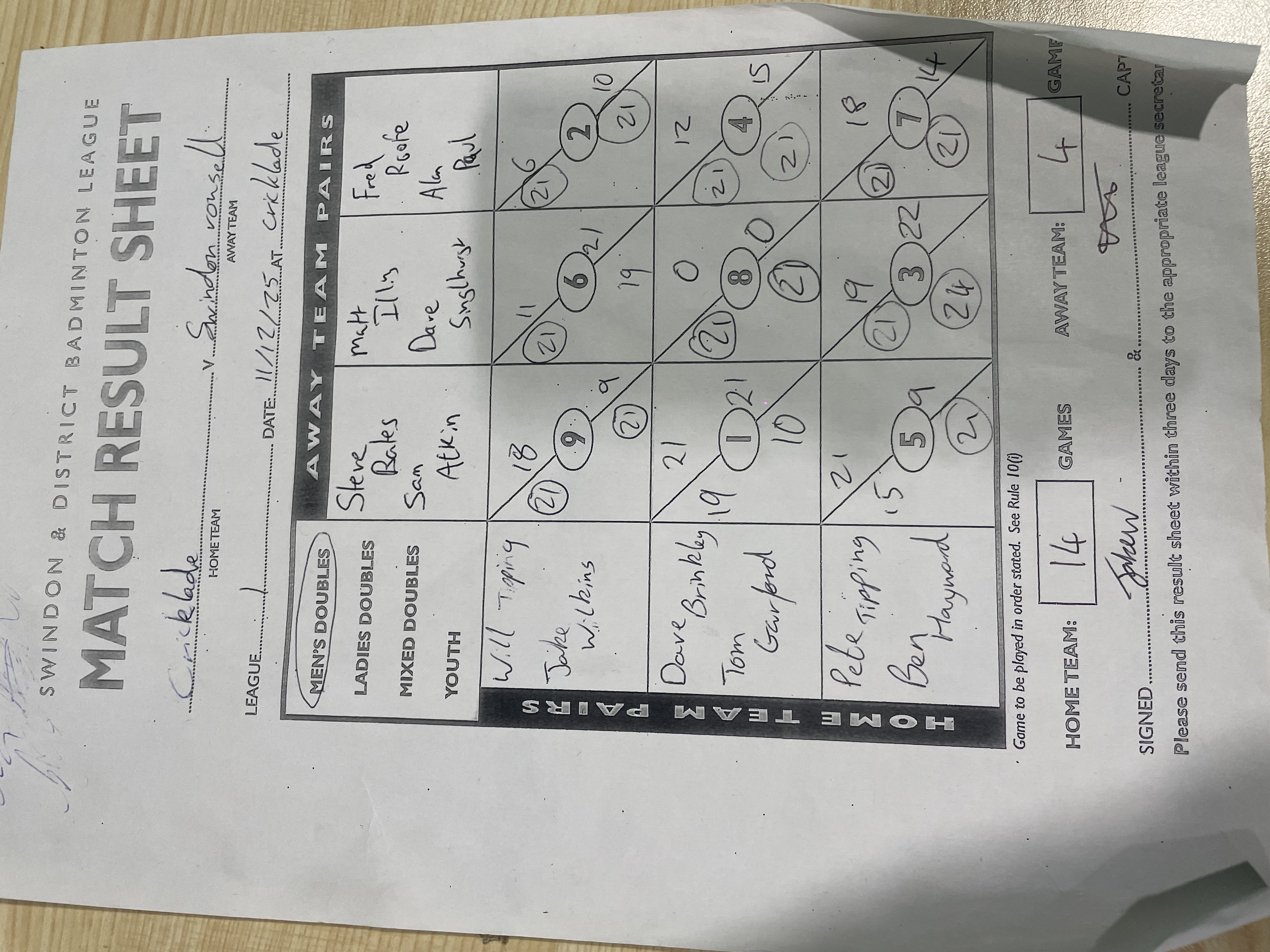 | 11-12-2025 | 20:00 | Thursday | Cricklade A | Swindon-Roussel A | Cricklade Leisure Centre, Stones Lane, Cricklade, Swindon, Wiltshire, SN6 6JW | 14 - 4 | |