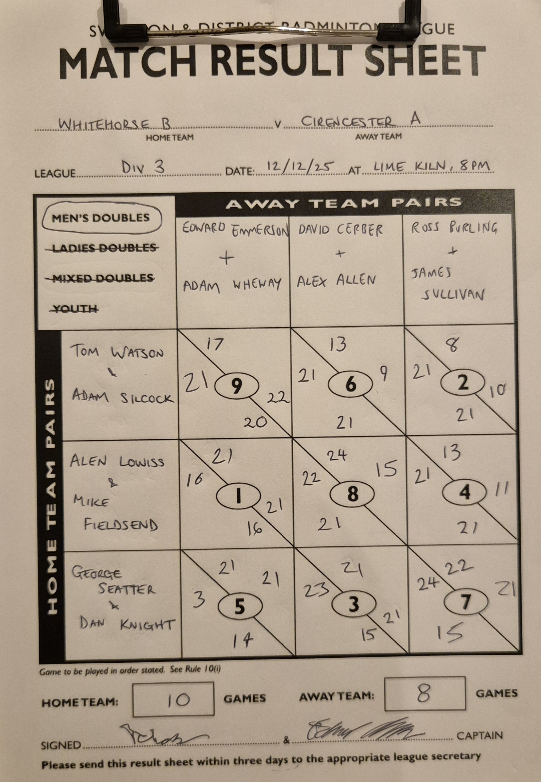 | 12-12-2025 | 20:00 | Friday | Whitehorse B | Cirencester A | Lime Kiln Leisure Centre, Royal Wootton Bassett, Swindon, SN4 7HG | 10 - 8 | |