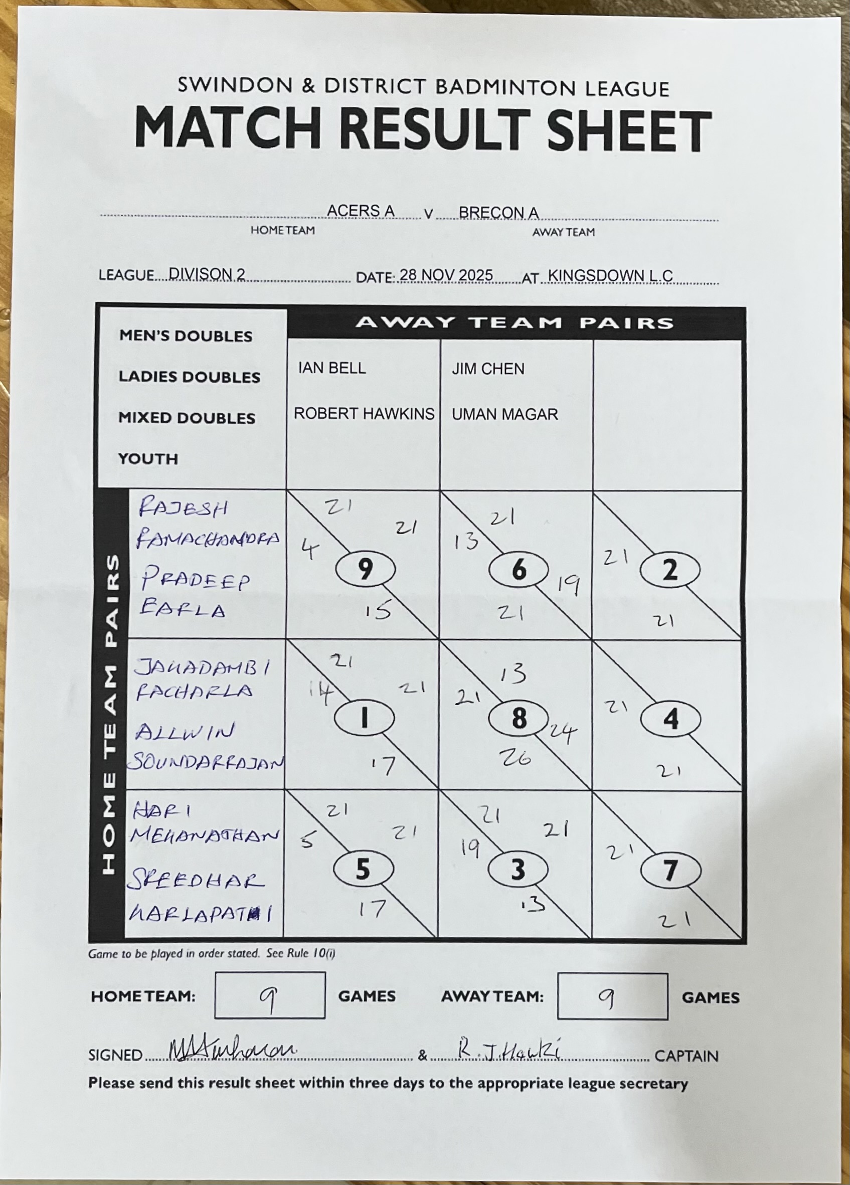 | 28-11-2025 | 19:00 | Friday | Acers A | Brecon A | Kingsdown Sports Centre, Hyde Rd, Swindon, SN2 7SH | 9 - 9 | |