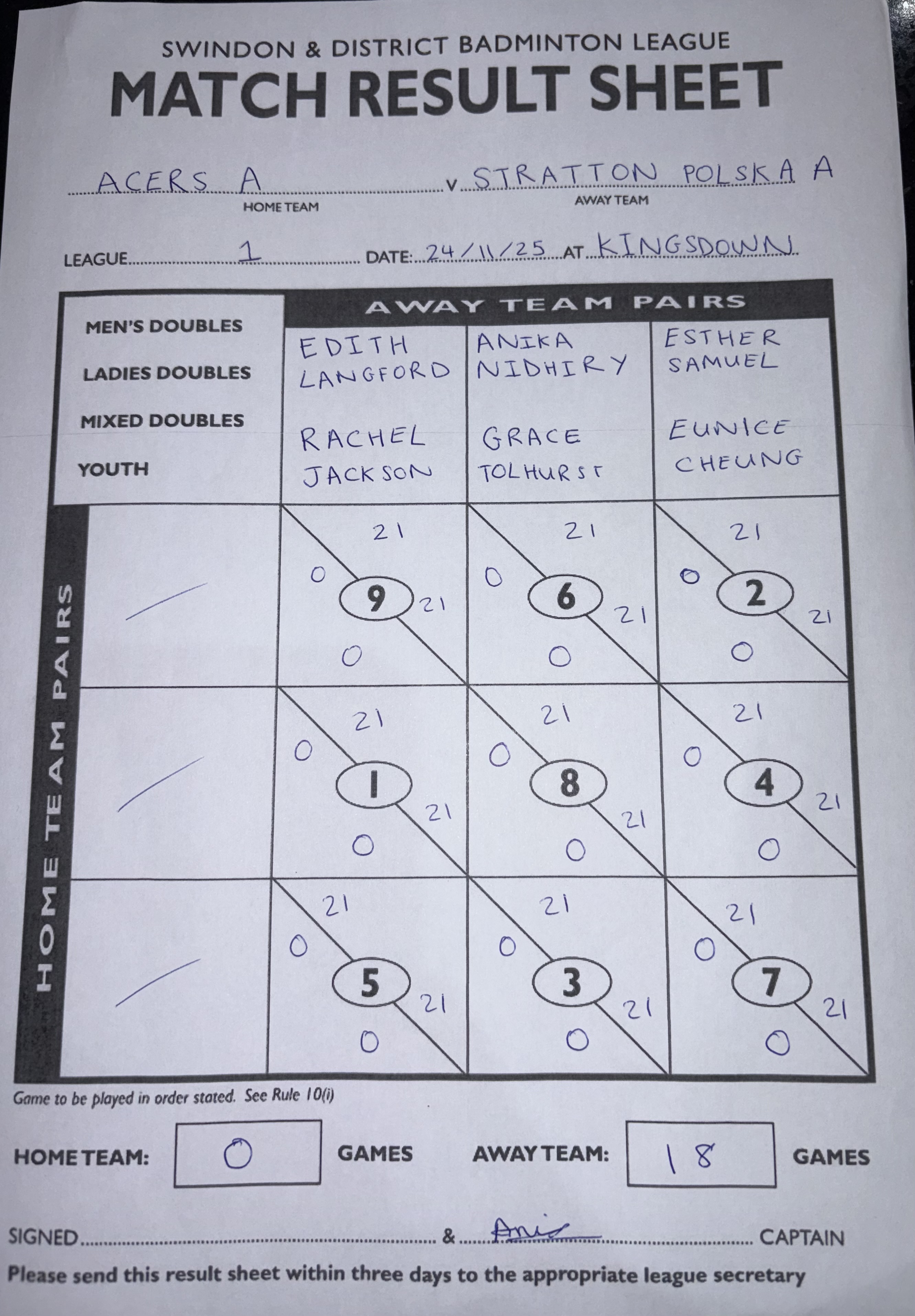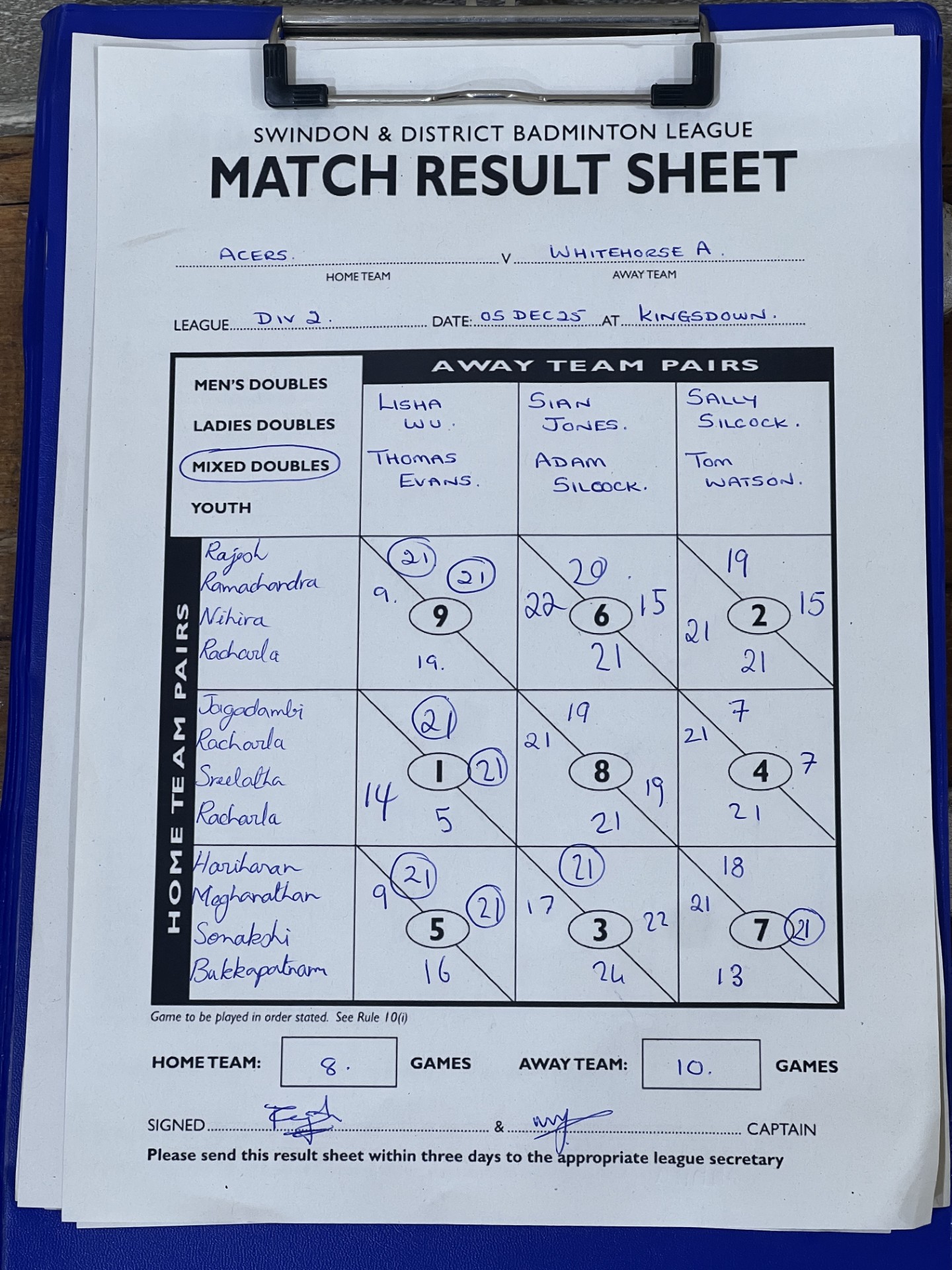 | 05-12-2025 | 19:00 | Friday | Acers A | Whitehorse A | Kingsdown Sports Centre, Hyde Rd, Swindon, SN2 7SH | 10 - 8 | |