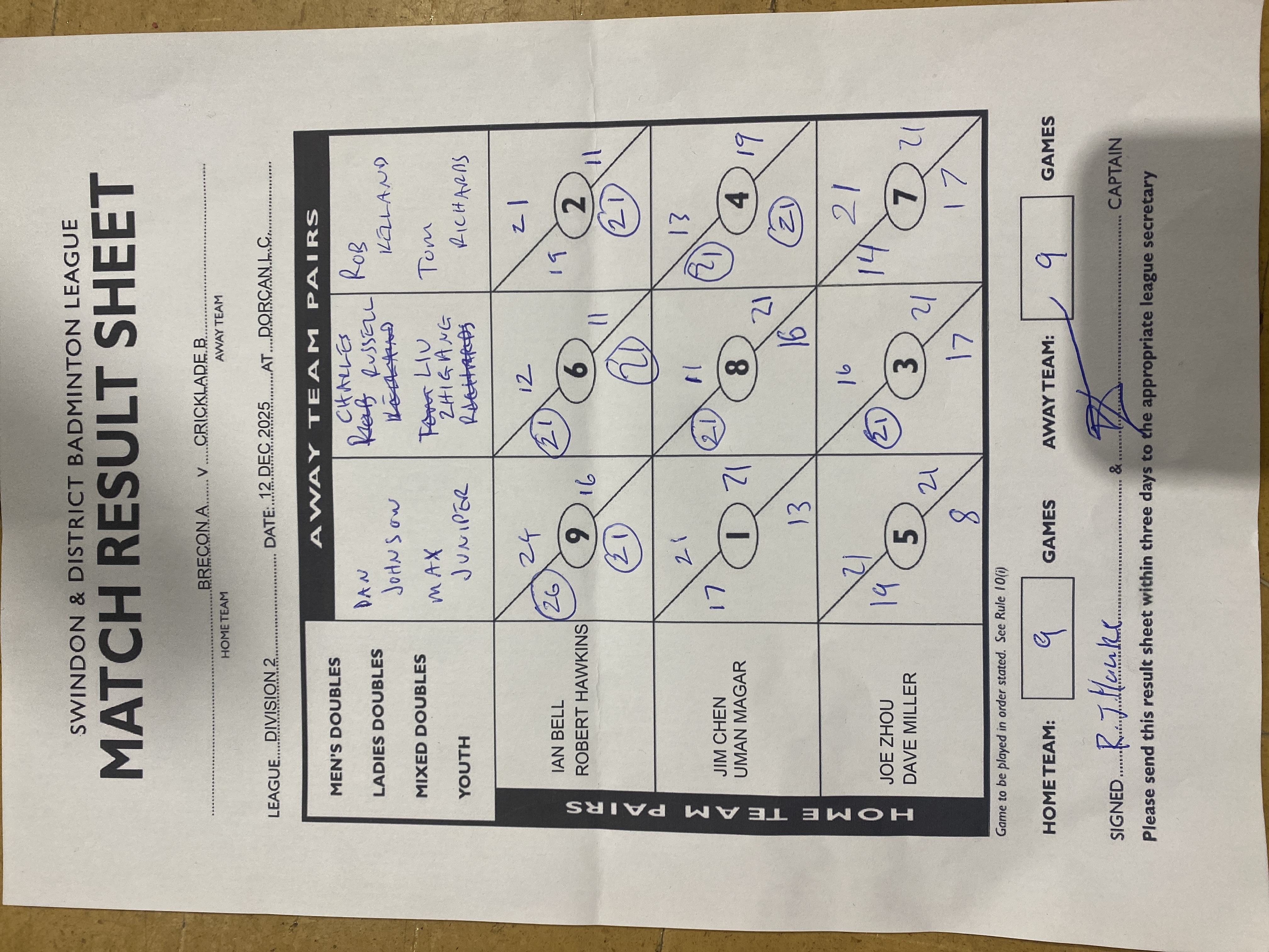 | 12-12-2025 | 19:30 | Friday | Brecon A | Cricklade B | Dorcan Sports Centre, Saint Pauls Drive, Swindon, SN3 5BY | 9 - 9 | |
