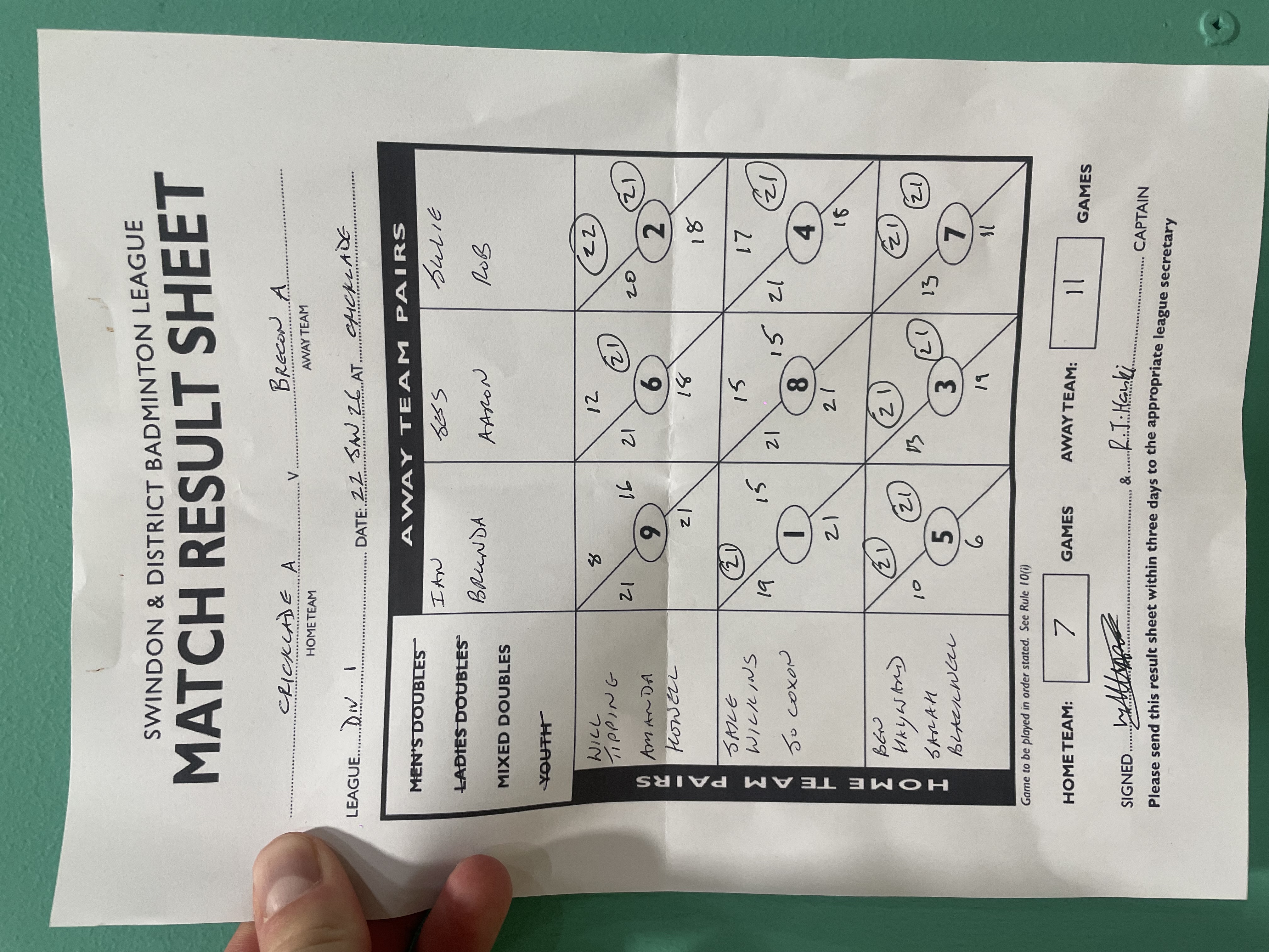 | 03-11-2025 | 19:00 | Monday | 16 Feathers B | Brecon A | Grange Leisure and Community Centre, Grange Dr, Swindon, SN3 4JY | 12 - 6 | |