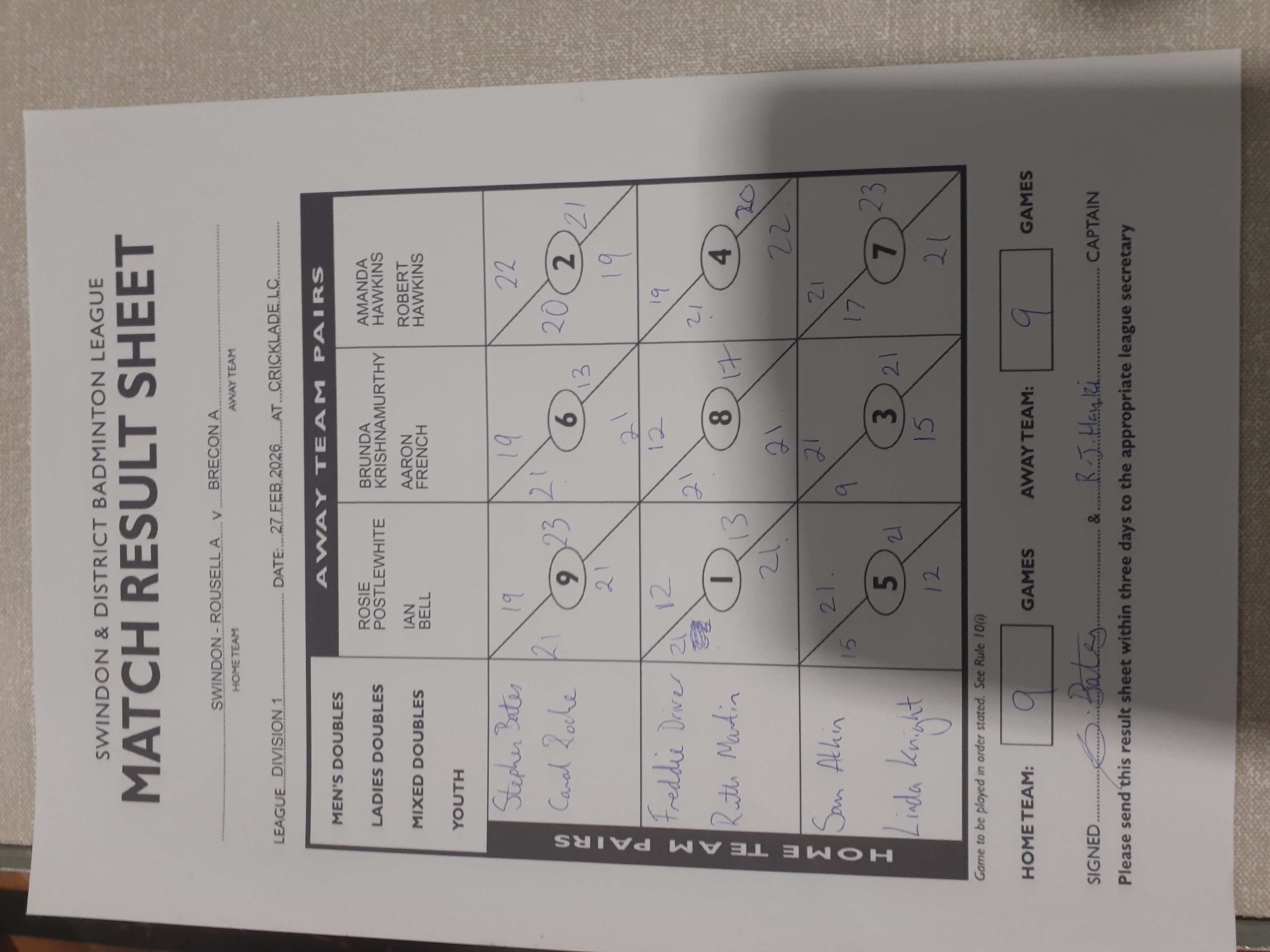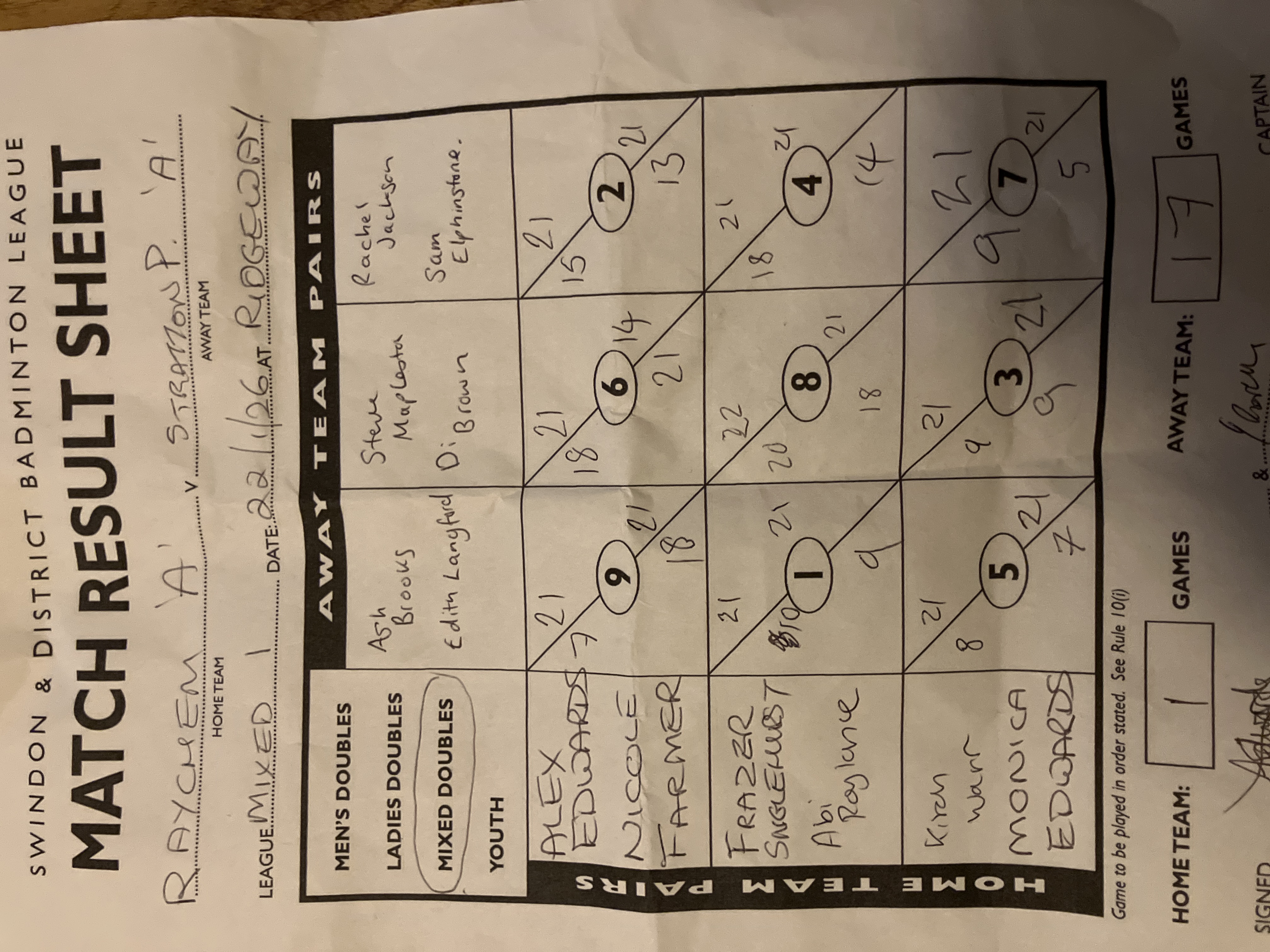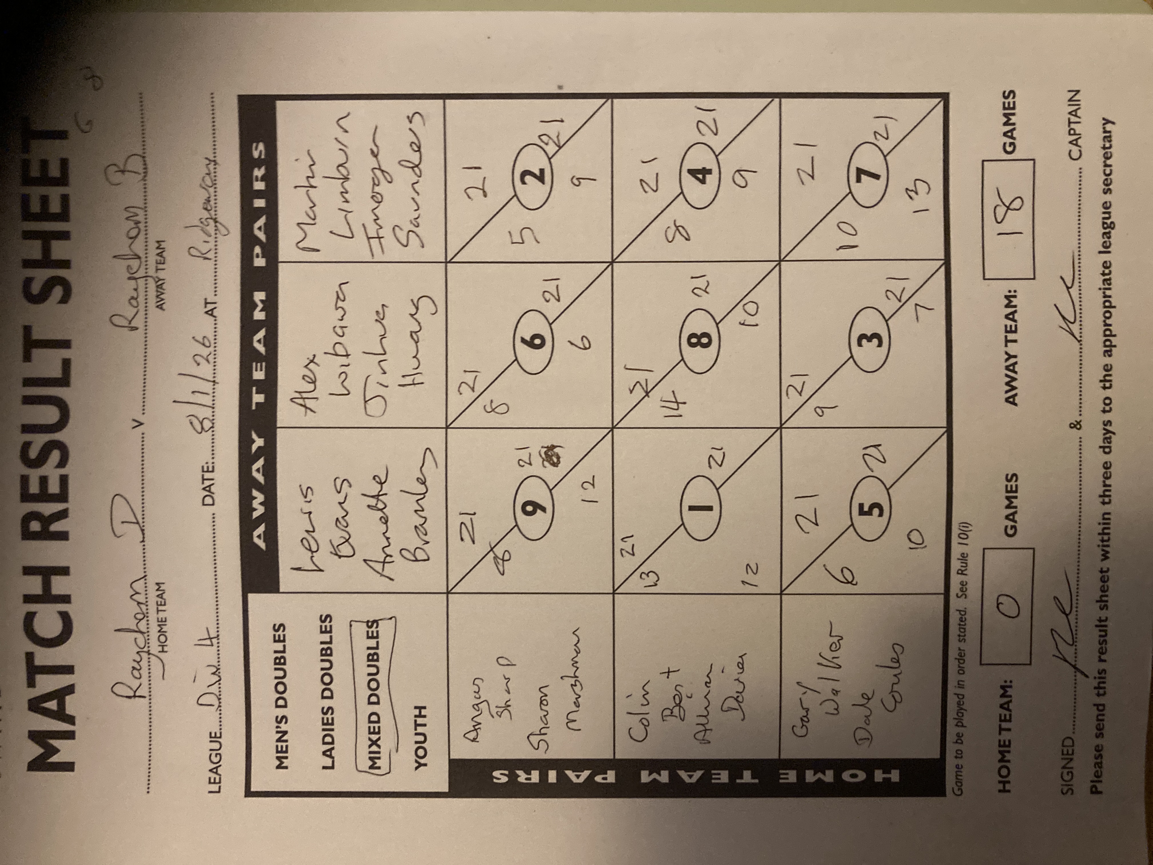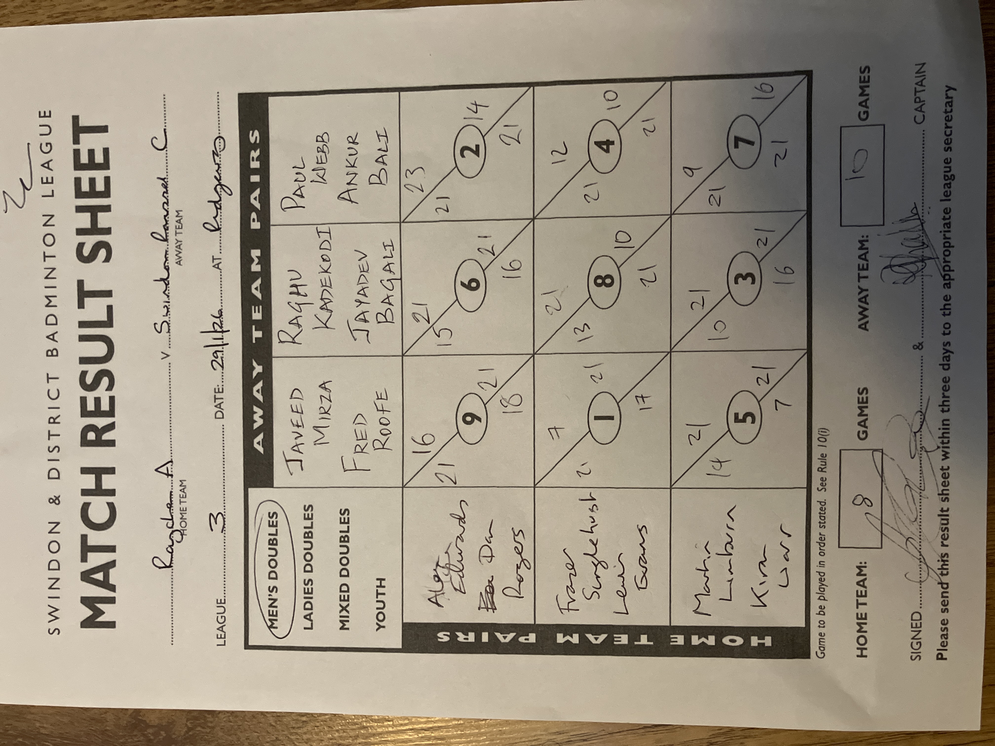 | 26-03-2026 | 20:00 | Thursday | Raychem A | Brecon B | Ridgeway Leisure Centre, Inverary Road, Wroughton, Swindon, SN4 9DJ | Upload | |