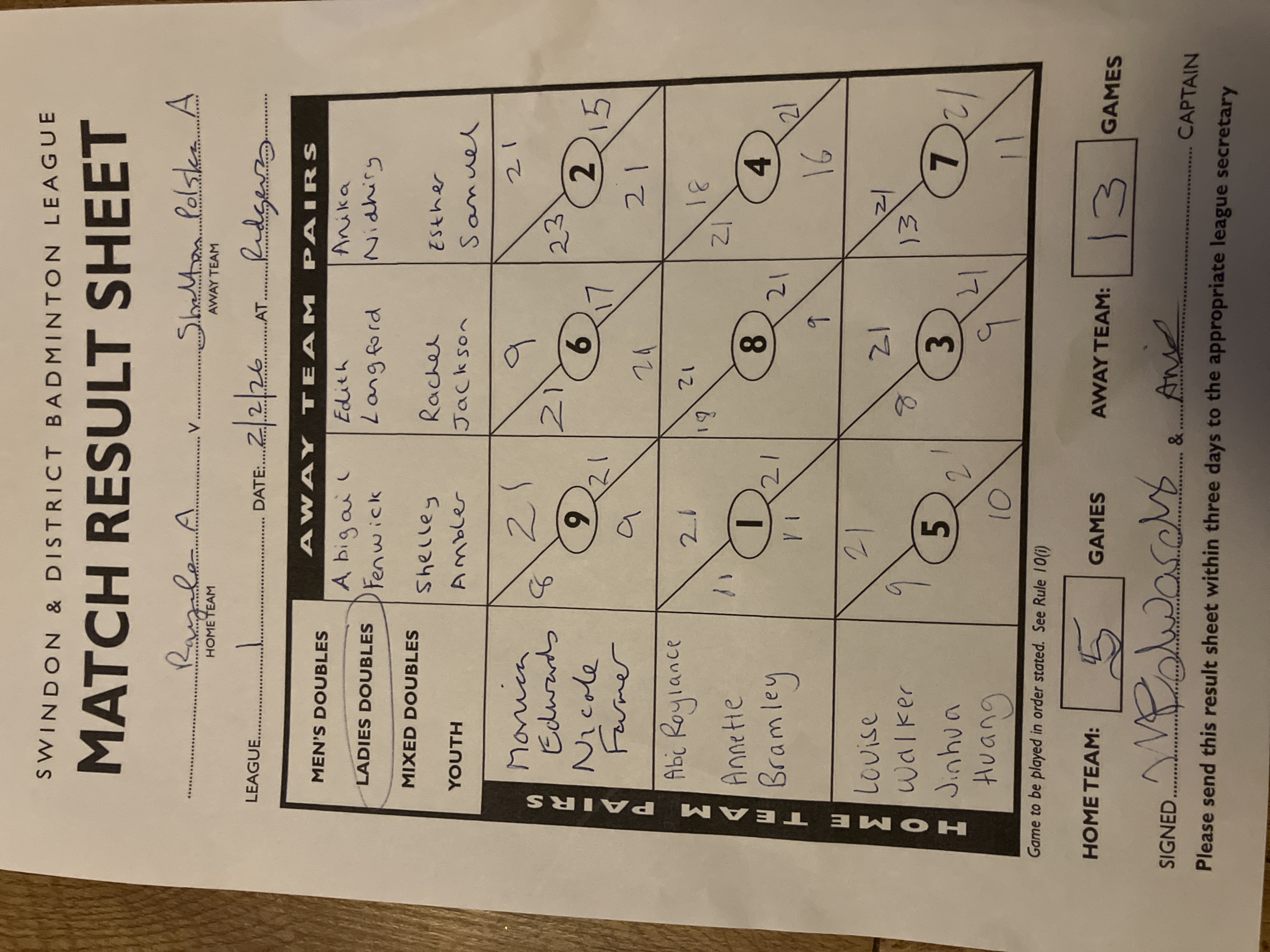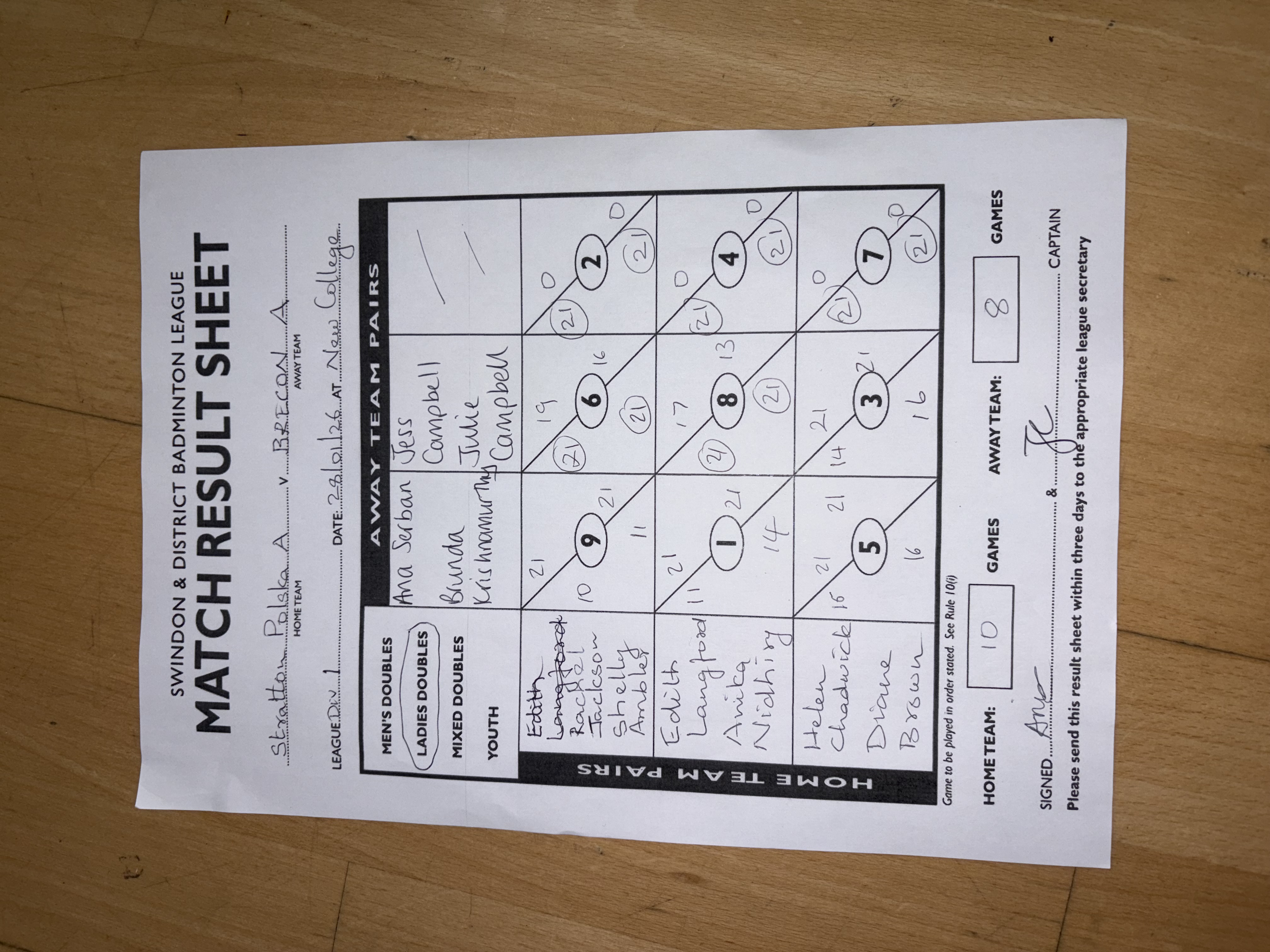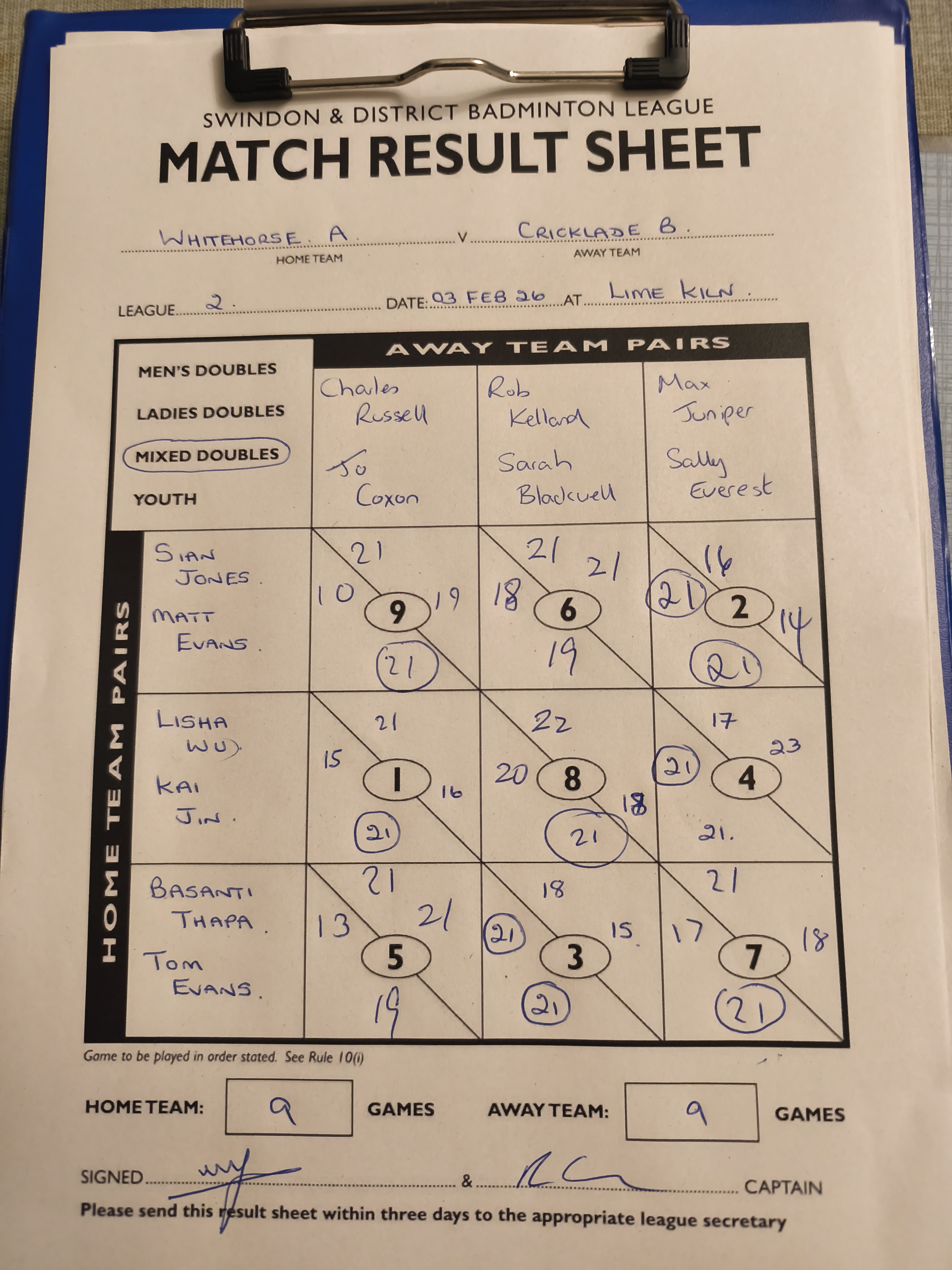 | 04-02-2026 | 20:00 | Wednesday | 16 Feathers A | Swindon-Roussel B | Lime Kiln Leisure Centre, Royal Wootton Bassett, Swindon, SN4 7HG | Upload | |