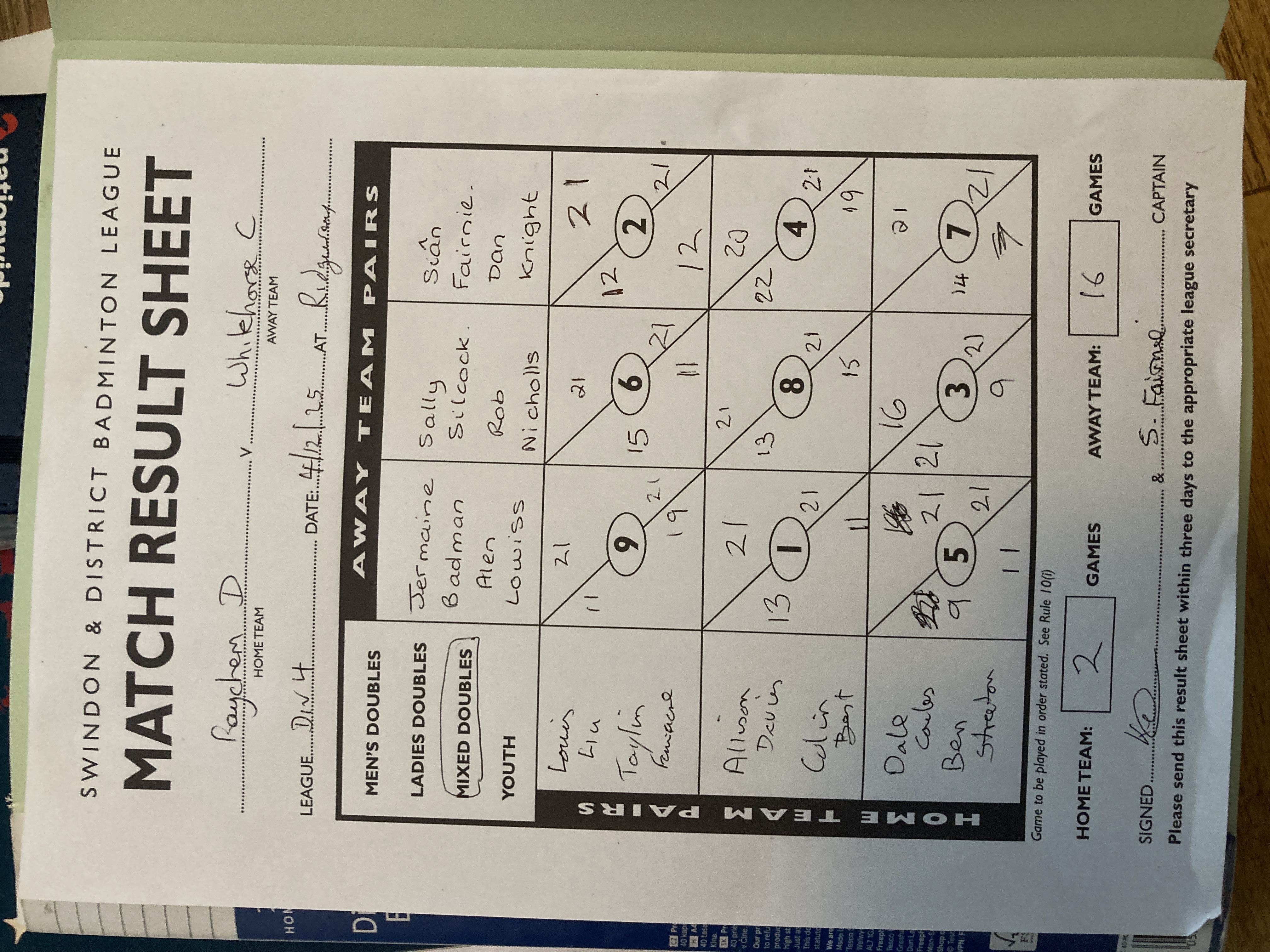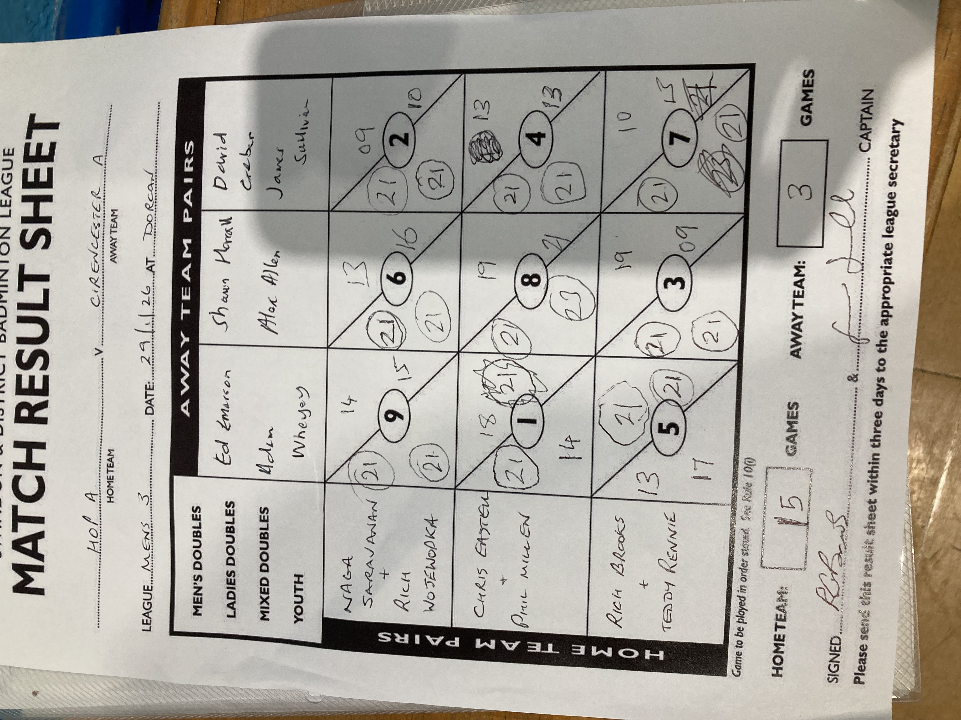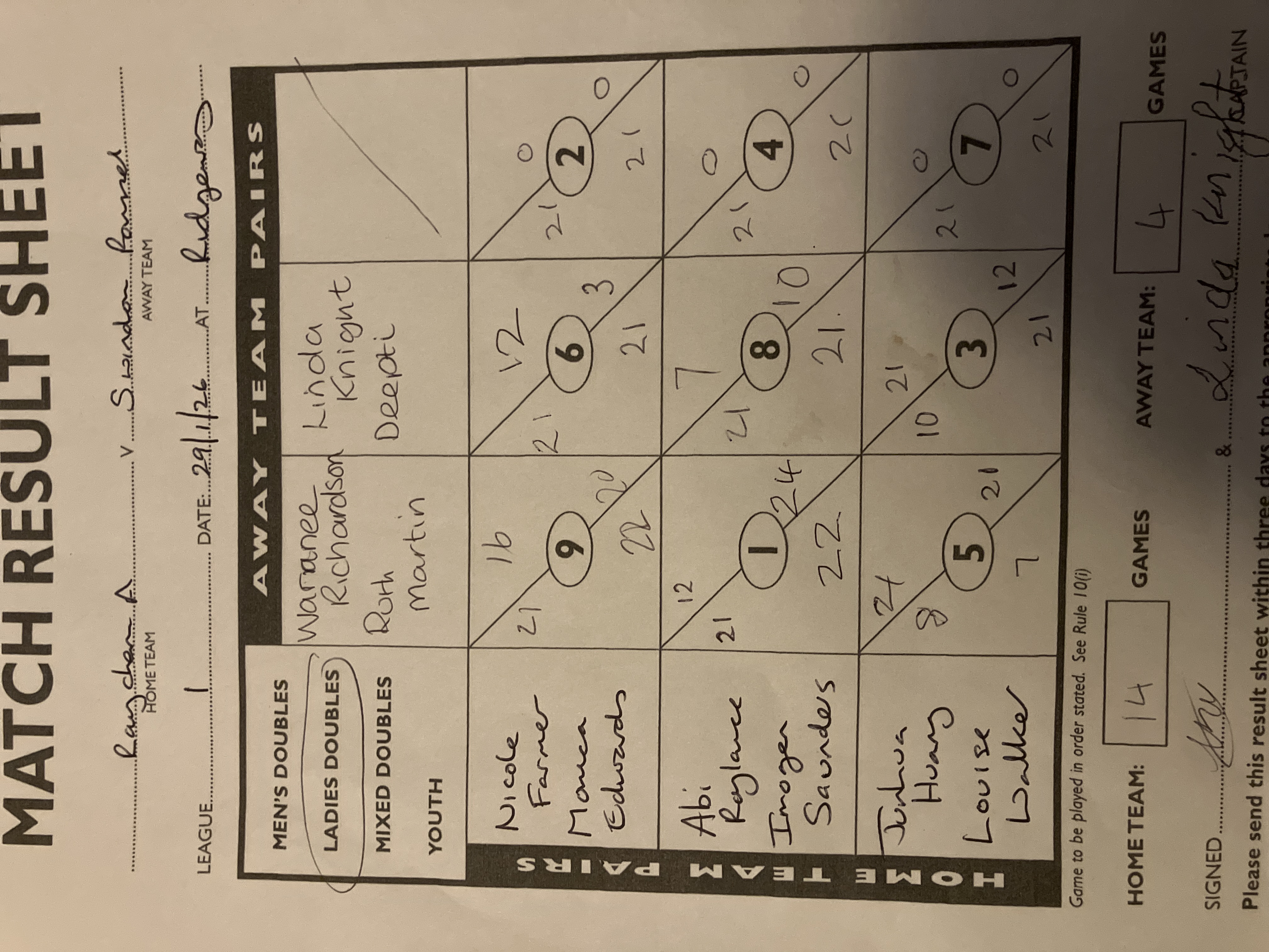 | 04-02-2026 | 20:00 | Wednesday | 16 Feathers A | Swindon-Roussel B | Lime Kiln Leisure Centre, Royal Wootton Bassett, Swindon, SN4 7HG | Upload | |