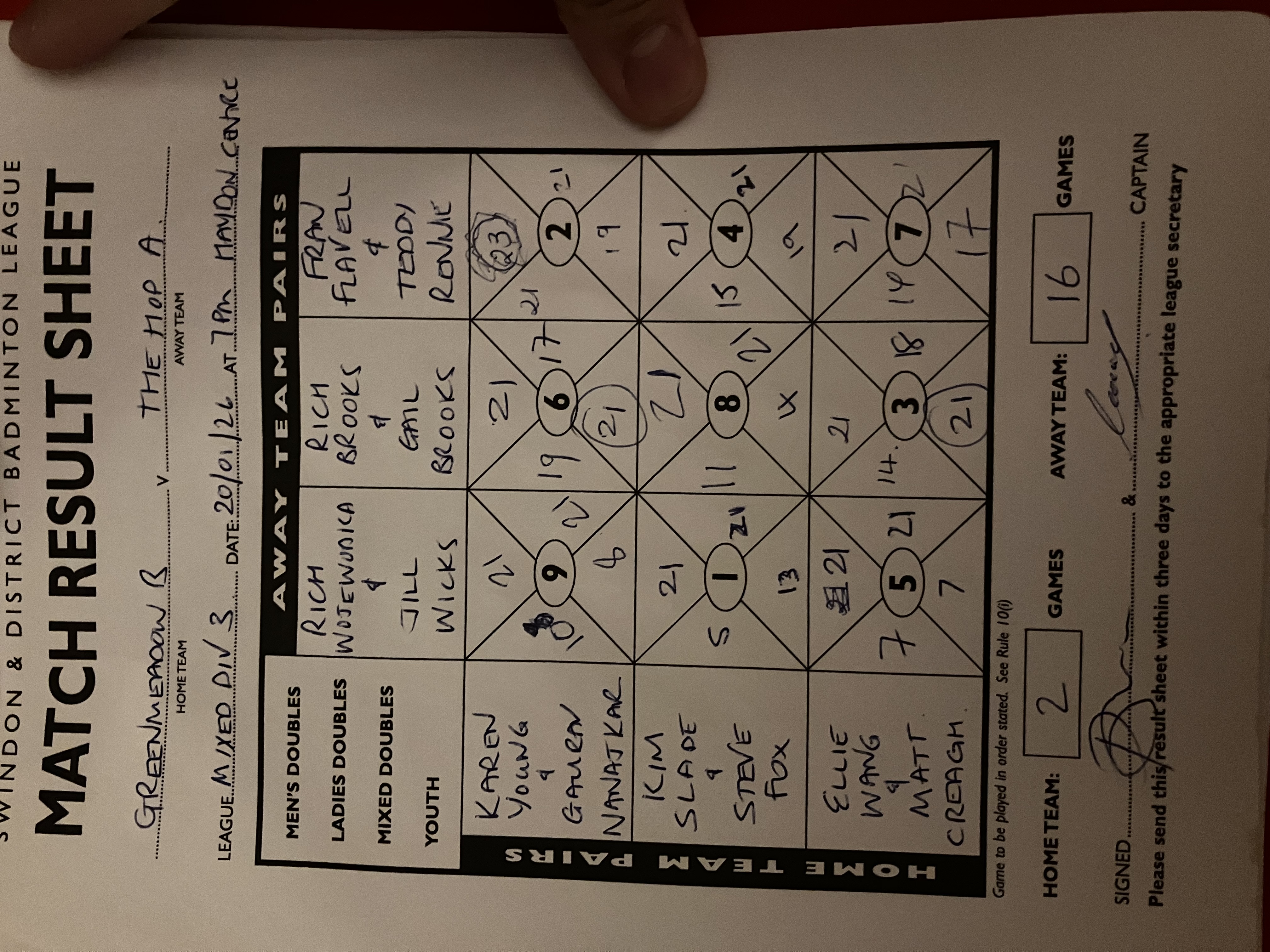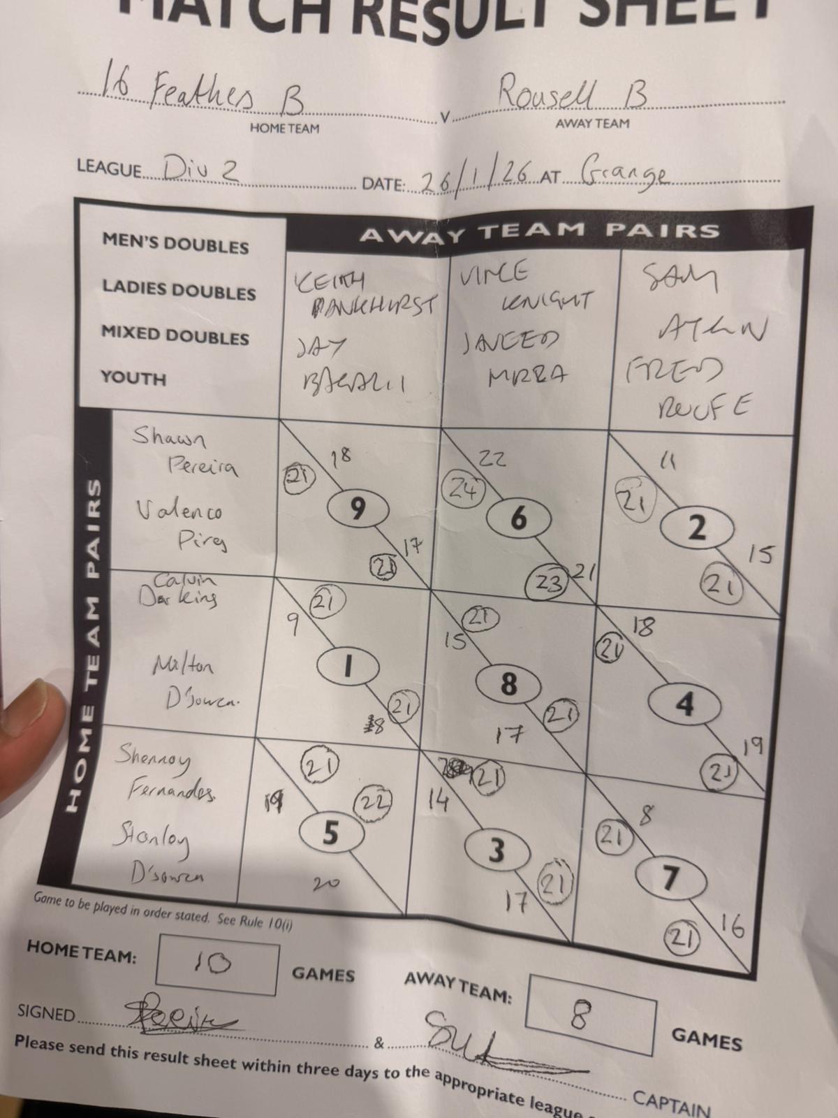 | 26-01-2026 | 19:00 | Monday | 16 Feathers B | Swindon-Roussel B | Grange Leisure and Community Centre, Grange Dr, Swindon, SN3 4JY | 10 - 8 | |