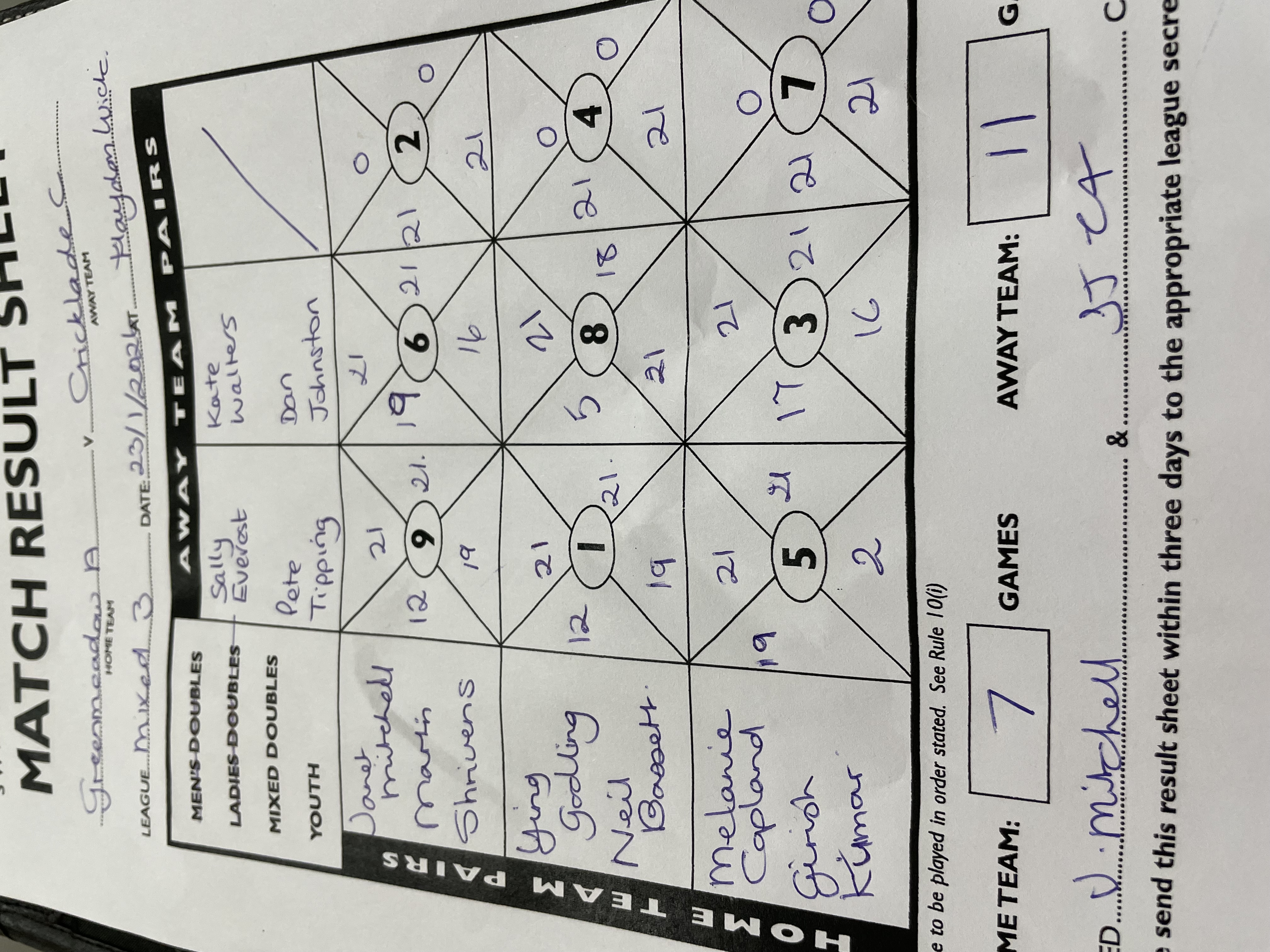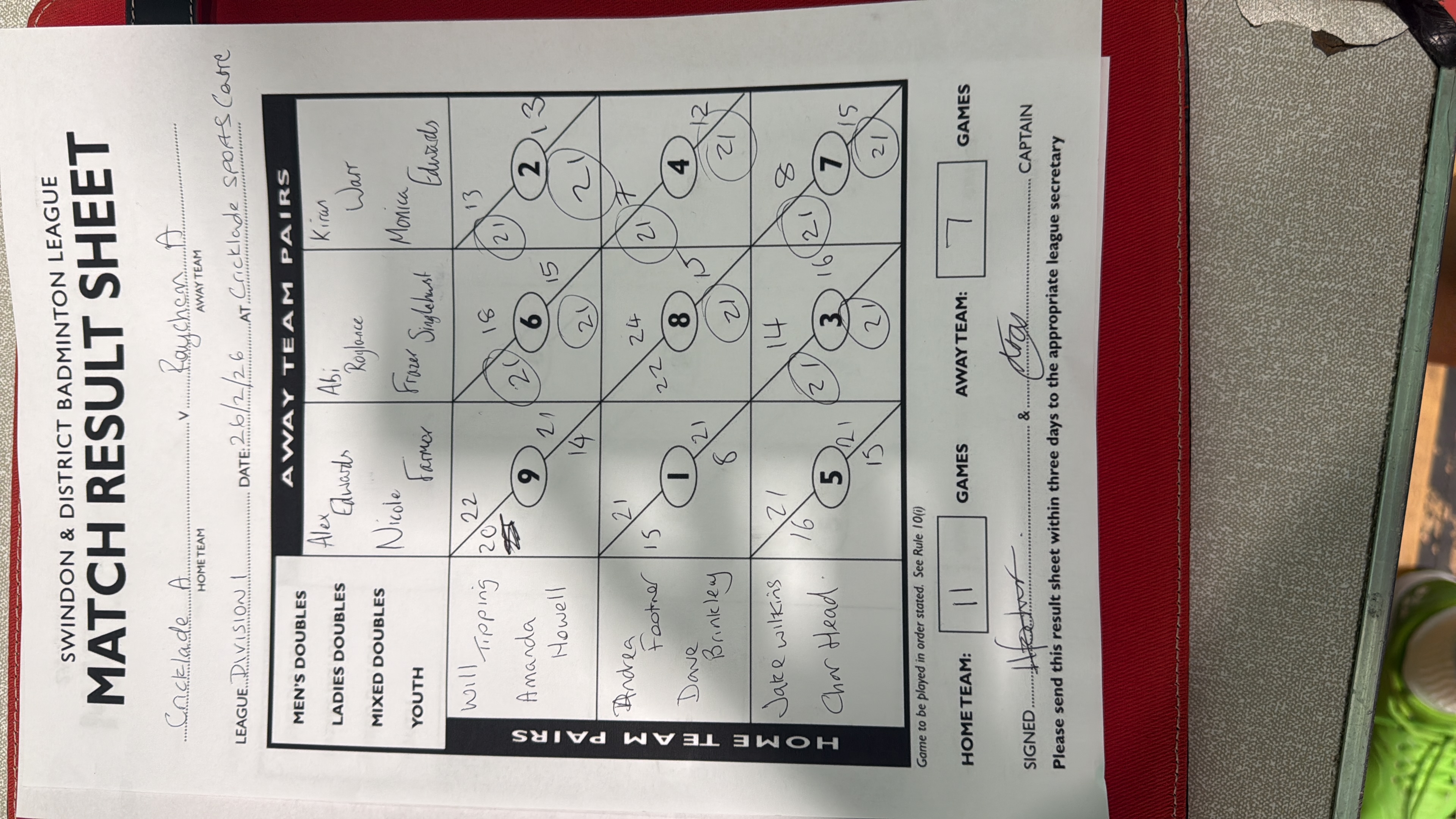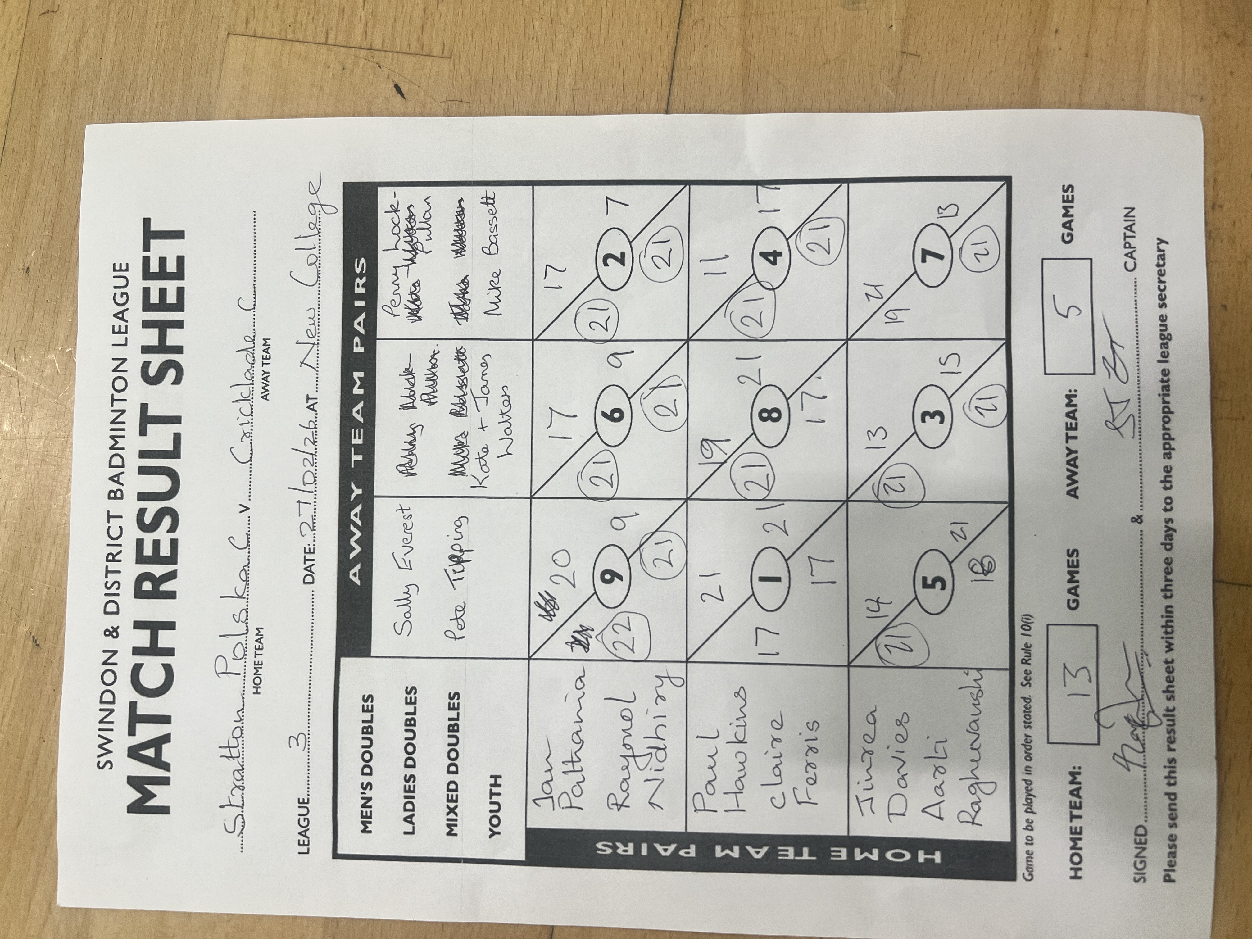 | 23-03-2026 | 19:00 | Monday | 16 Feathers B | Cricklade C | Grange Leisure and Community Centre, Grange Dr, Swindon, SN3 4JY | Upload | |