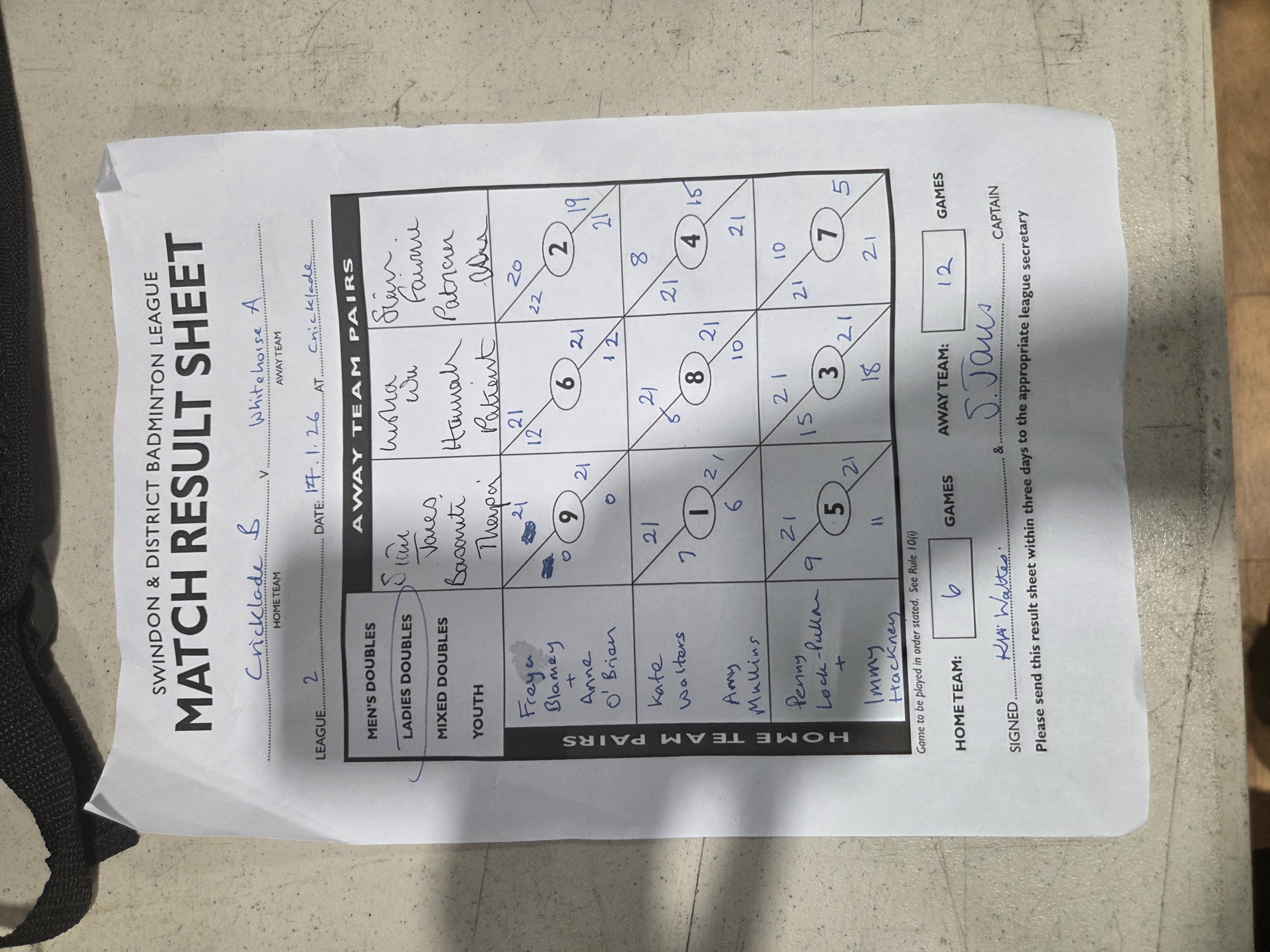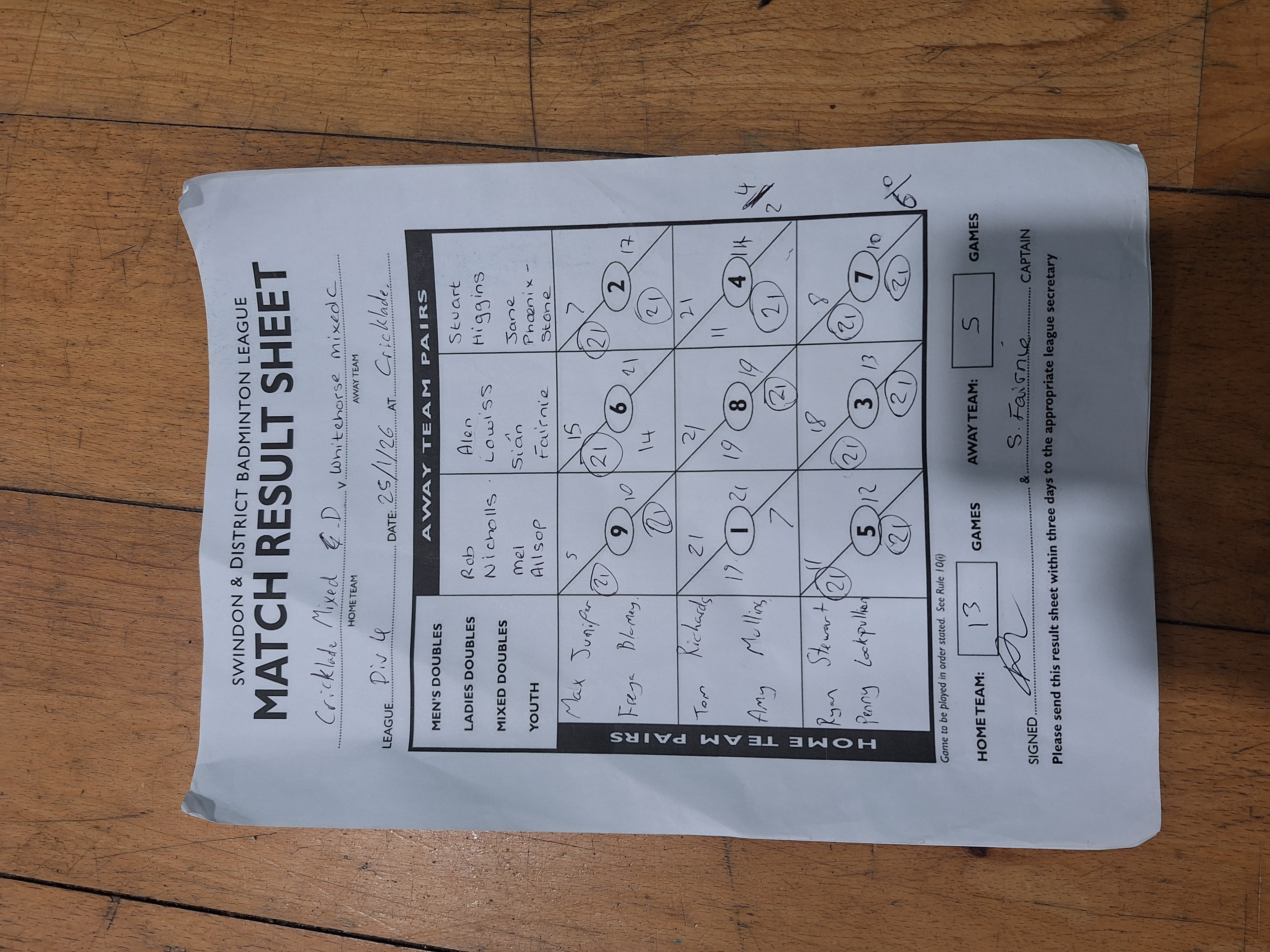 | 29-01-2026 | 20:00 | Thursday | Cricklade A | Whitehorse A | Cricklade Leisure Centre, Stones Lane, Cricklade, Swindon, Wiltshire, SN6 6JW | Upload | |