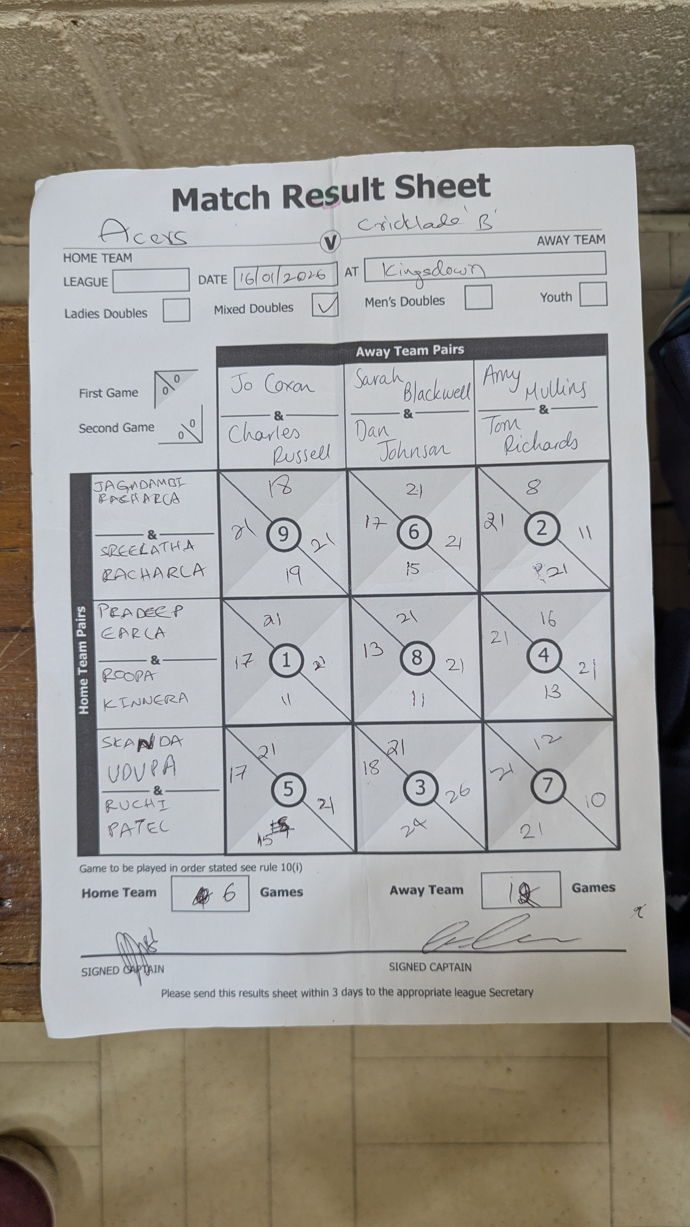 | 30-01-2026 | 19:00 | Friday | Acers A | Cricklade B | Kingsdown Sports Centre, Hyde Rd, Swindon, SN2 7SH | Upload | |