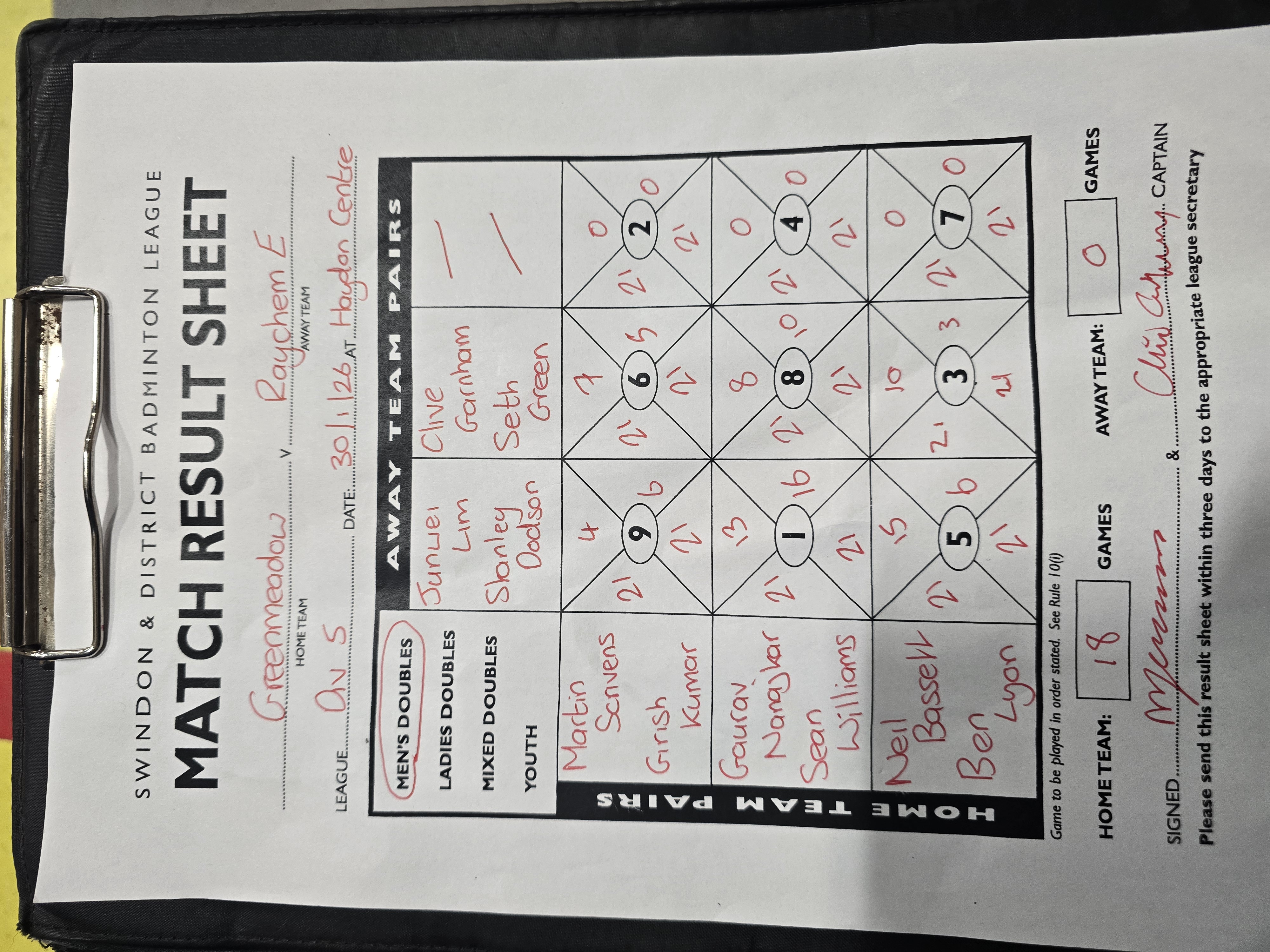 | 18-09-2025 | 20:00 | Thursday | Raychem D | Raychem C | Ridgeway Leisure Centre, Inverary Road, Wroughton, Swindon, SN4 9DJ | 6 - 12 | |