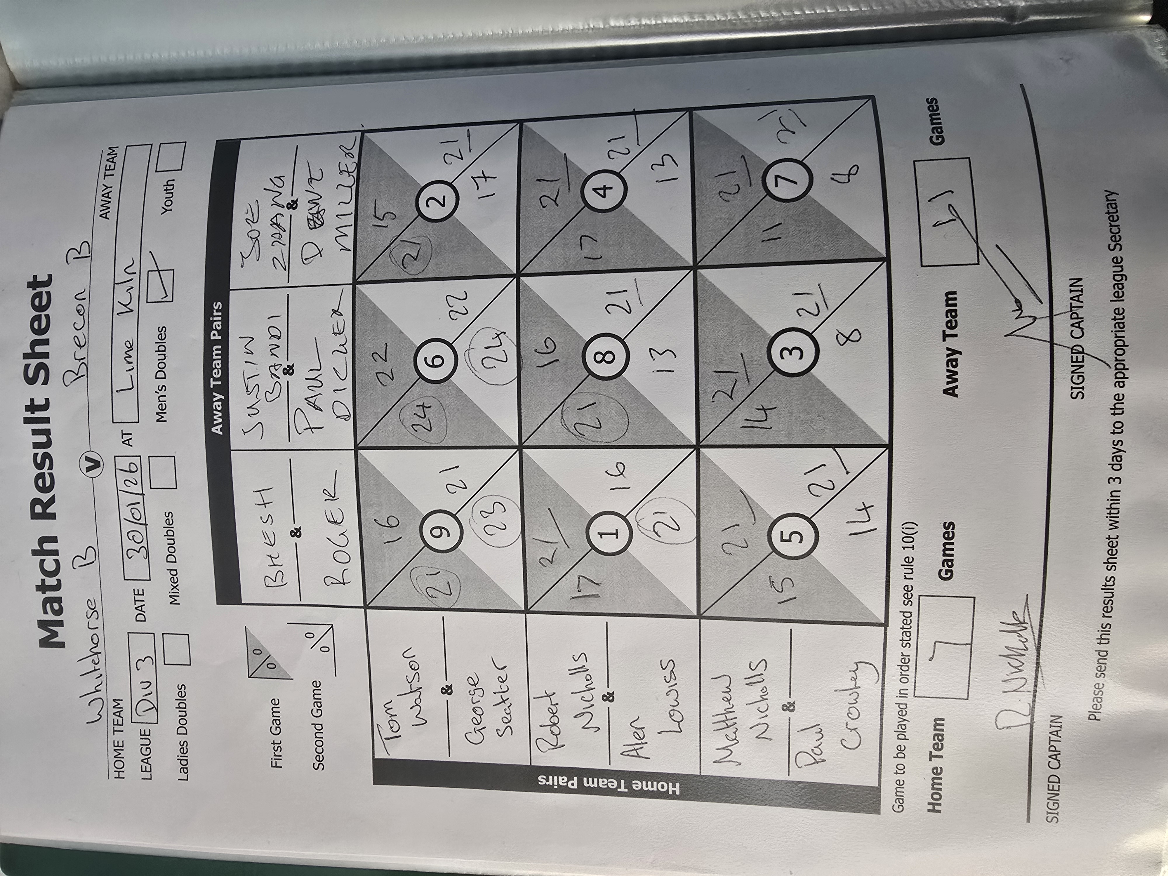 | 30-01-2026 | 20:00 | Friday | Whitehorse B | Brecon B | Lime Kiln Leisure Centre, Royal Wootton Bassett, Swindon, SN4 7HG | 7 - 11 | |