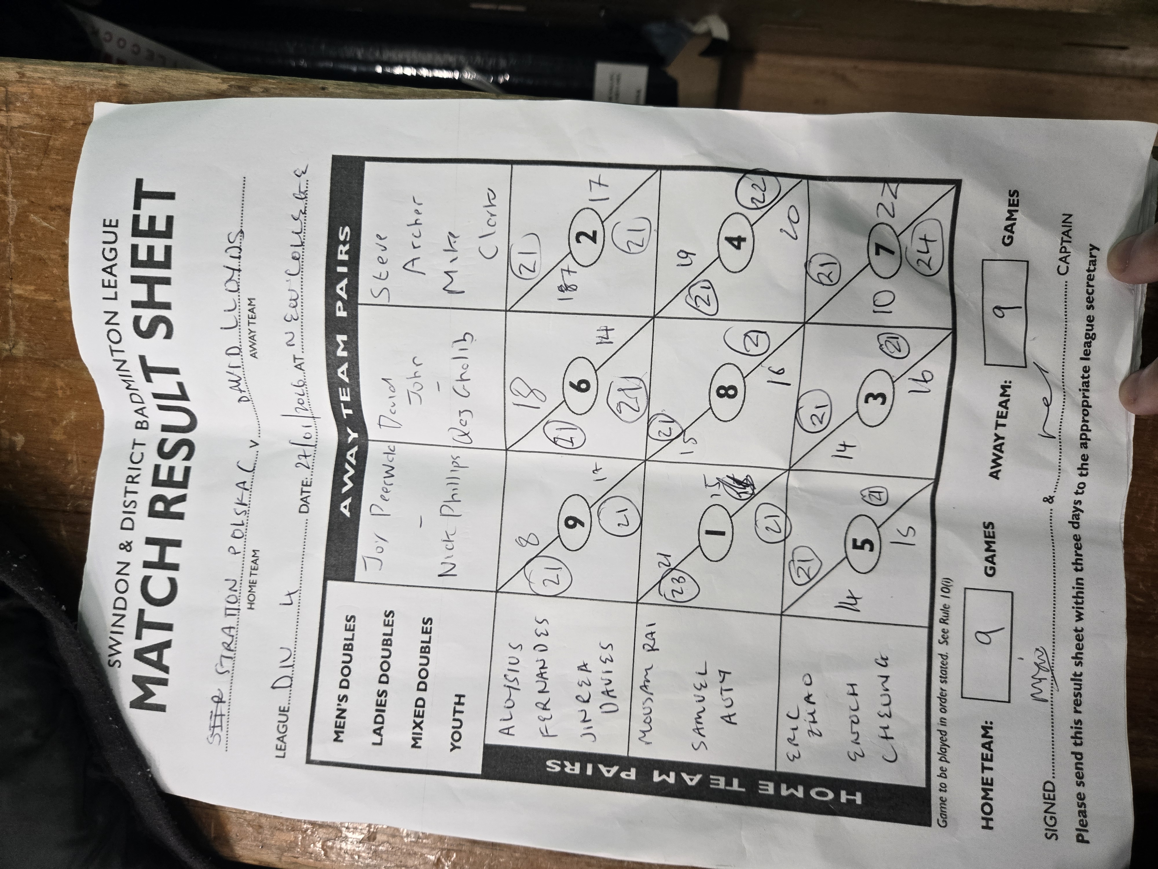 | 24-04-2026 | 19:00 | Friday | Acers A | 16 Feathers B | Kingsdown Sports Centre, Hyde Rd, Swindon, SN2 7SH | Upload | |