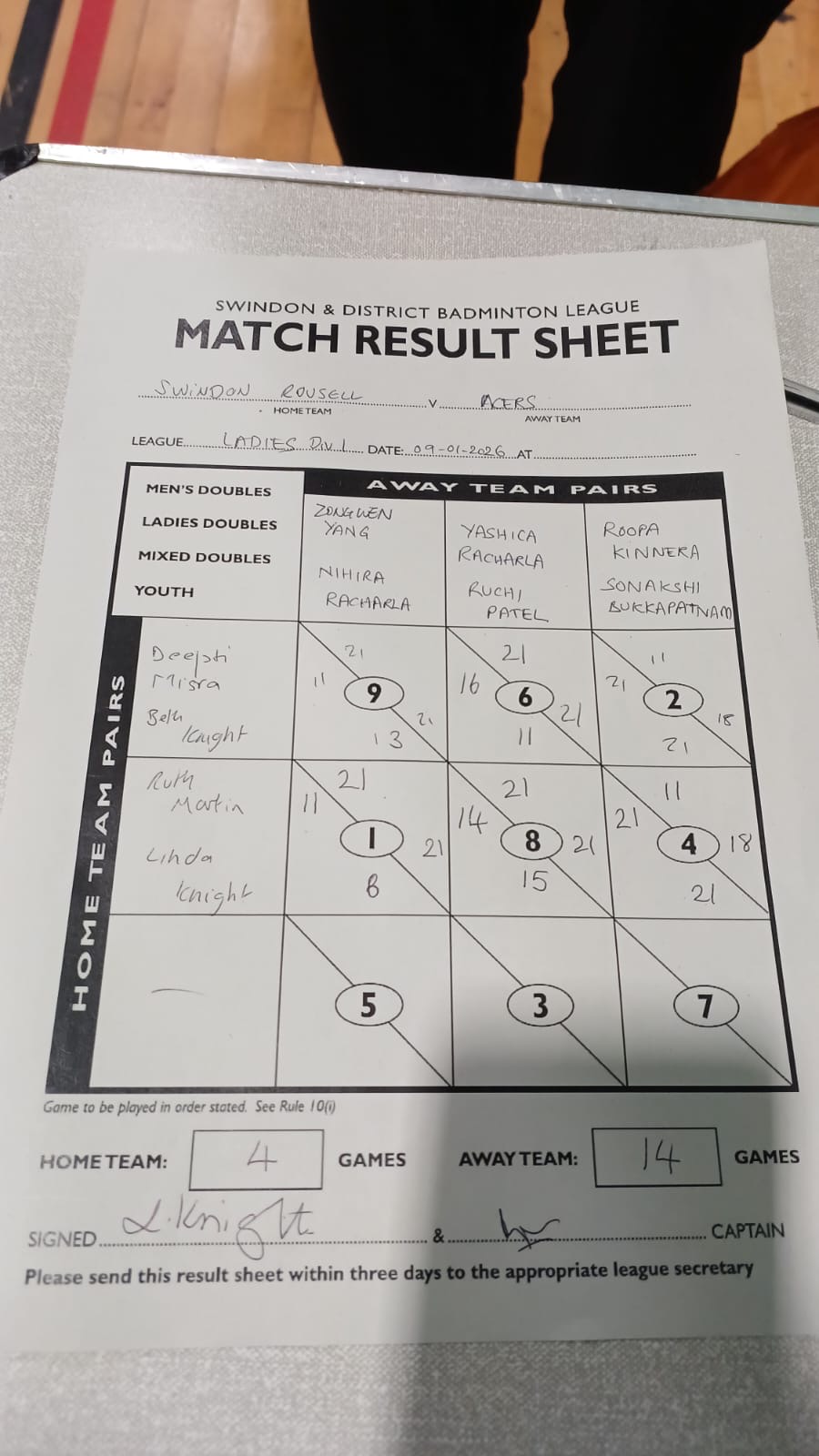 | 23-01-2026 | 19:00 | Friday | Swindon-Roussel B | Acers A | Ridgeway Leisure Centre, Inverary Road, Wroughton, Swindon, SN4 9DJ | 5 - 13 | |