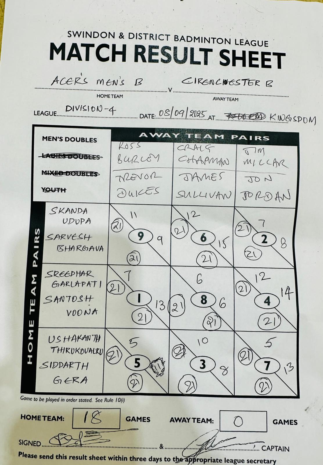 08-09-2025 | 19:00 | Monday | Acers B | Cirencester B | Kingsdown Sports Centre, Hyde Rd, Swindon, SN2 7SH | 18 - 0 | |