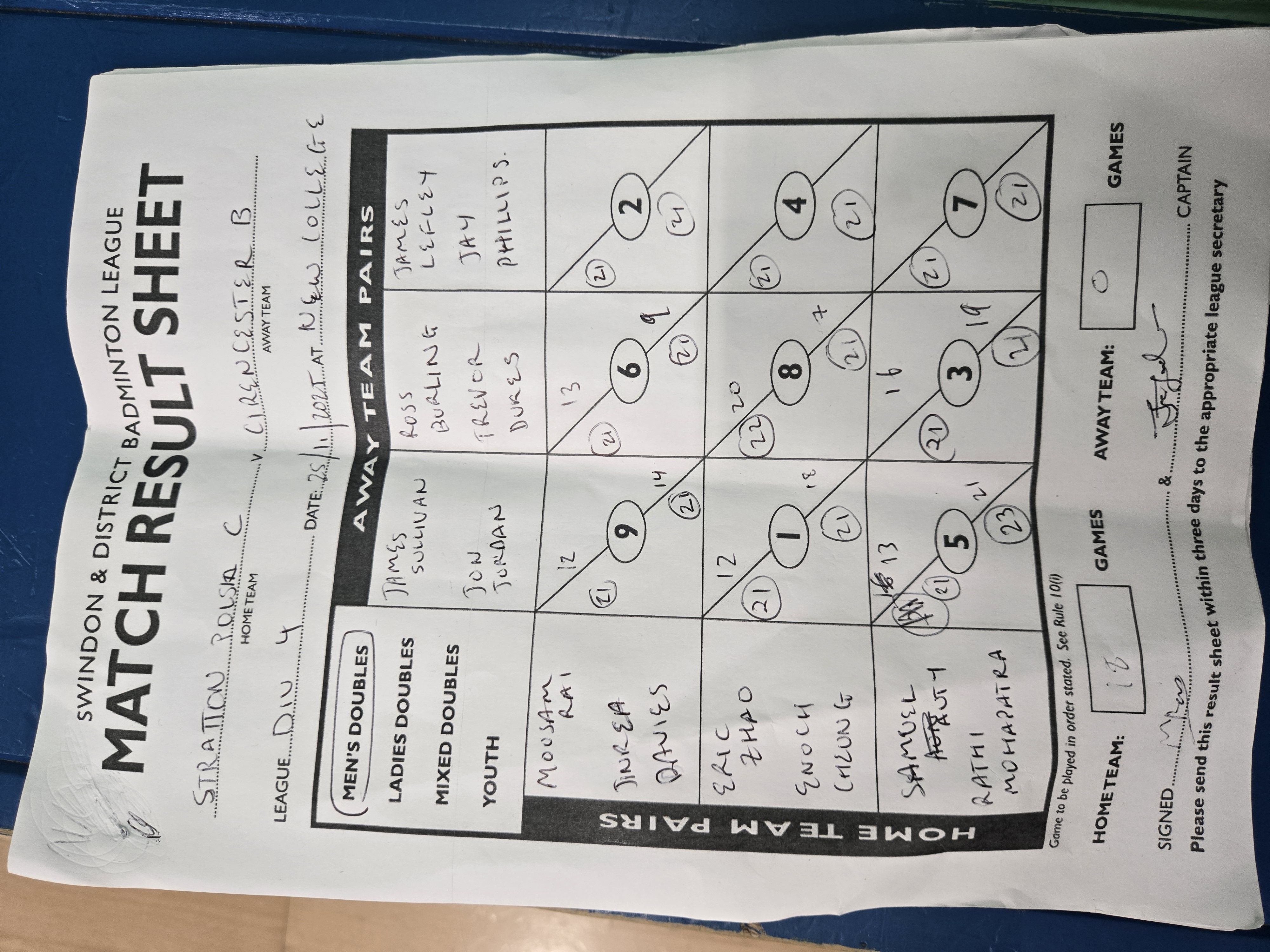 | 11-02-2026 | 19:30 | Wednesday | Cirencester A | Raychem A | Cirencester Leisure Centre, Old Tetbury Road, Cirencester, GL7 1US | Upload | |