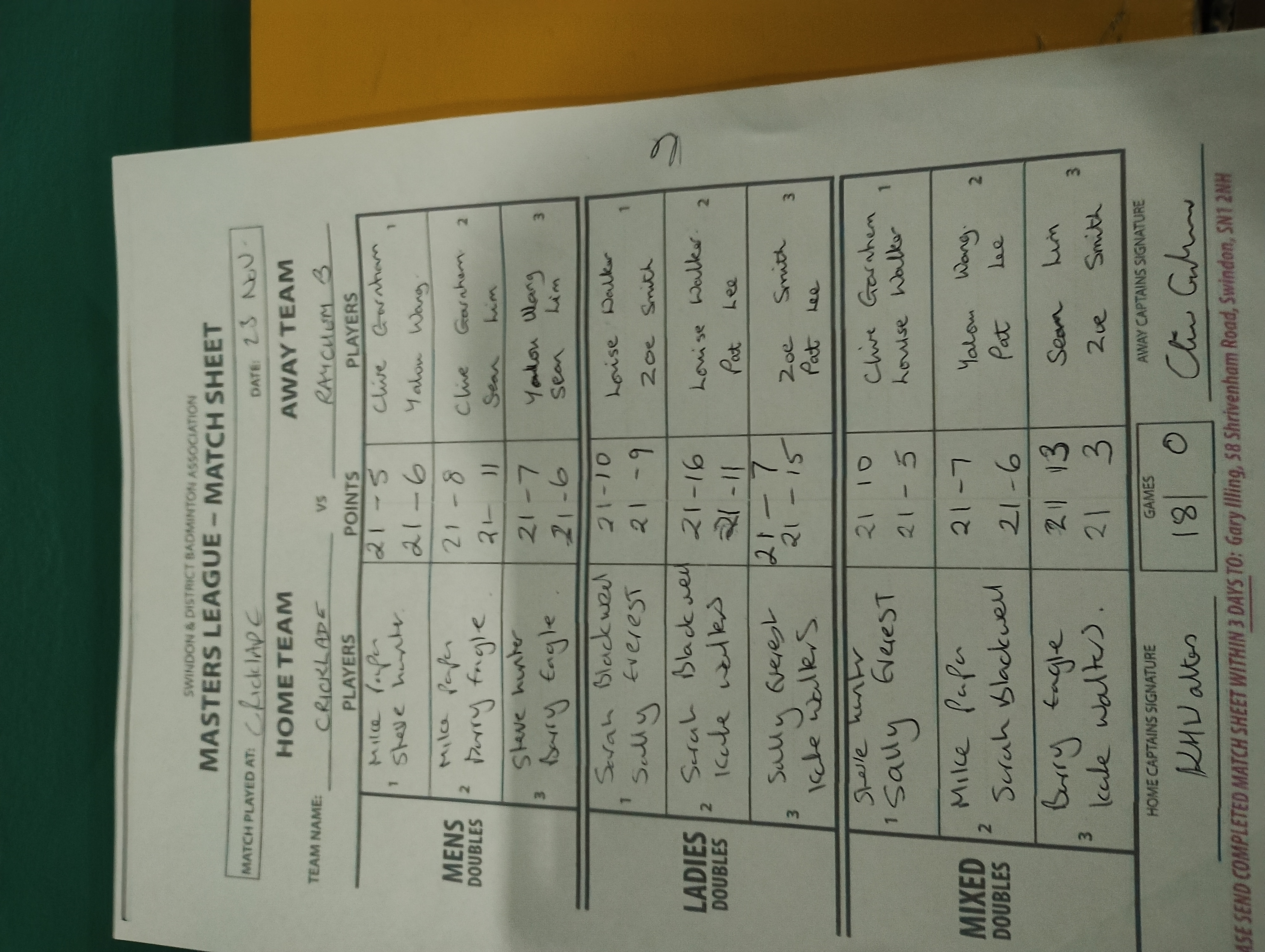 | 23-03-2026 | 19:00 | Monday | 16 Feathers B | Cricklade C | Grange Leisure and Community Centre, Grange Dr, Swindon, SN3 4JY | Upload | |