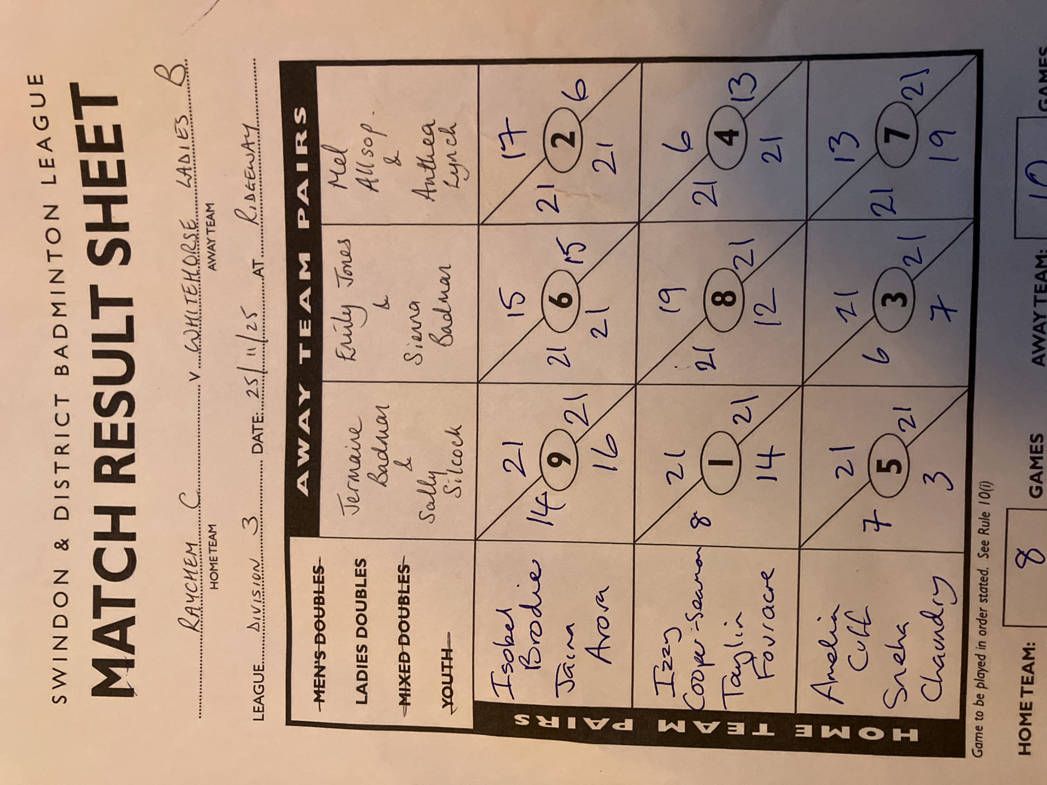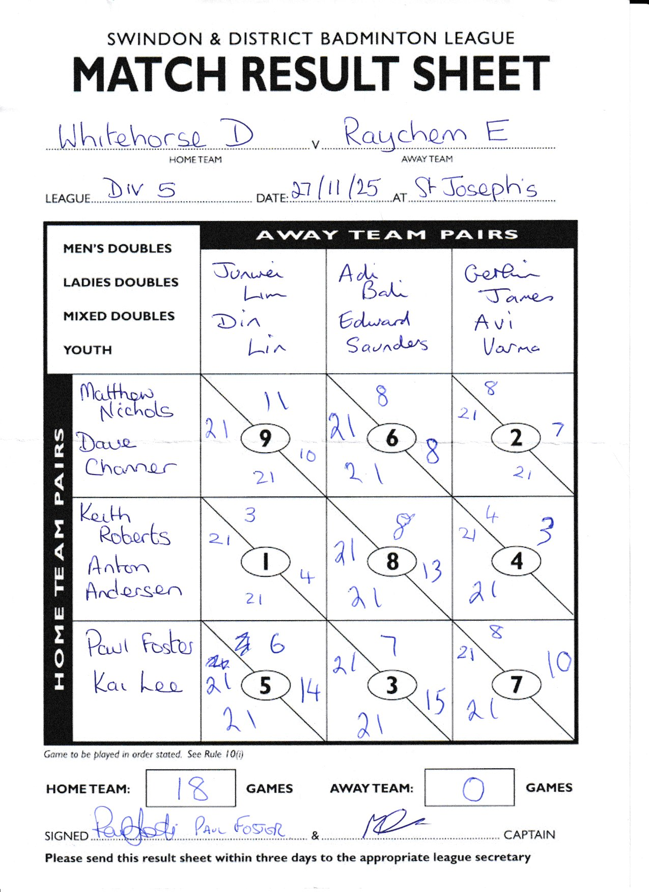 | 06-11-2025 | 20:00 | Thursday | Raychem A | Whitehorse B | Ridgeway Leisure Centre, Inverary Road, Wroughton, Swindon, SN4 9DJ | 11 - 7 | |