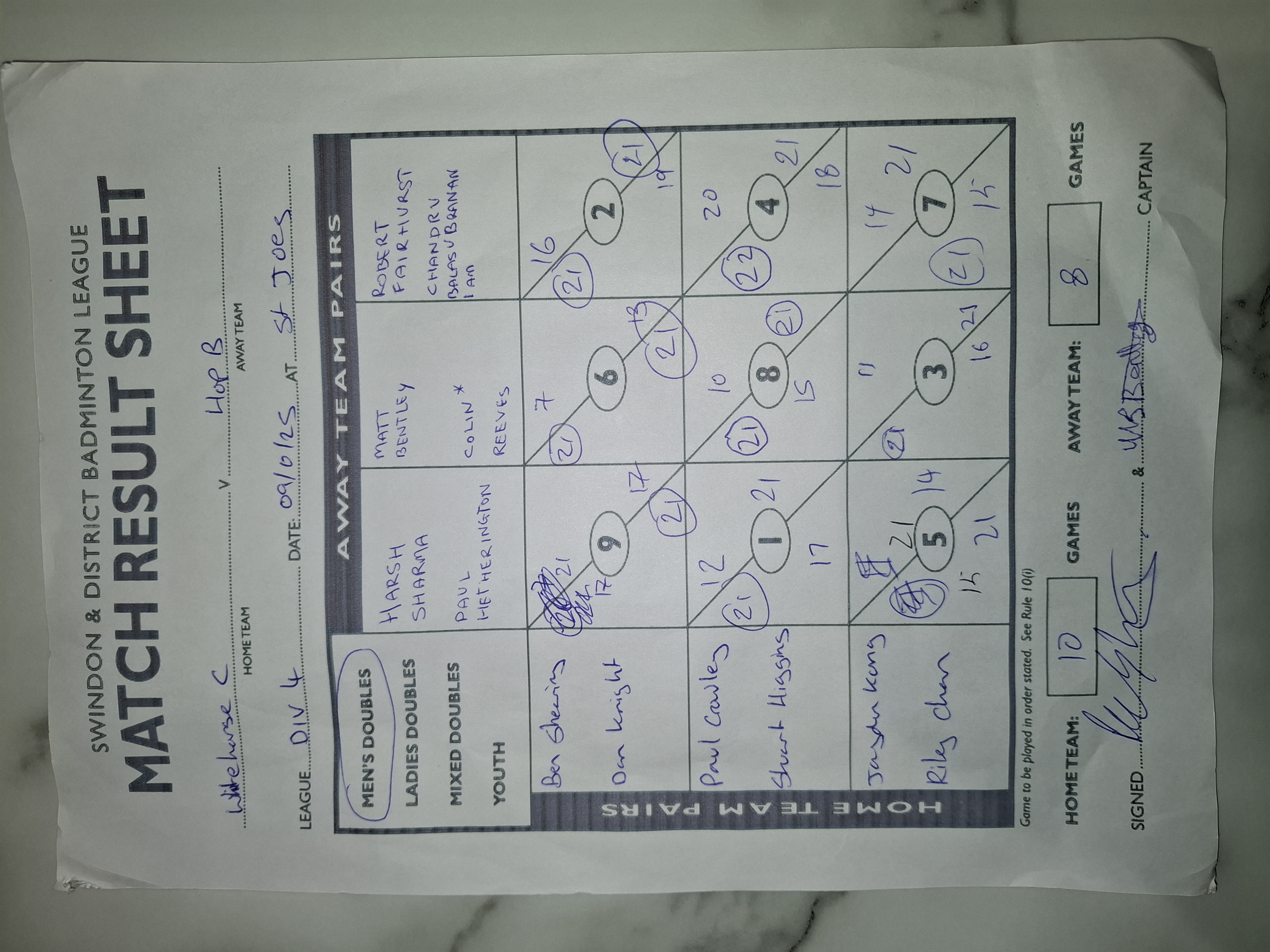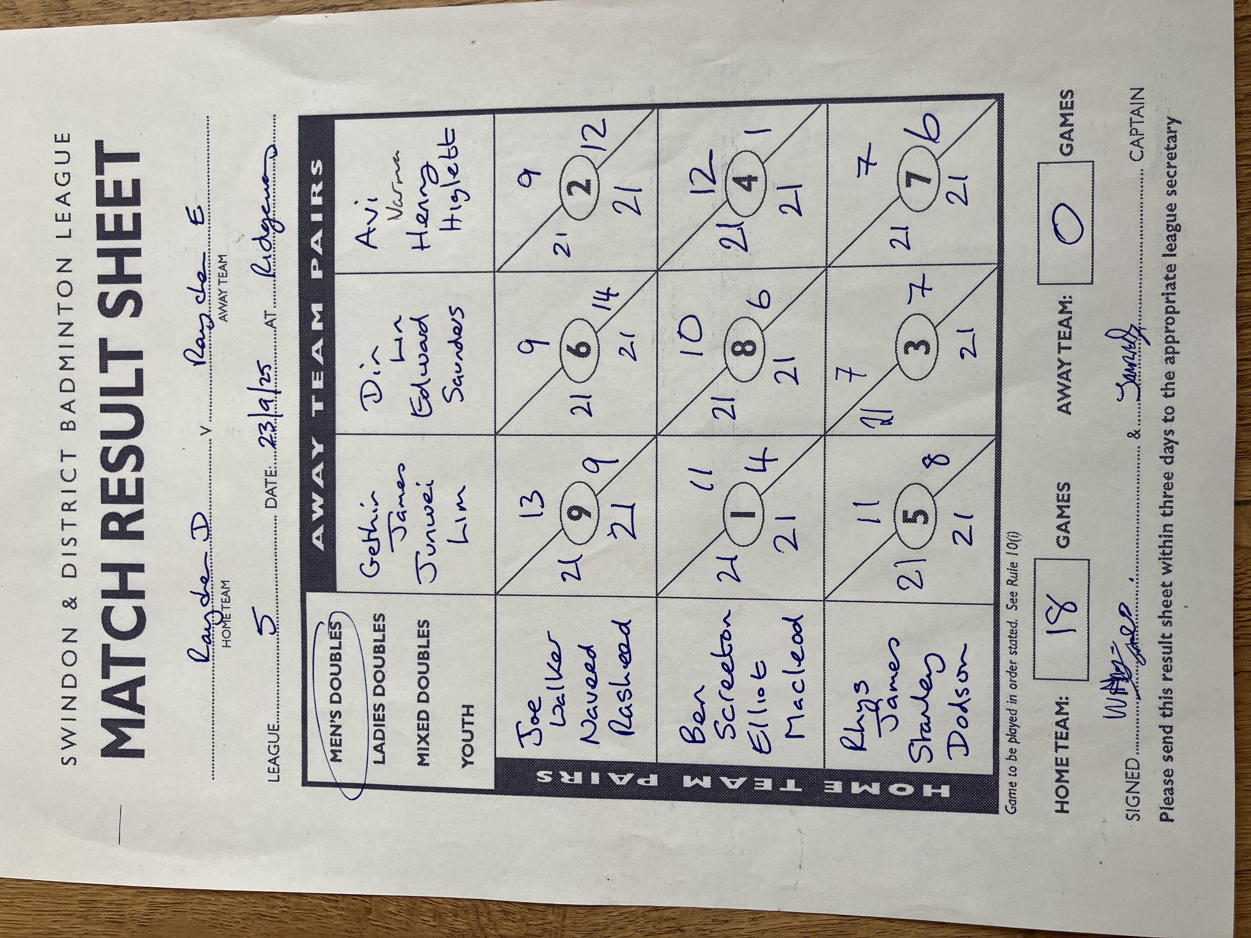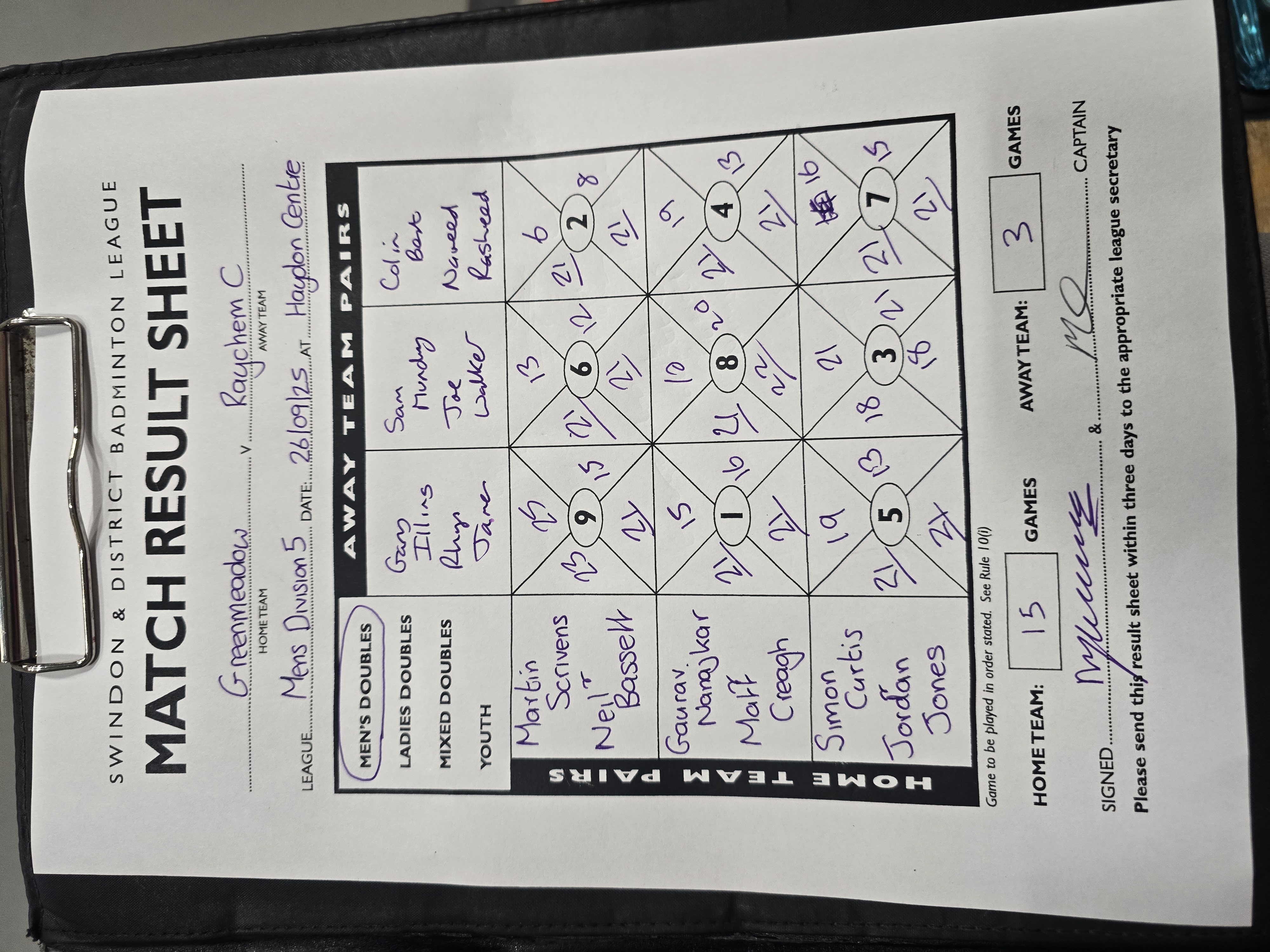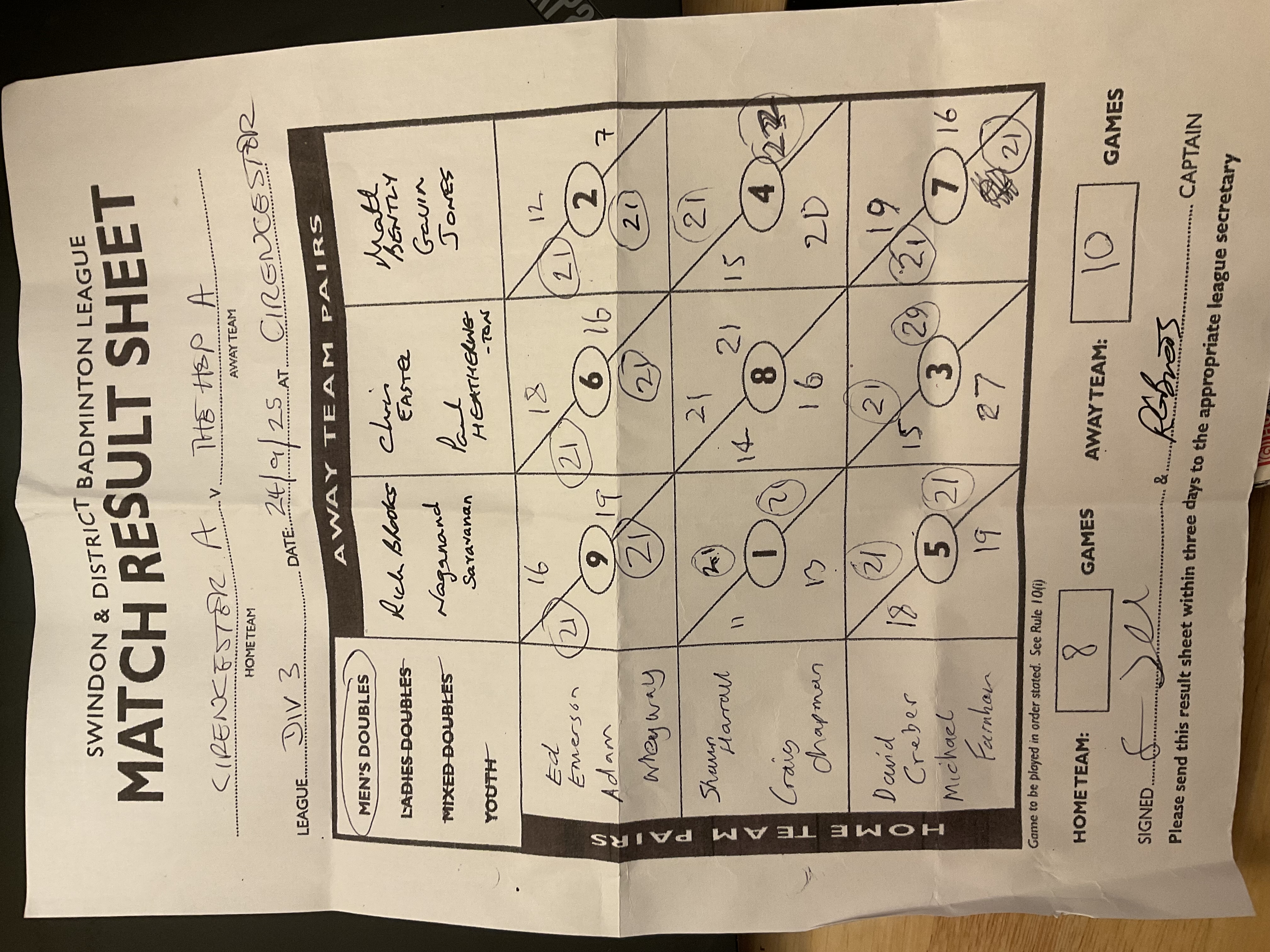 25-09-2025 | 20:00 | Thursday | Raychem B | David Lloyd | Ridgeway Leisure Centre, Inverary Road, Wroughton, Swindon, SN4 9DJ | 10 - 8 | |