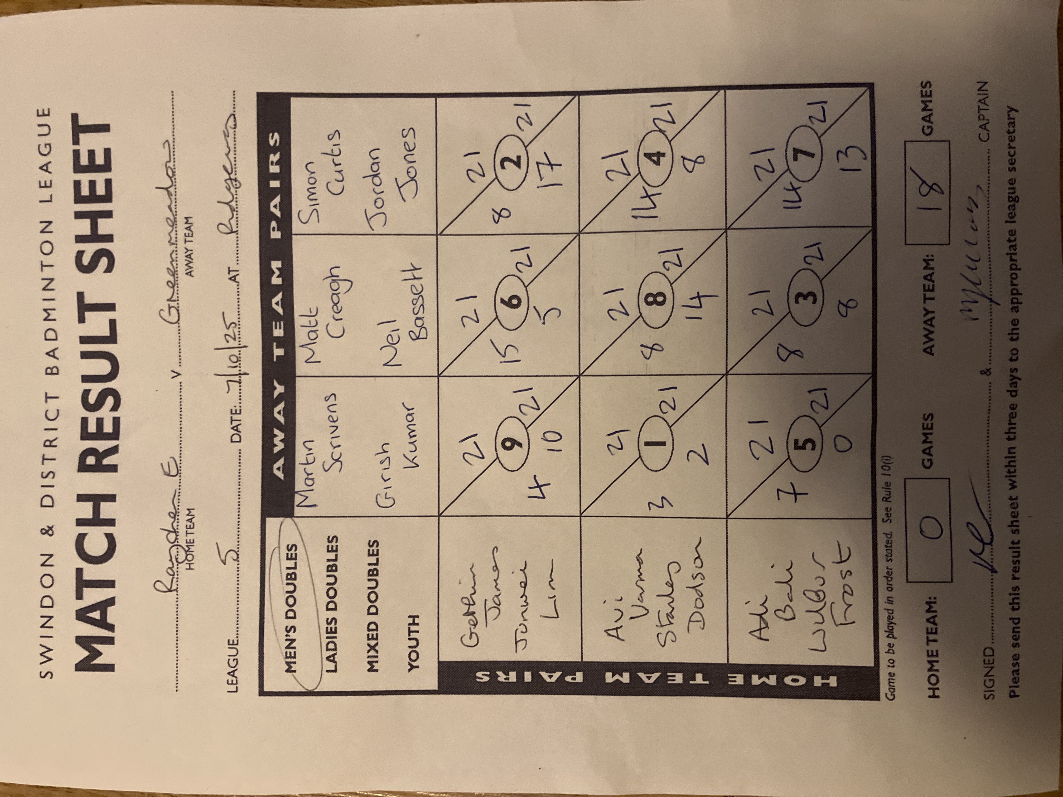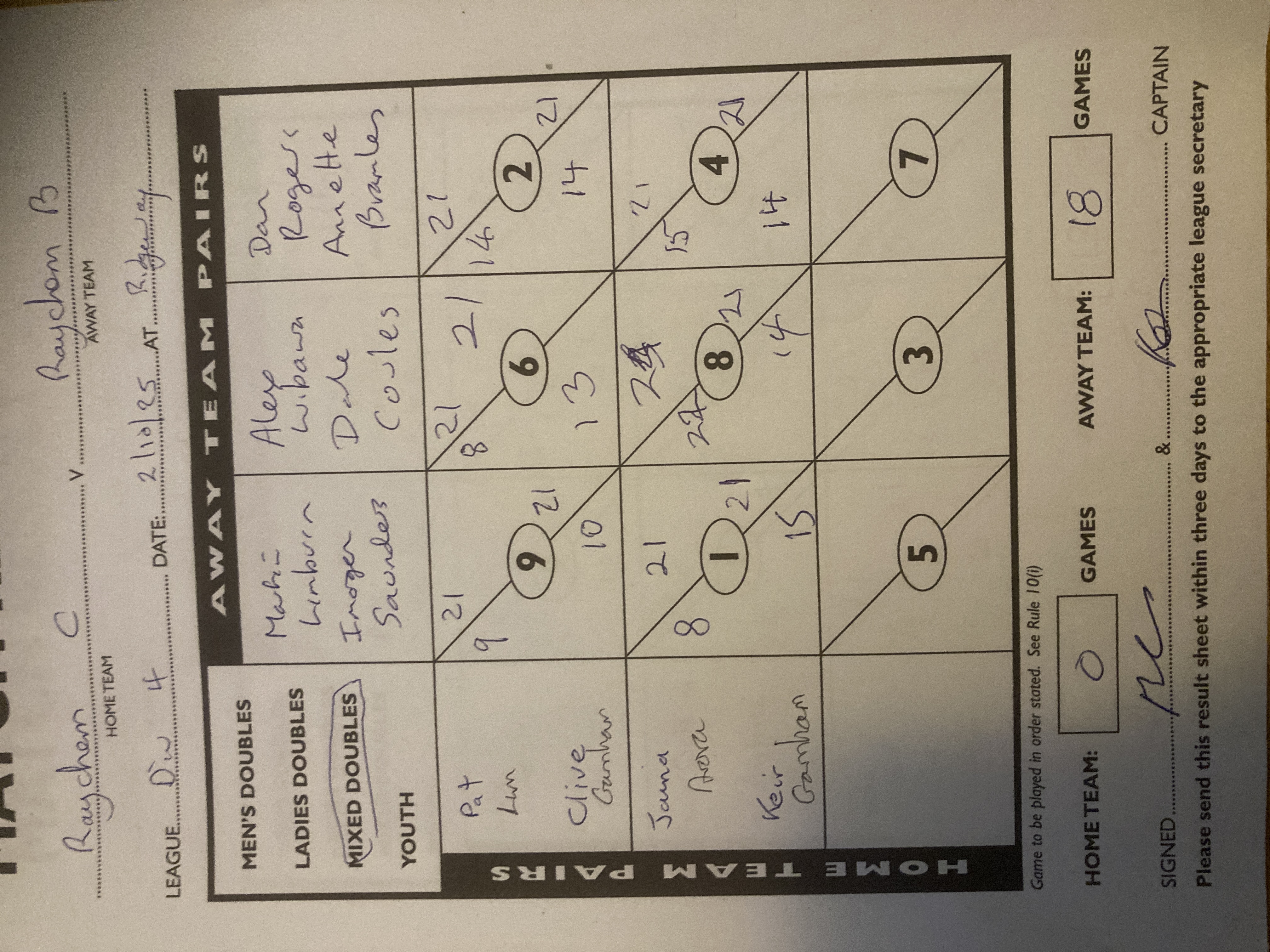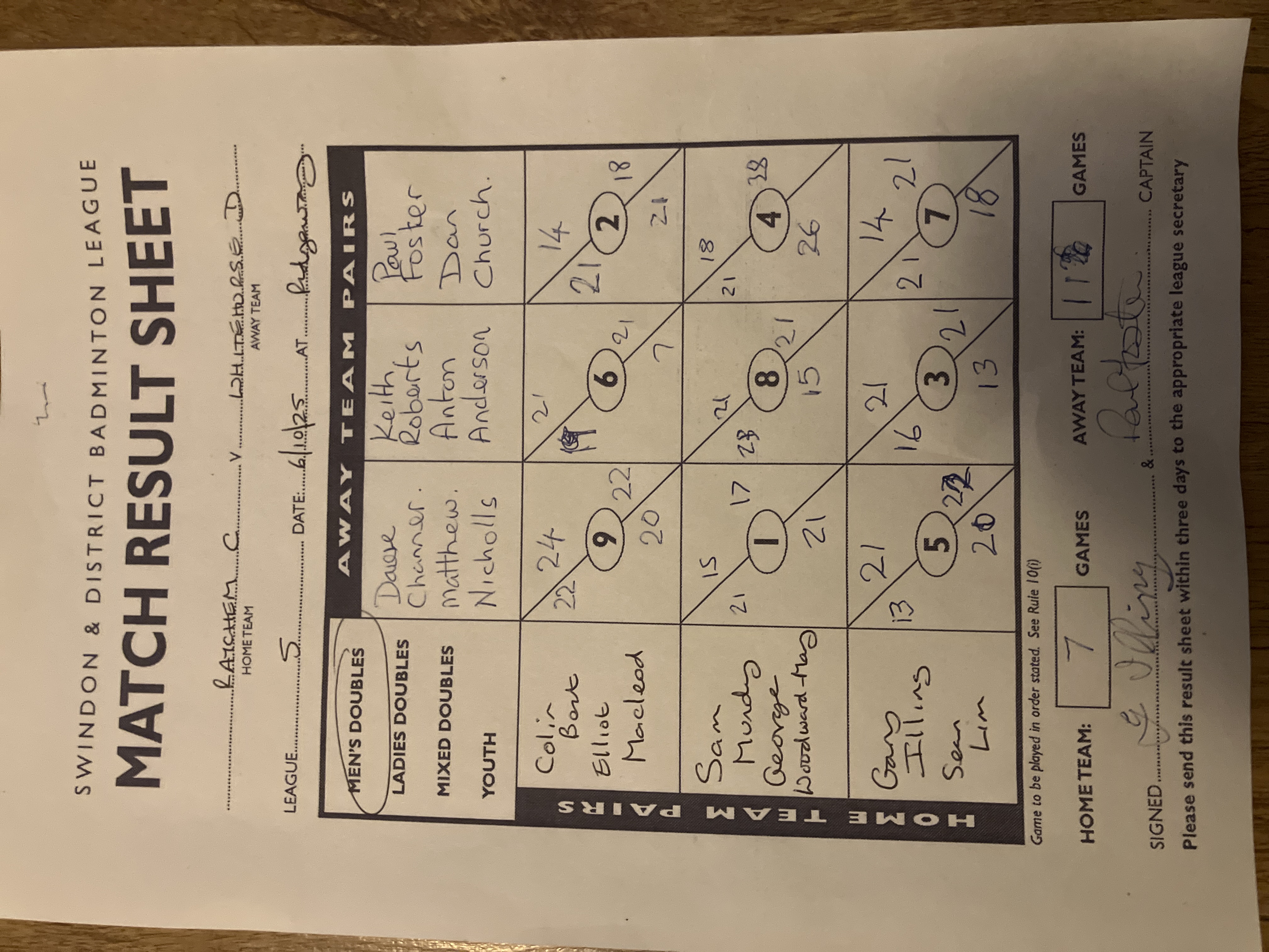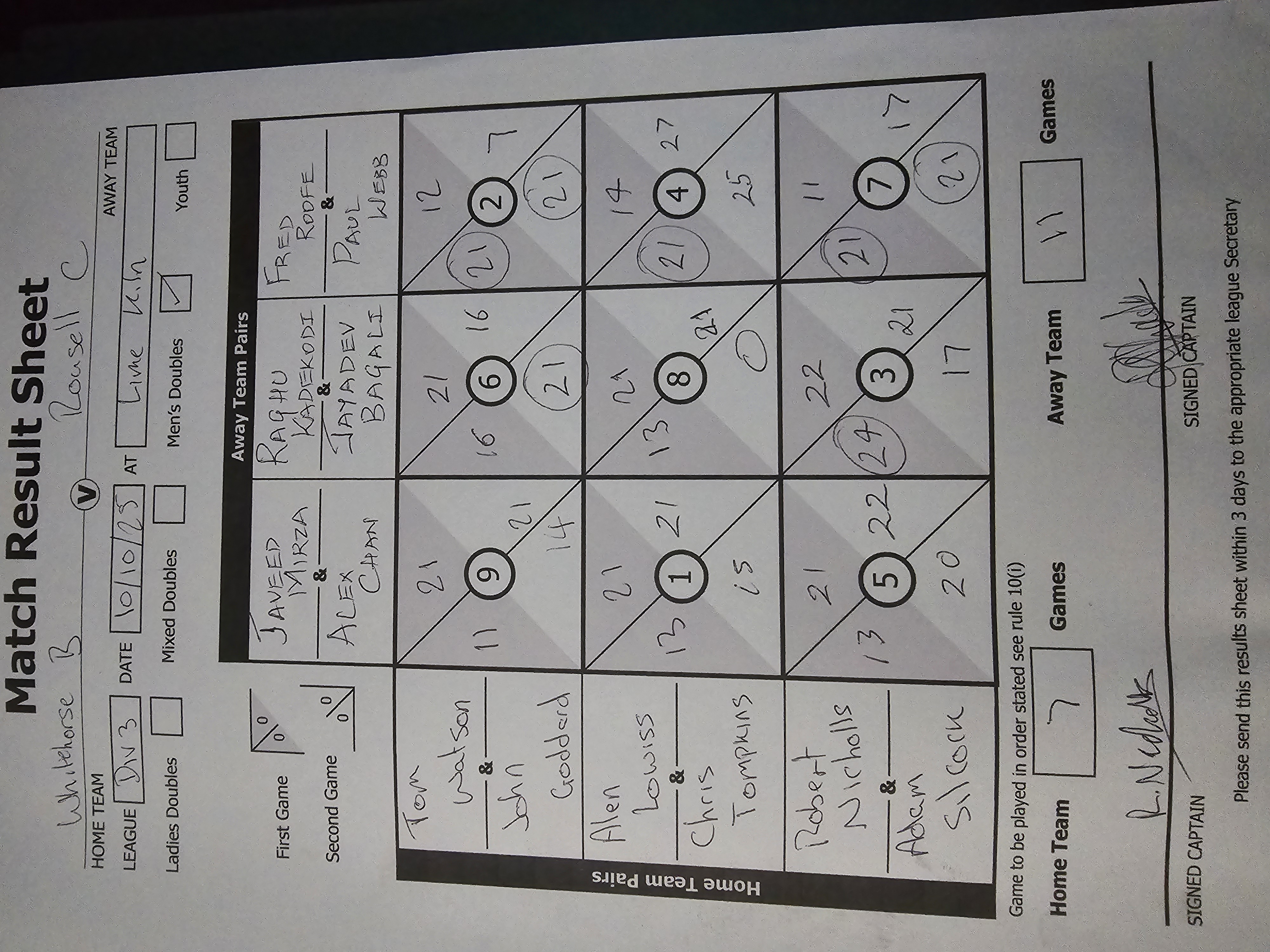 25-09-2025 | 20:00 | Thursday | Raychem B | David Lloyd | Ridgeway Leisure Centre, Inverary Road, Wroughton, Swindon, SN4 9DJ | 10 - 8 | |