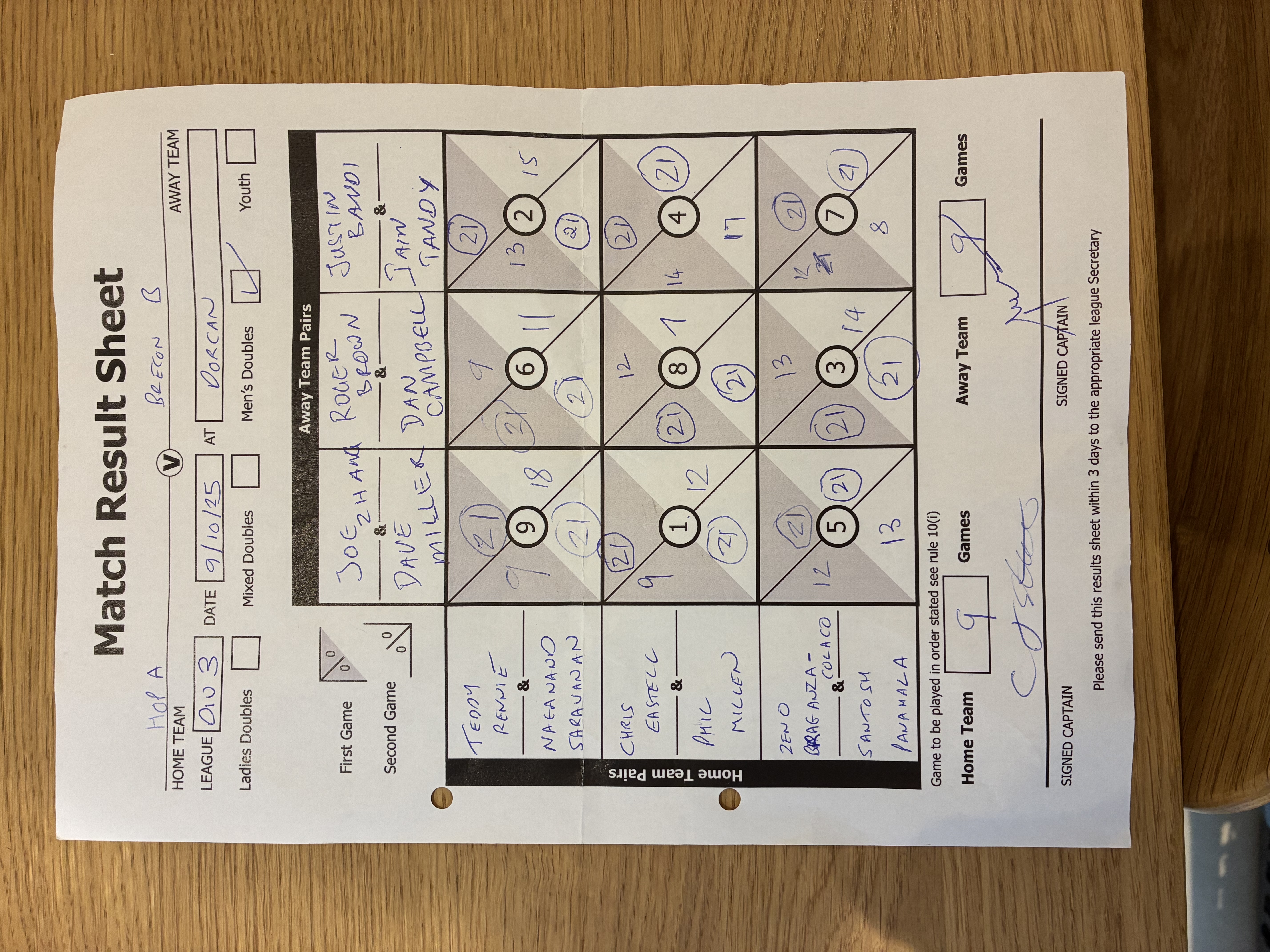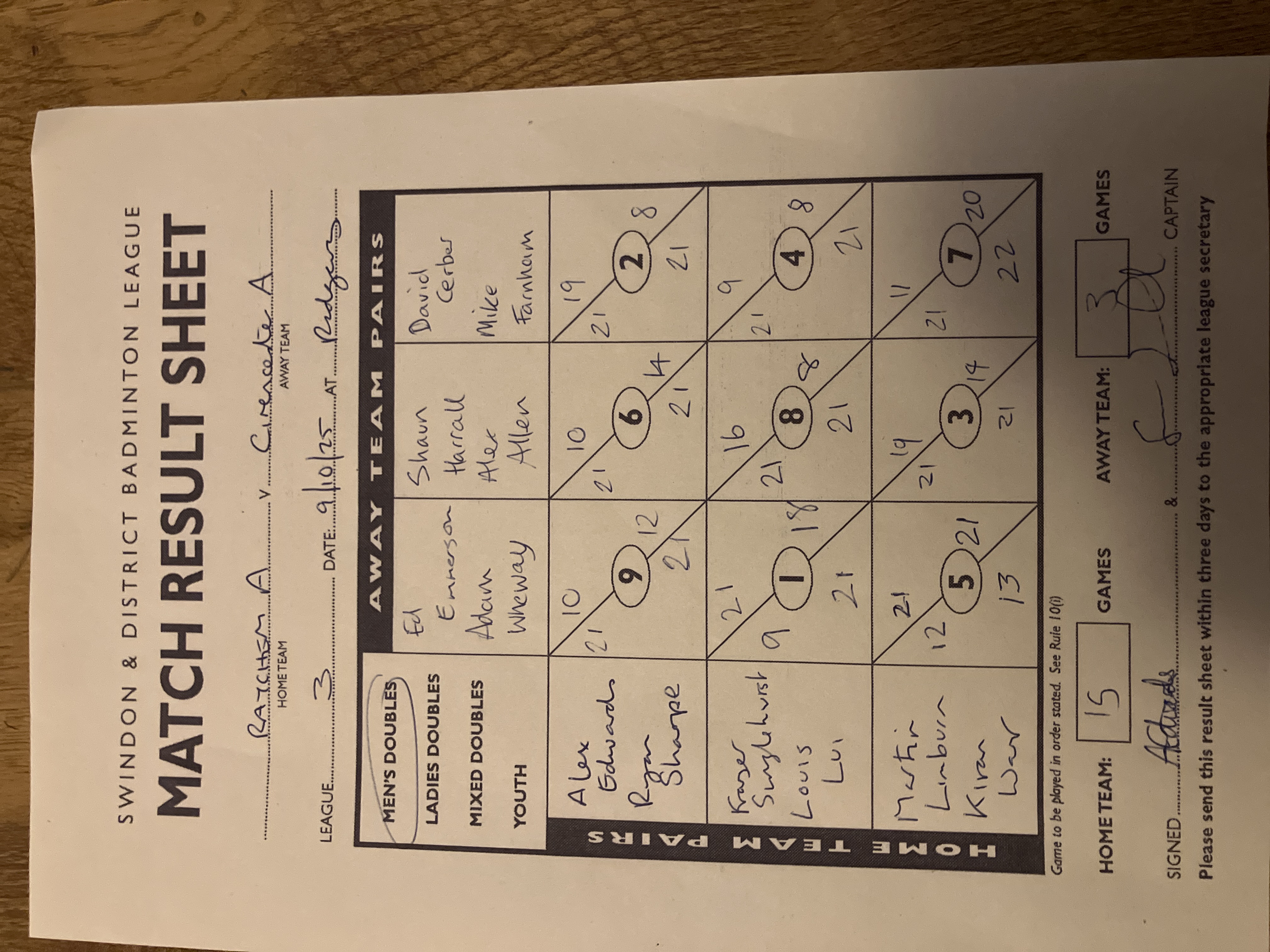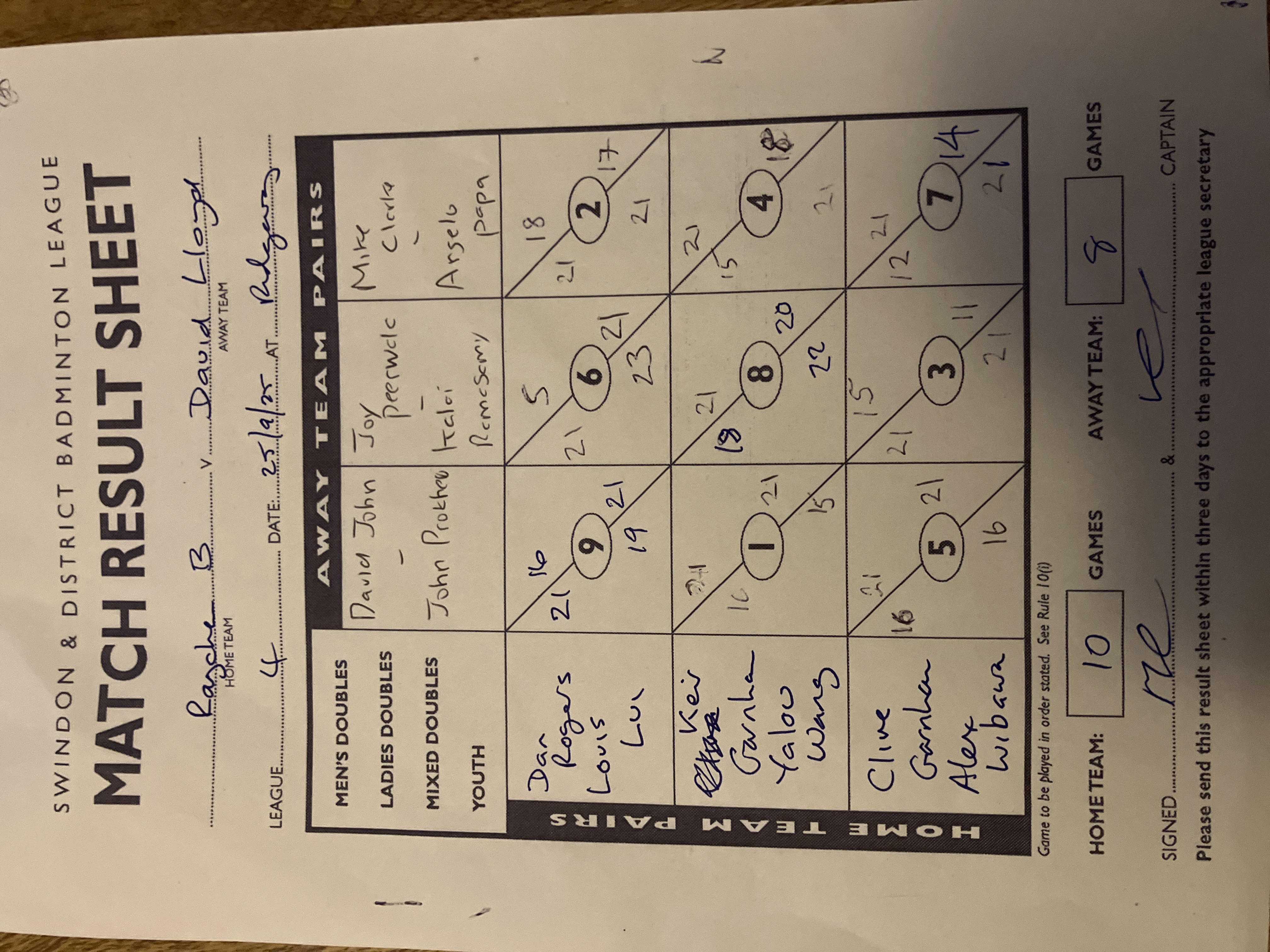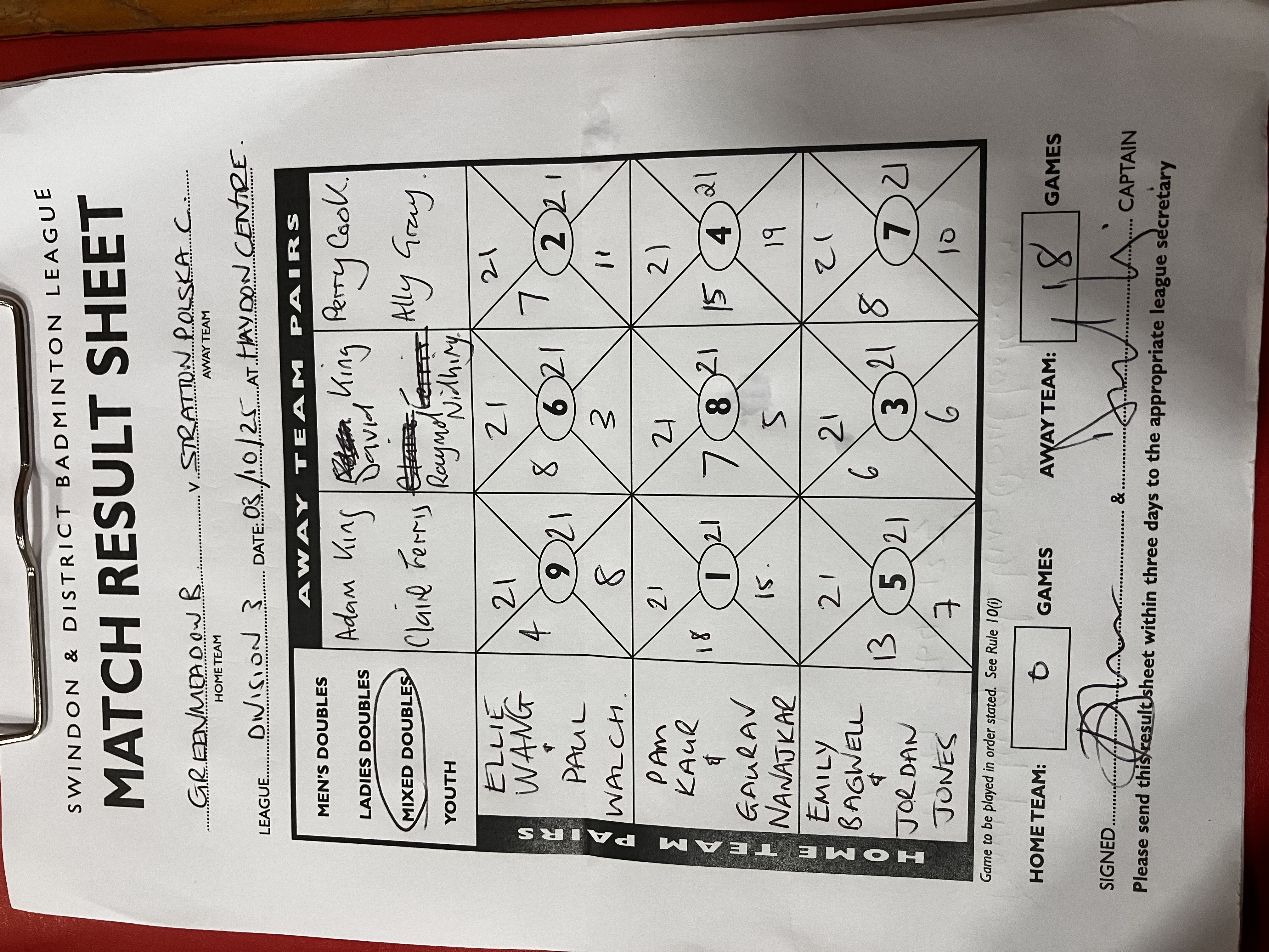 25-09-2025 | 20:00 | Thursday | Raychem B | David Lloyd | Ridgeway Leisure Centre, Inverary Road, Wroughton, Swindon, SN4 9DJ | 10 - 8 | |