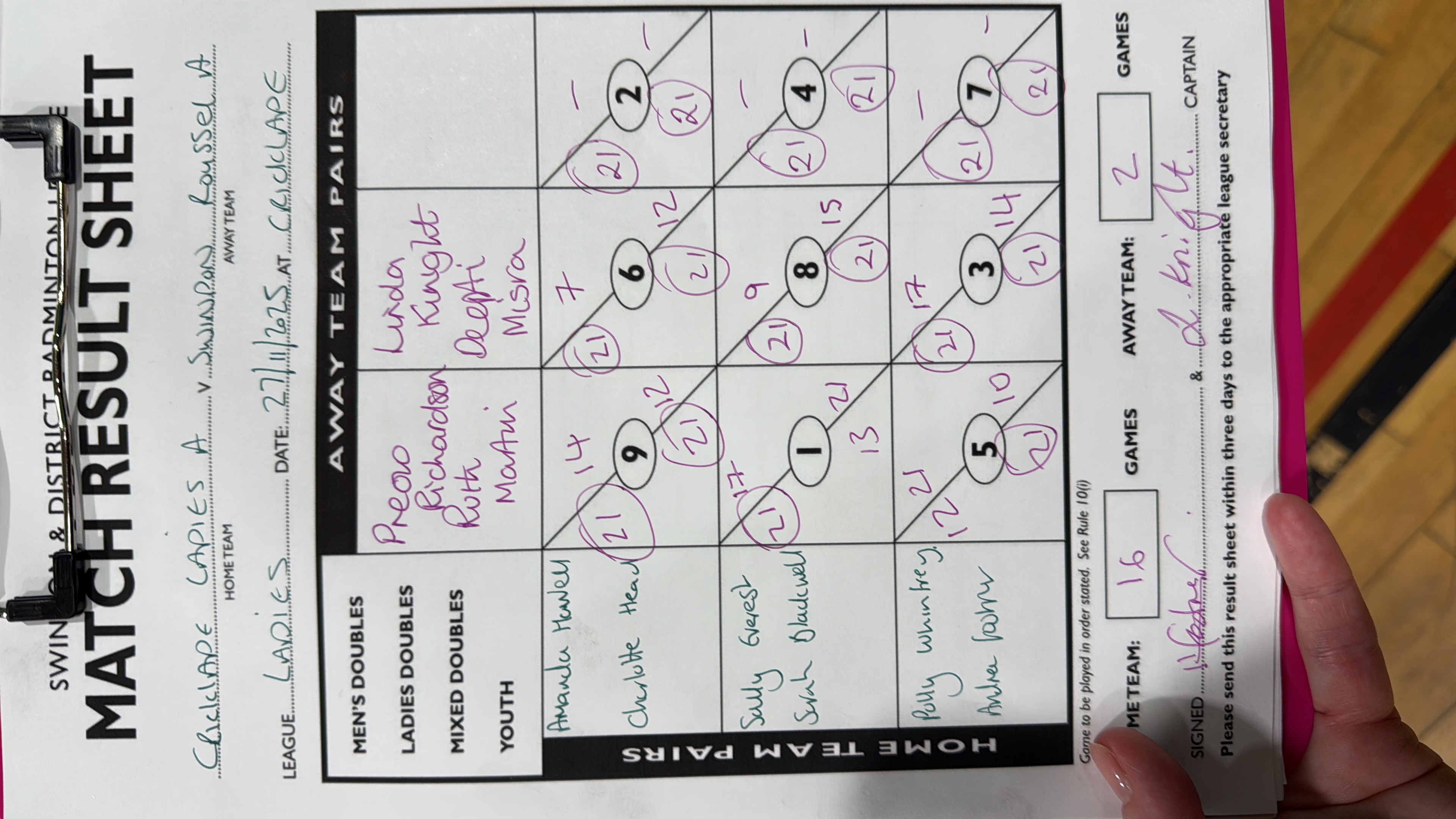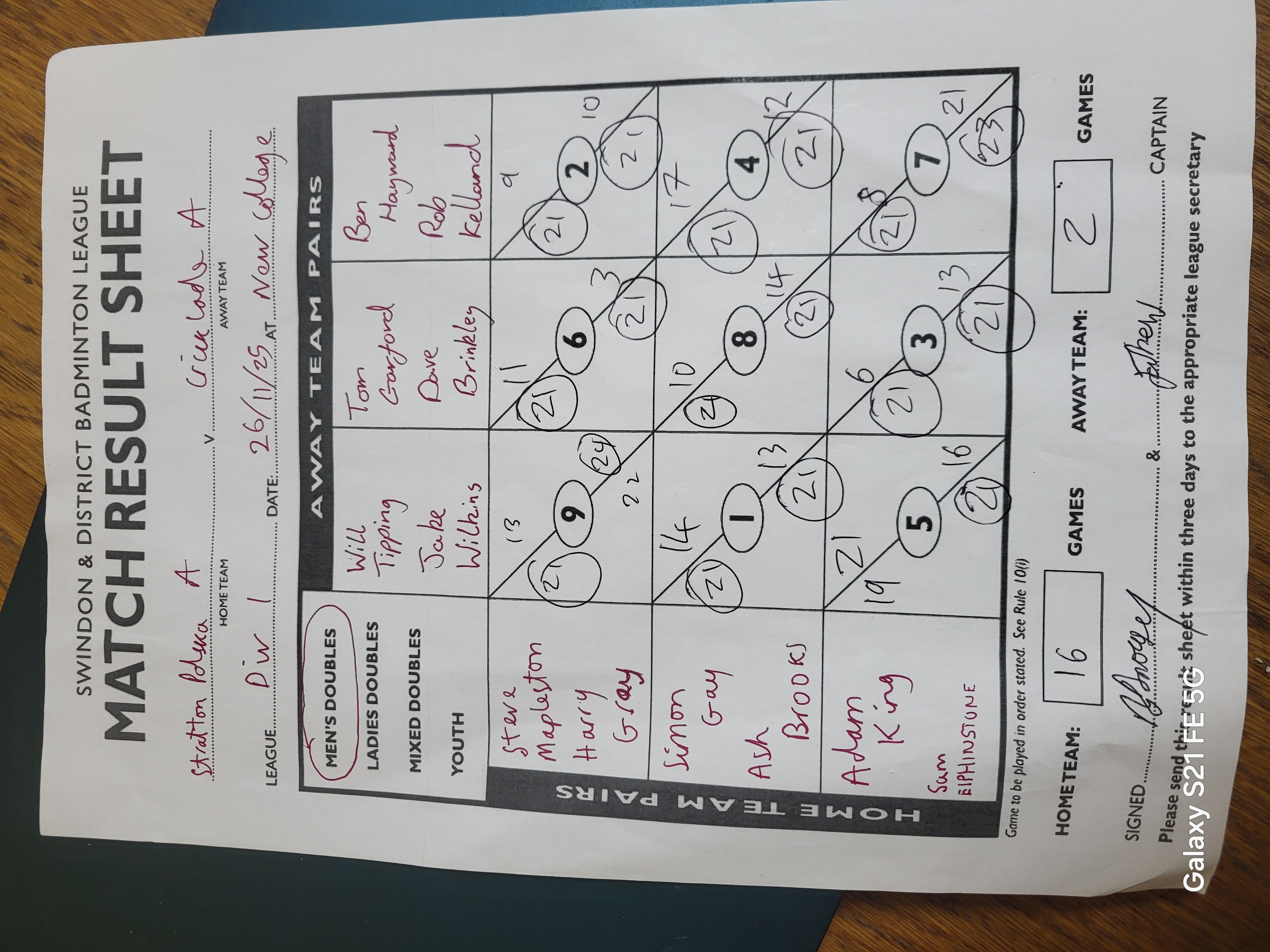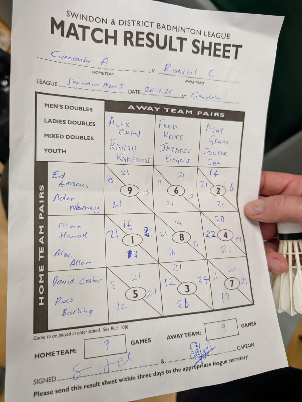 | 26-01-2026 | 19:00 | Monday | 16 Feathers B | Swindon-Roussel B | Grange Leisure and Community Centre, Grange Dr, Swindon, SN3 4JY | Upload | |