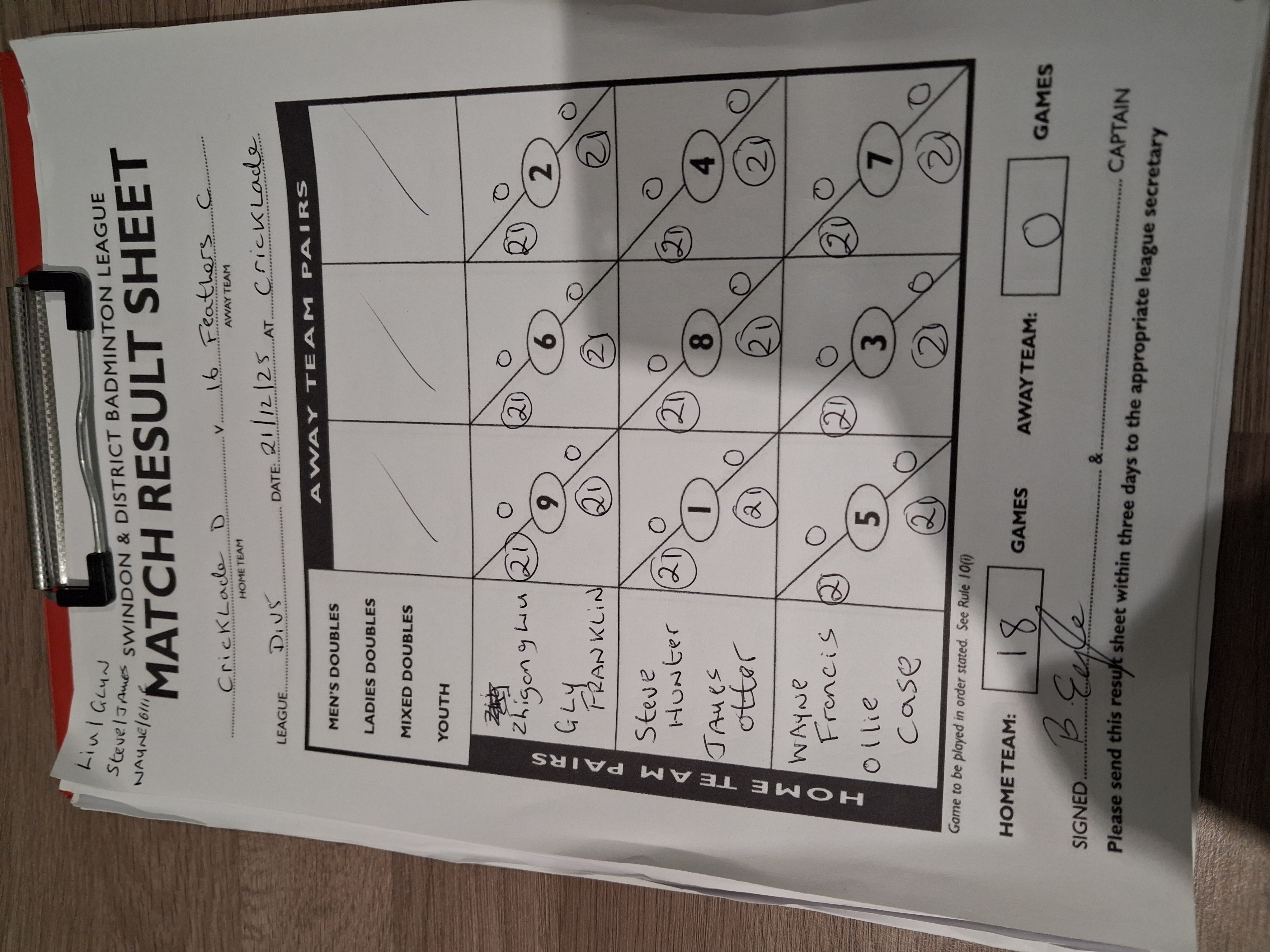 | 30-11-2025 | 18:45 | Sunday | Cricklade C | 16 Feathers B | Cricklade Leisure Centre, Stones Lane, Cricklade, Swindon, SN6 6JW | 7 - 11 | |