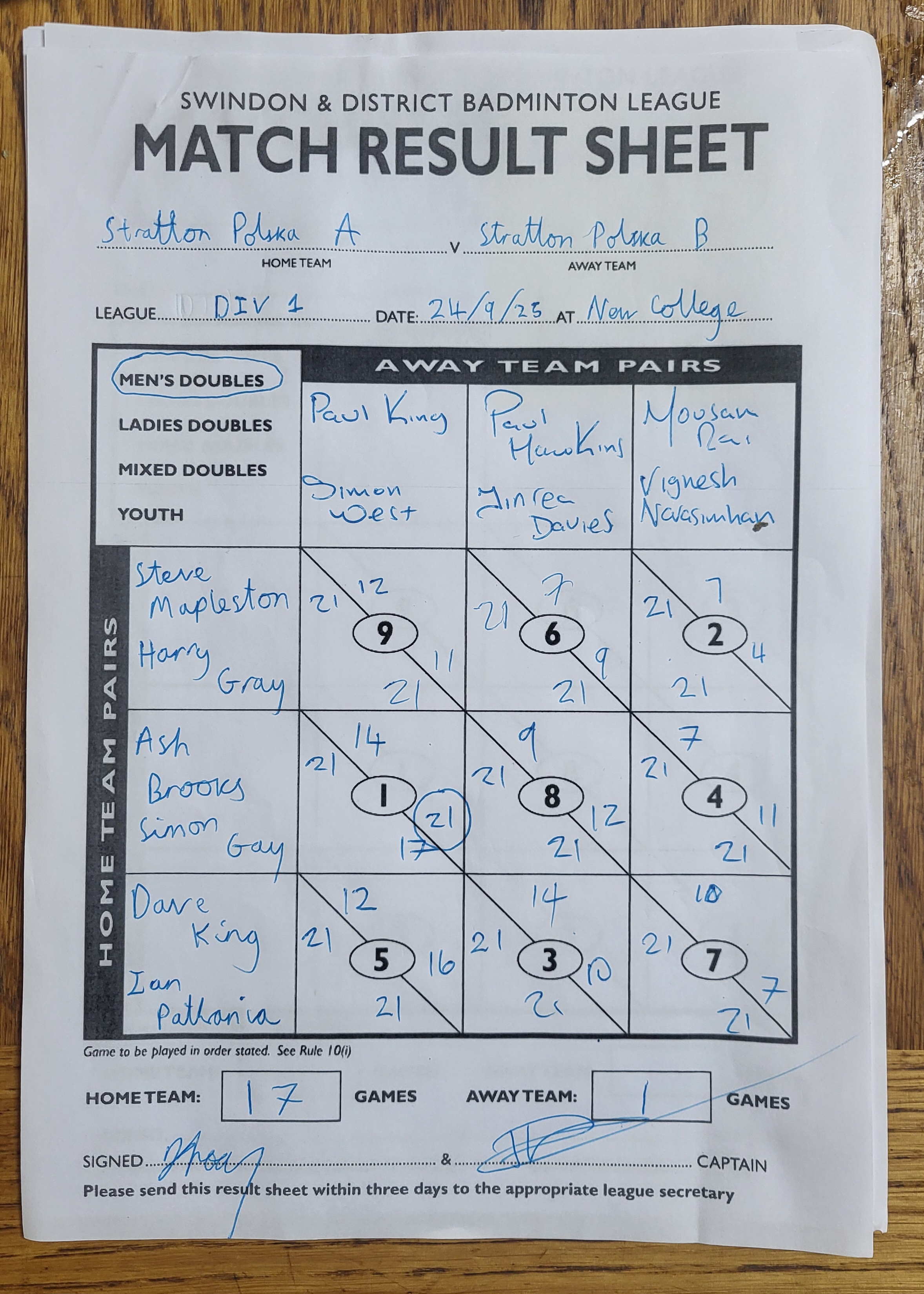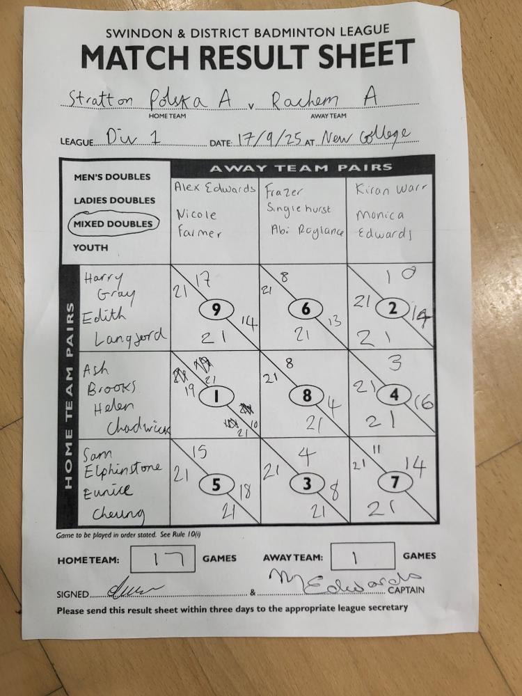 24-09-2025 | 19:00 | Wednesday | Stratton Polska A | Stratton Polska B | New College Sports Centre , New College Drive Swindon, SN3 1AH | 17 - 1 | |