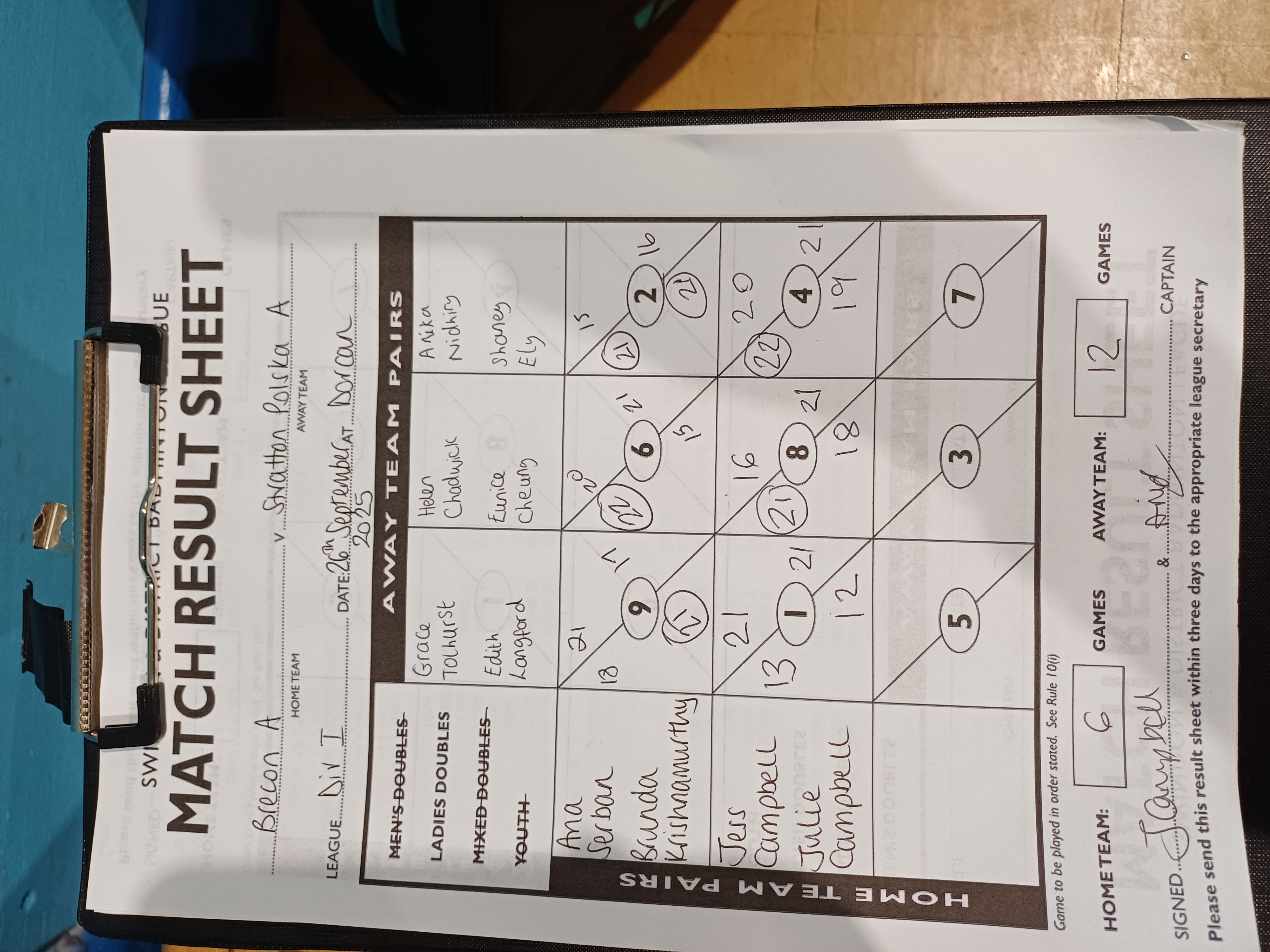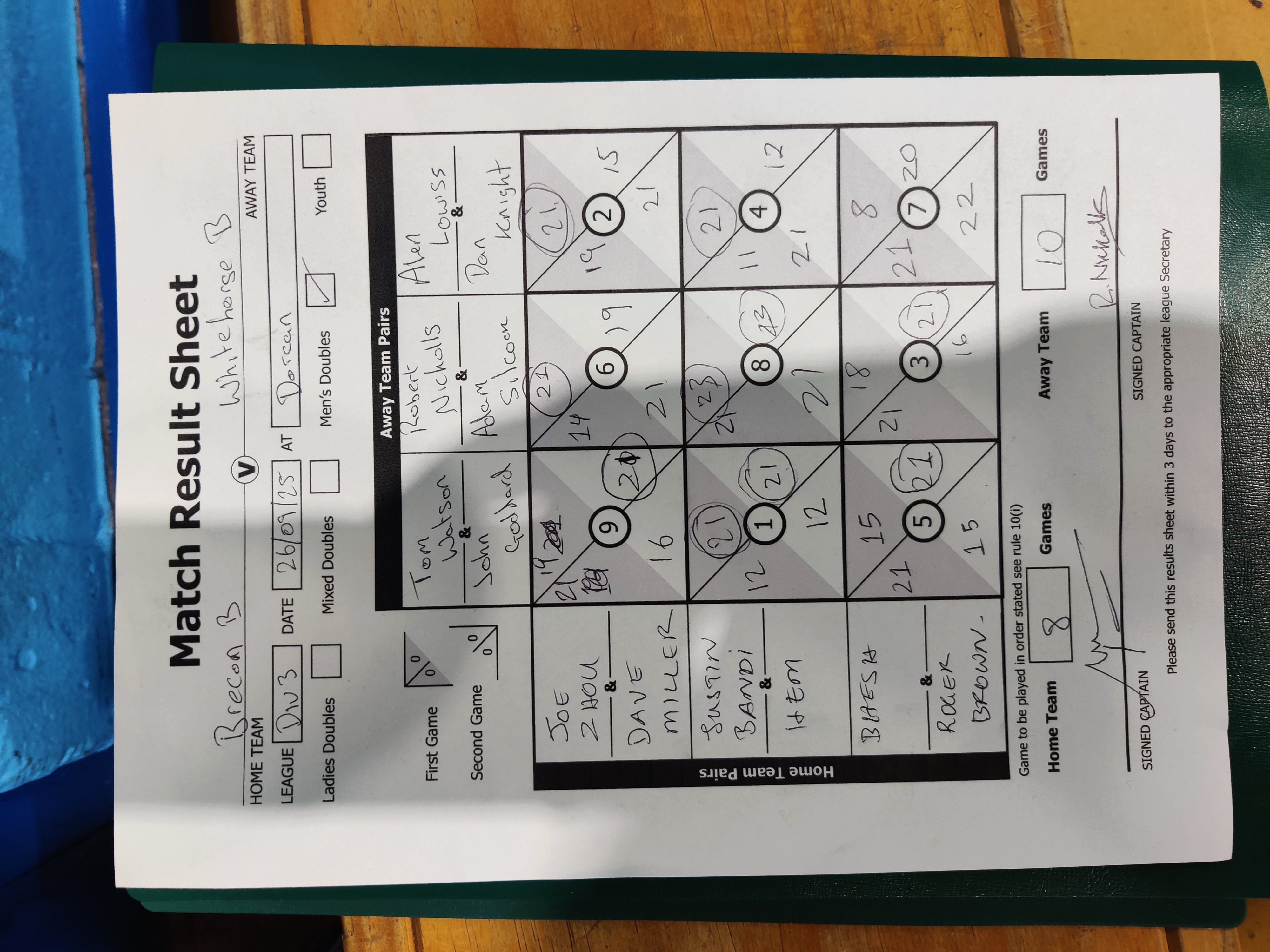 06-03-2026 | 19:30 | Friday | Brecon A | 16 Feathers B | Dorcan Sports Centre, Saint Pauls Drive, Swindon, SN3 5BY | Upload | |