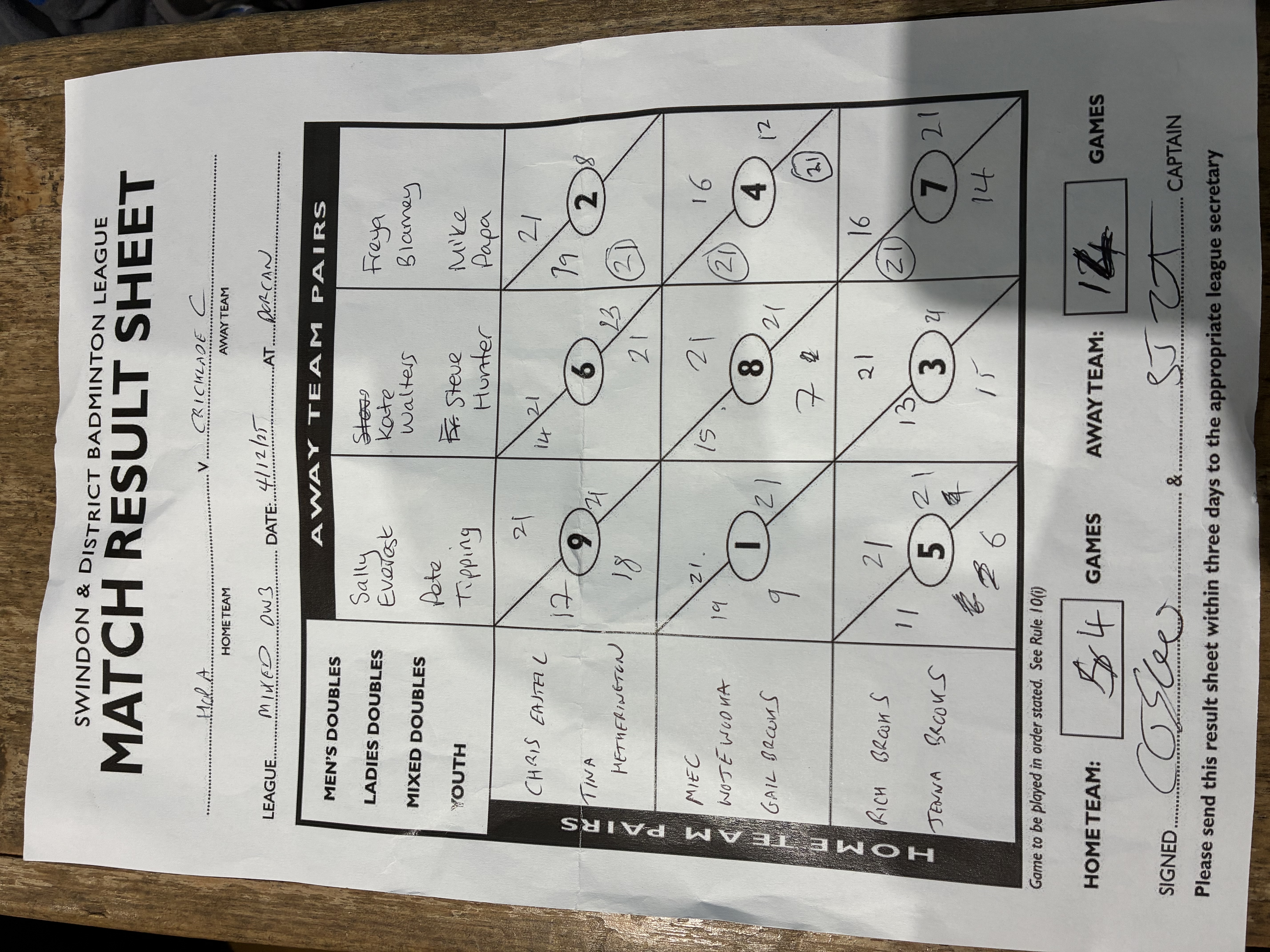 | 26-04-2026 | 18:45 | Sunday | Cricklade C | Swindon-Roussel B | Cricklade Leisure Centre, Stones Lane, Cricklade, Swindon, SN6 6JW | Upload | |
