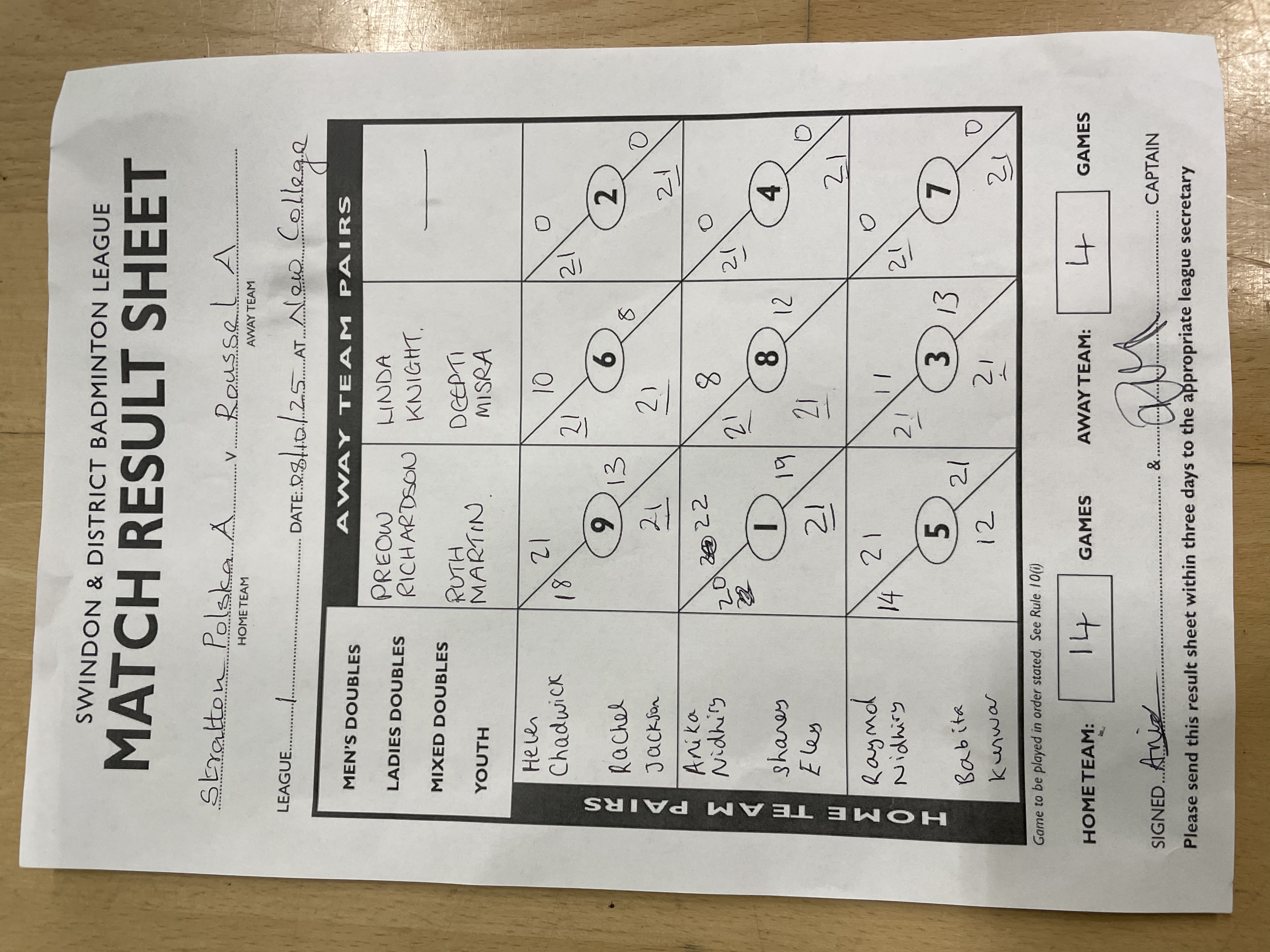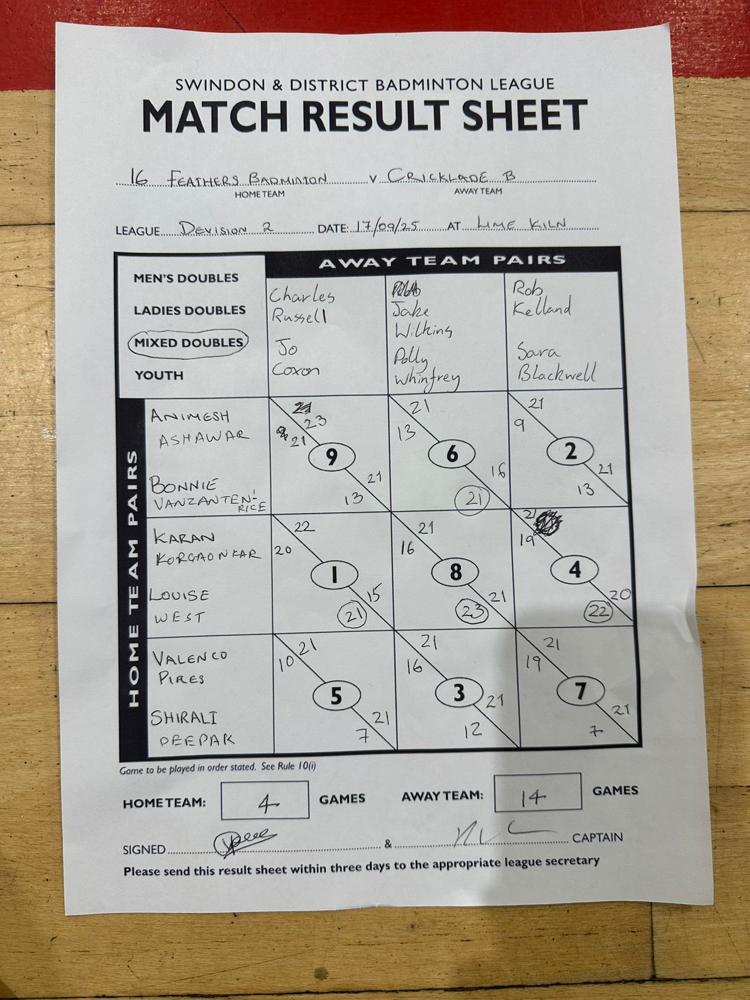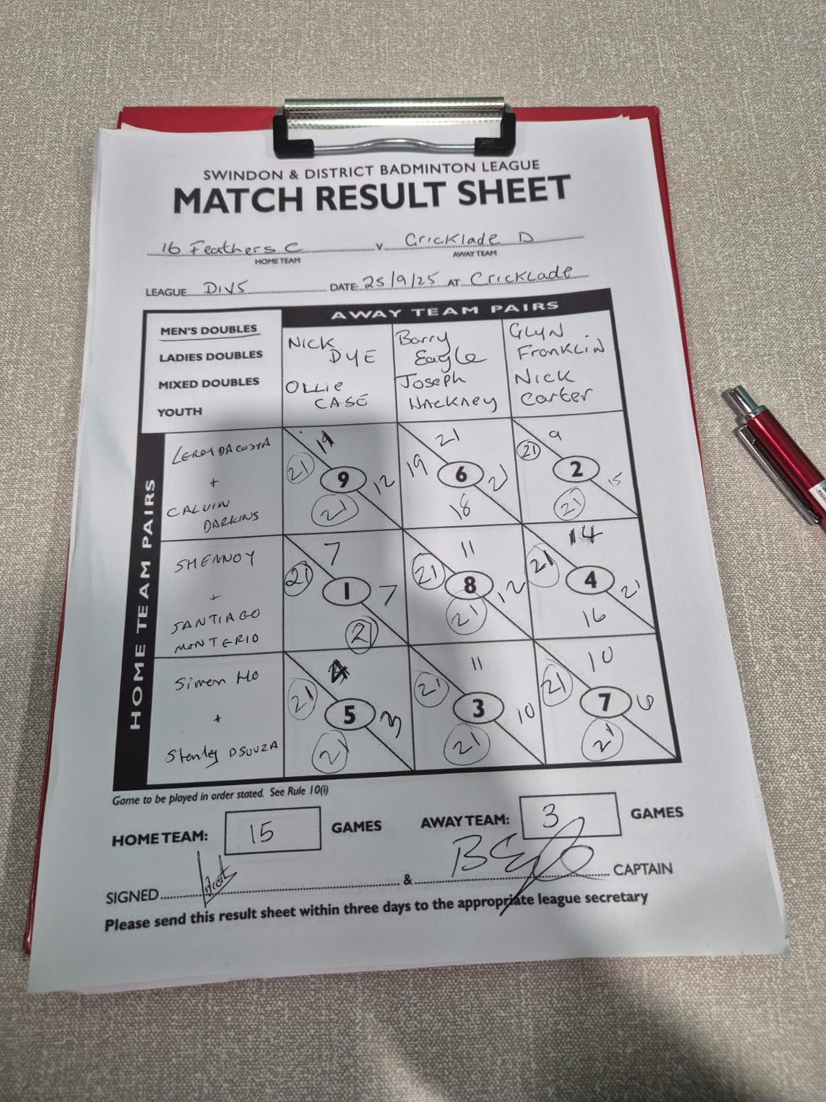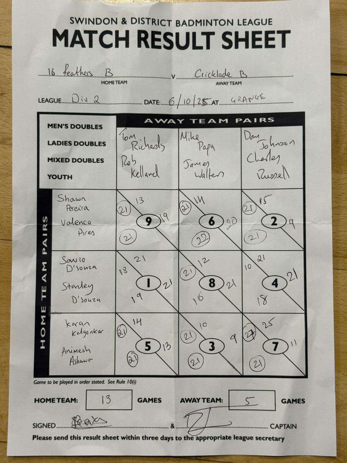 26-09-2025 | 19:00 | Friday | Swindon-Roussel B | 16 Feathers B | Ridgeway Leisure Centre, Inverary Road, Wroughton, Swindon, SN4 9DJ | 11 - 7 | |