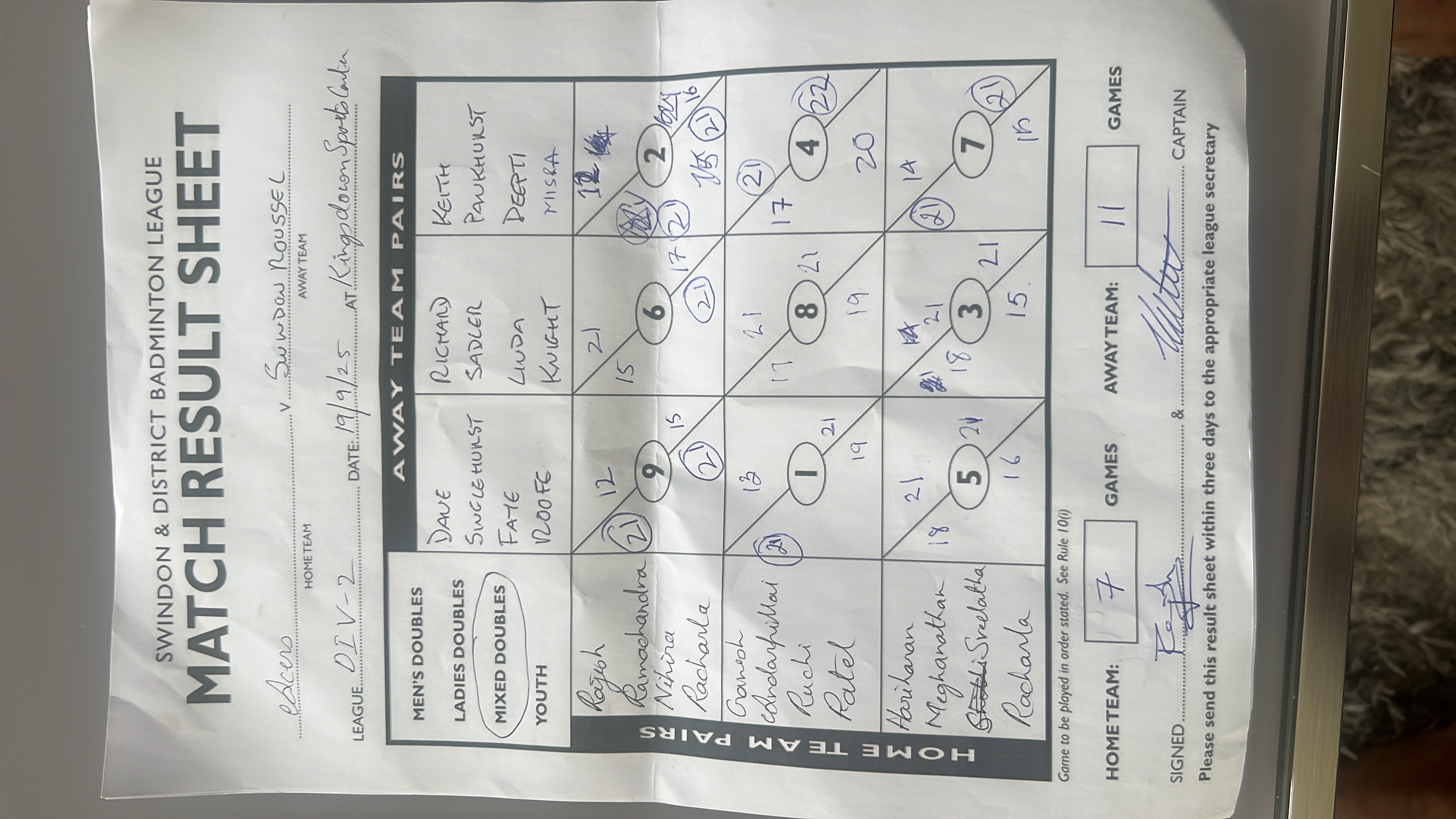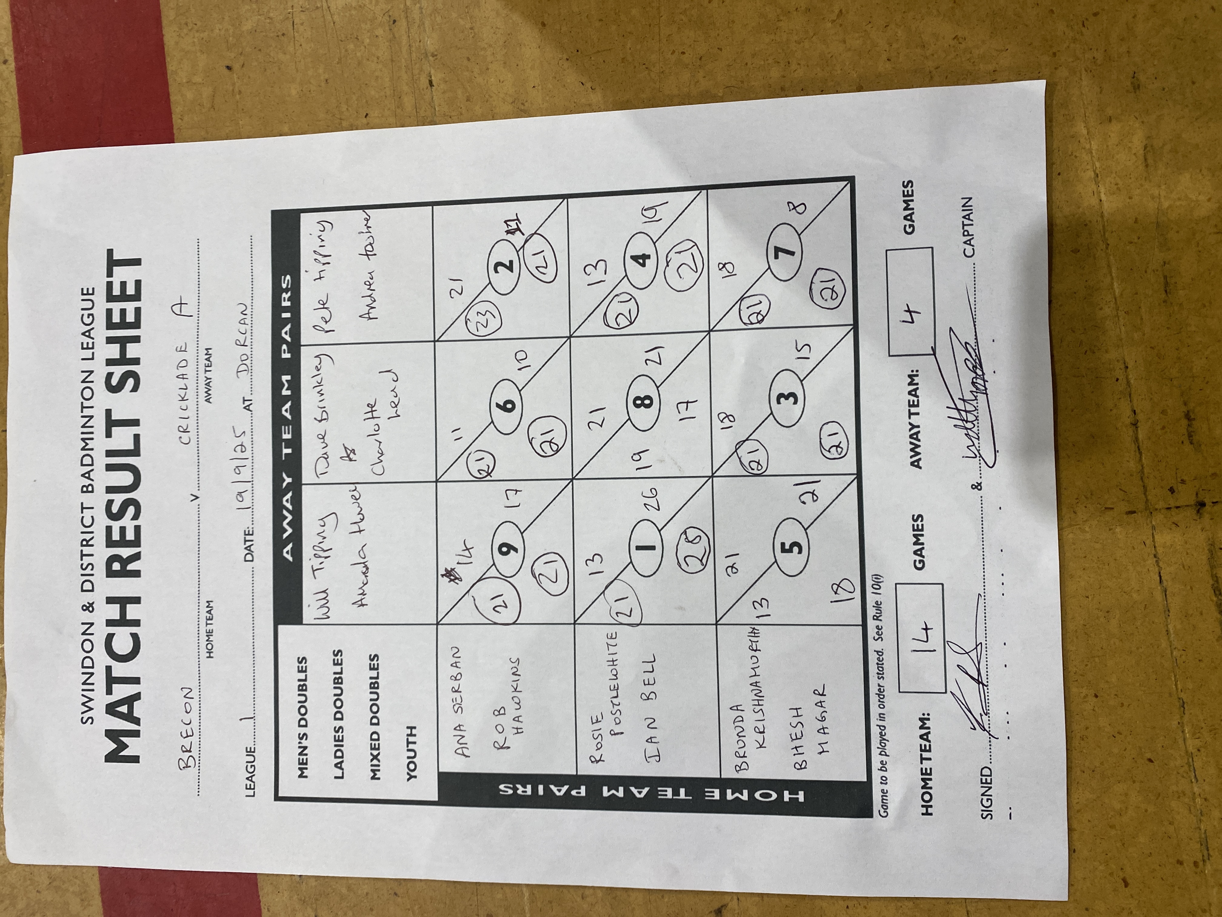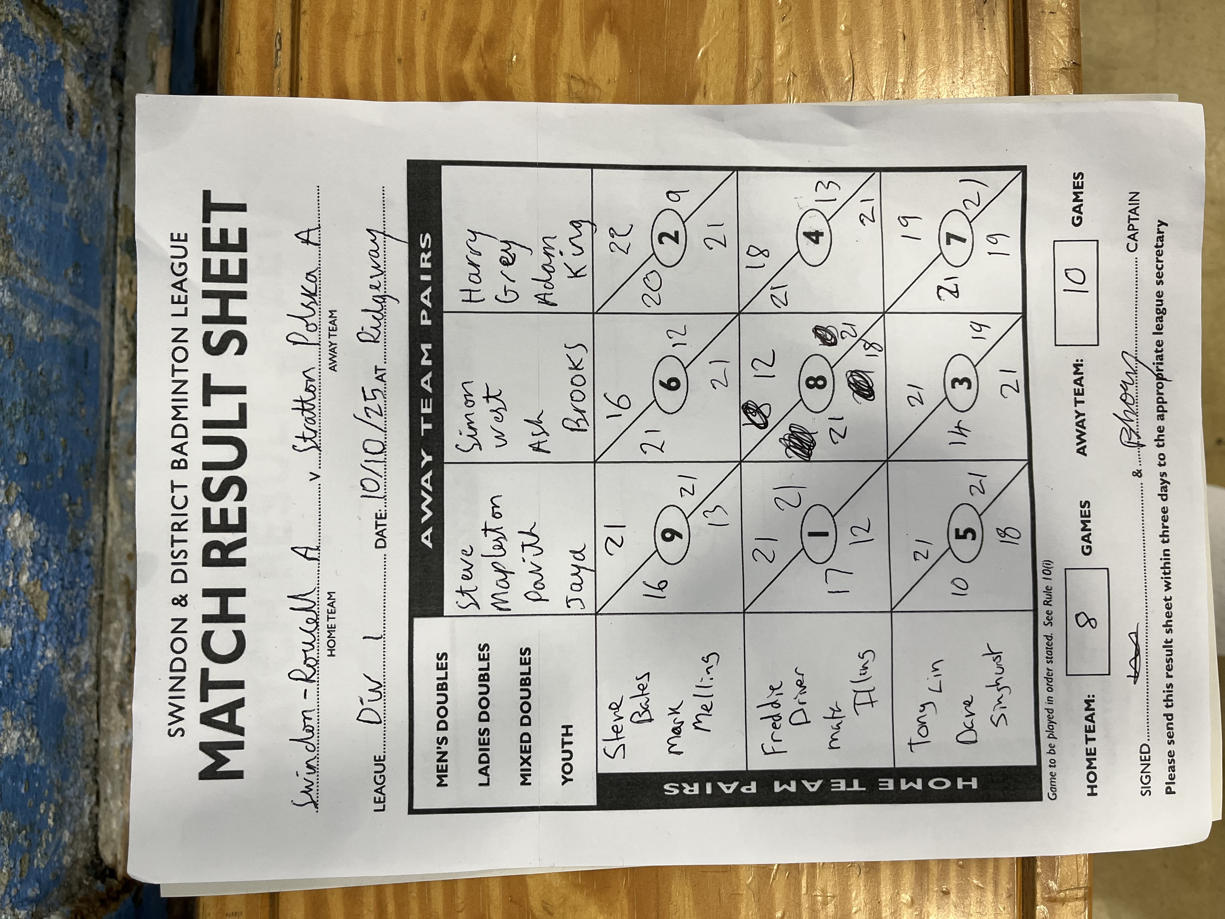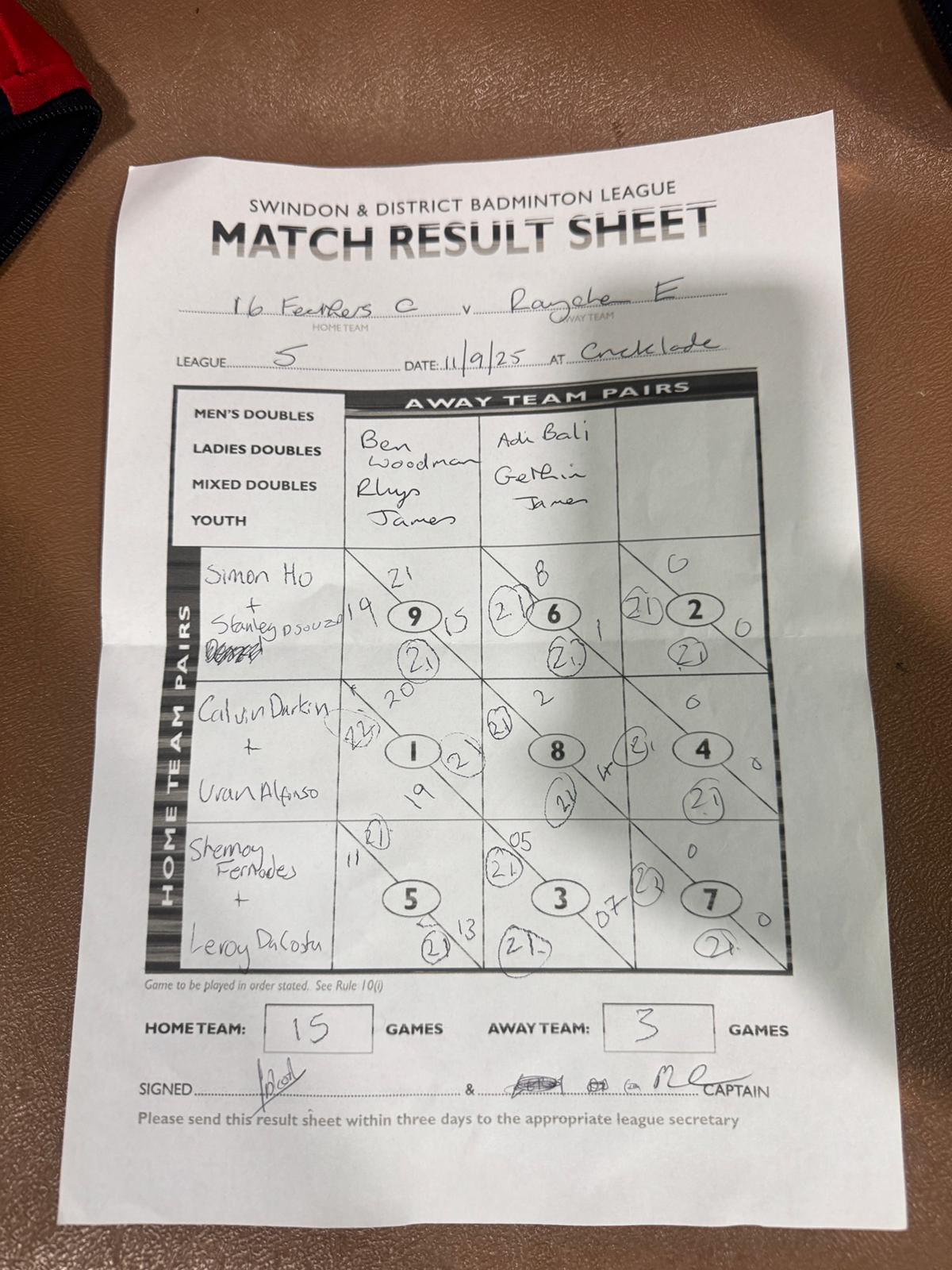 26-09-2025 | 19:00 | Friday | Swindon-Roussel B | 16 Feathers B | Ridgeway Leisure Centre, Inverary Road, Wroughton, Swindon, SN4 9DJ | 11 - 7 | |