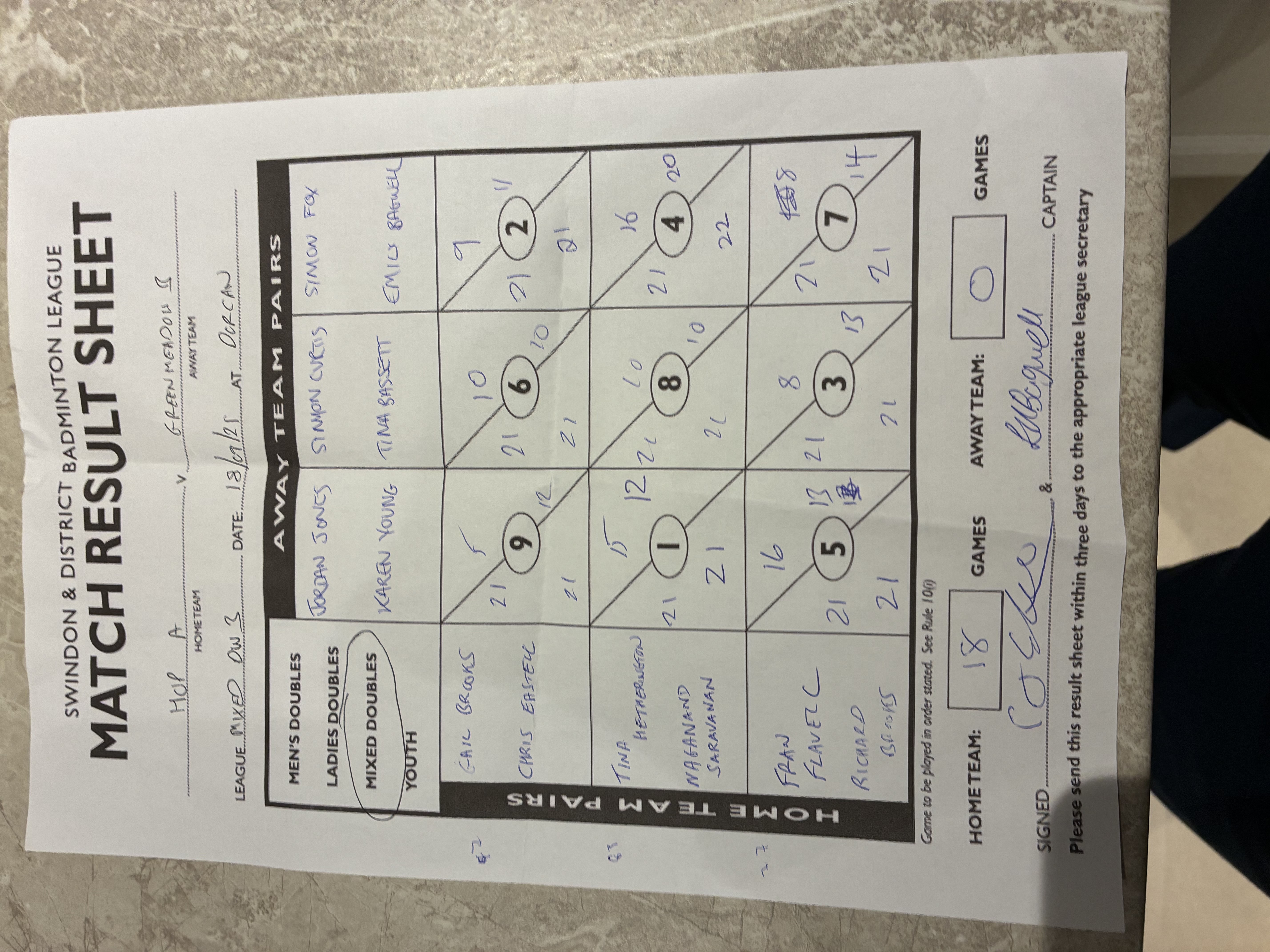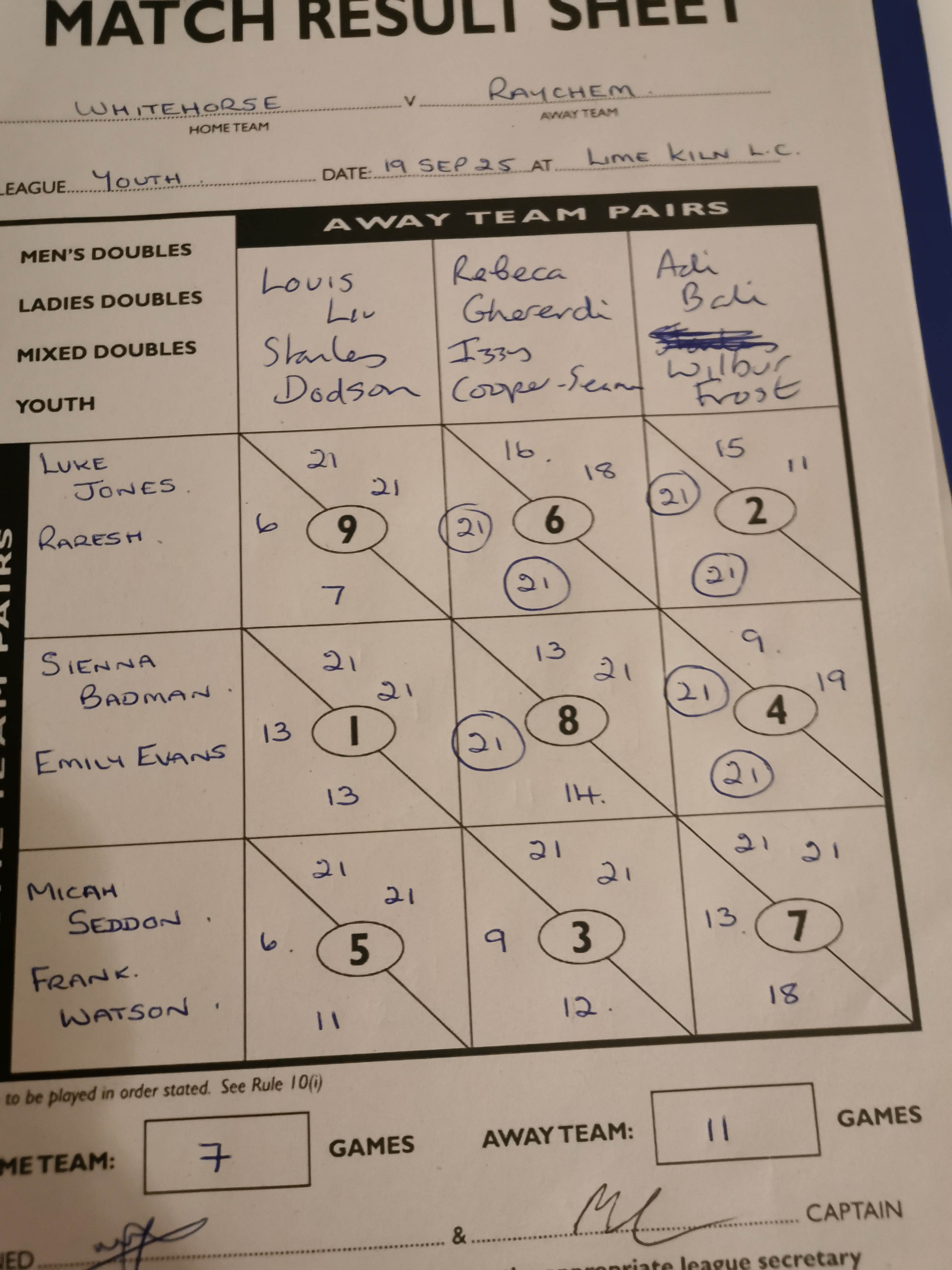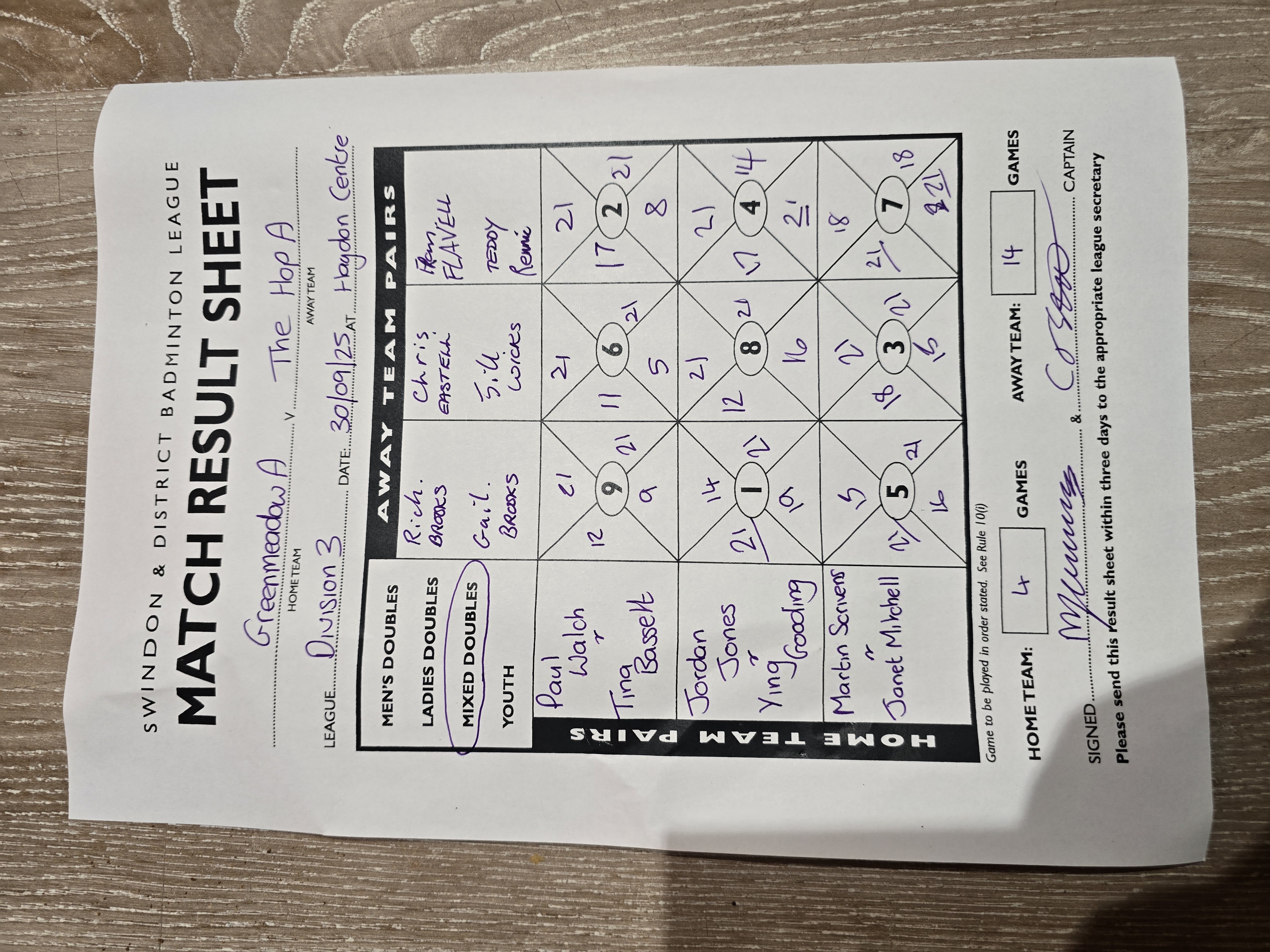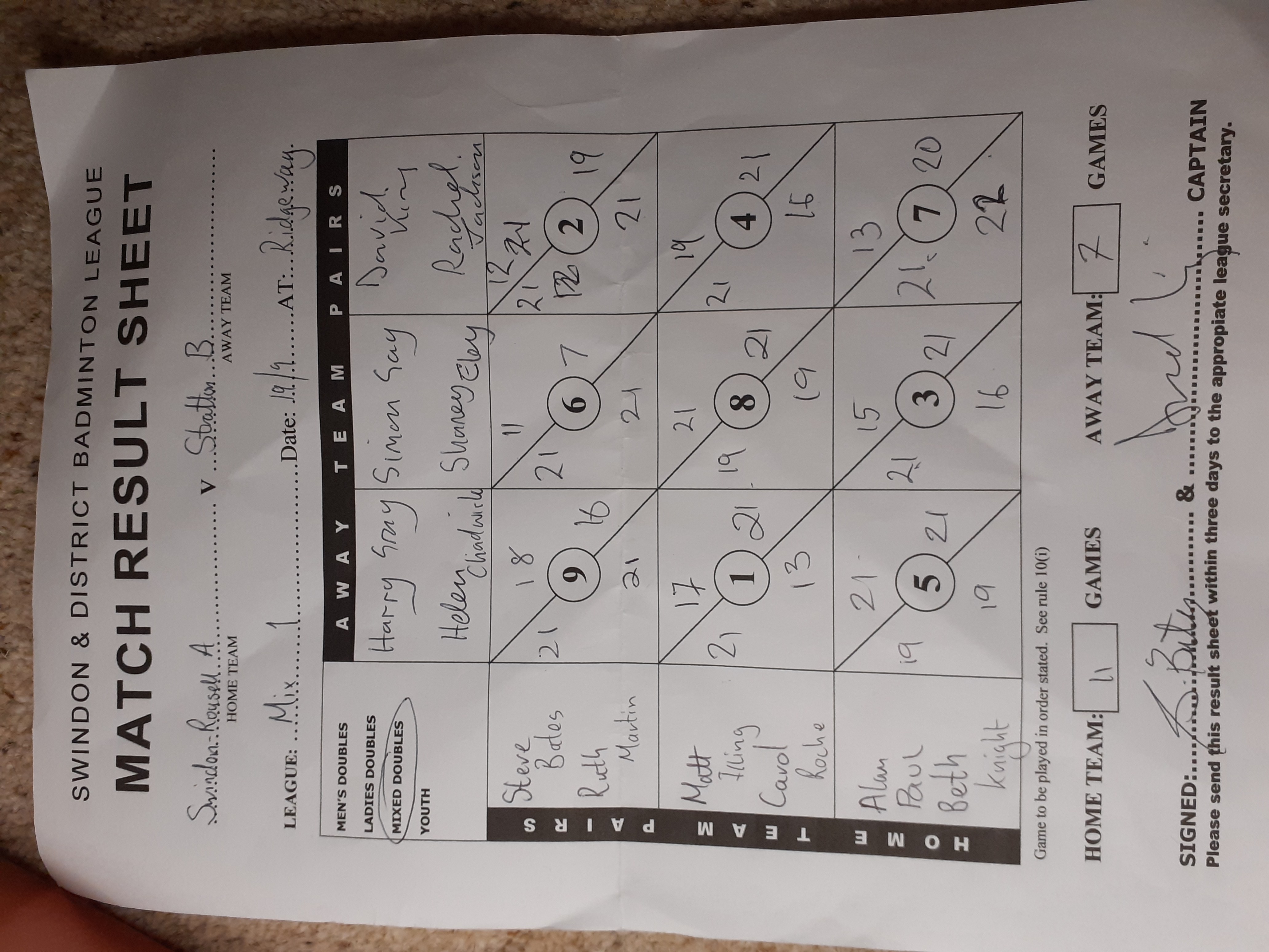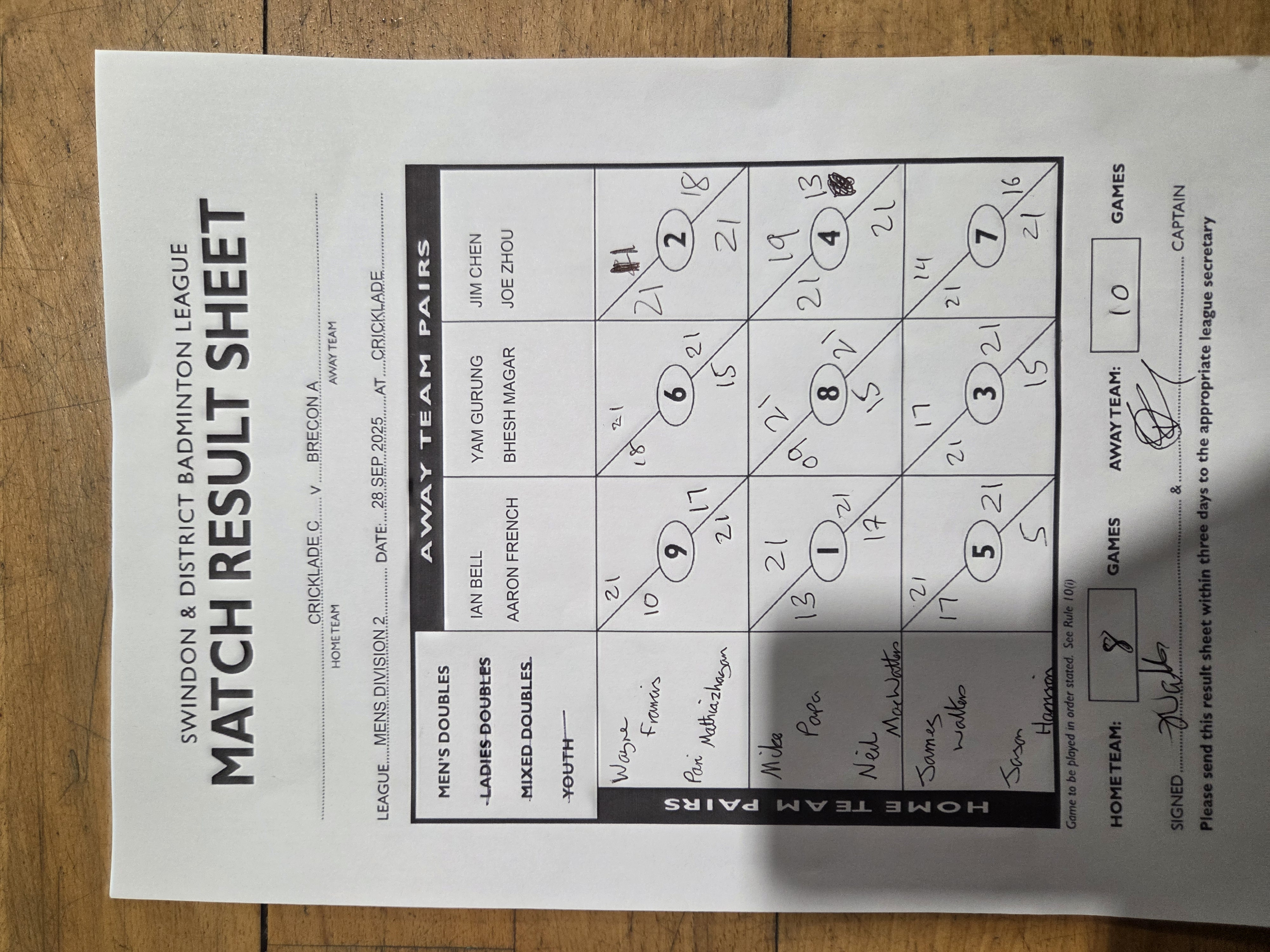 26-09-2025 | 19:00 | Friday | Swindon-Roussel B | 16 Feathers B | Ridgeway Leisure Centre, Inverary Road, Wroughton, Swindon, SN4 9DJ | 11 - 7 | |