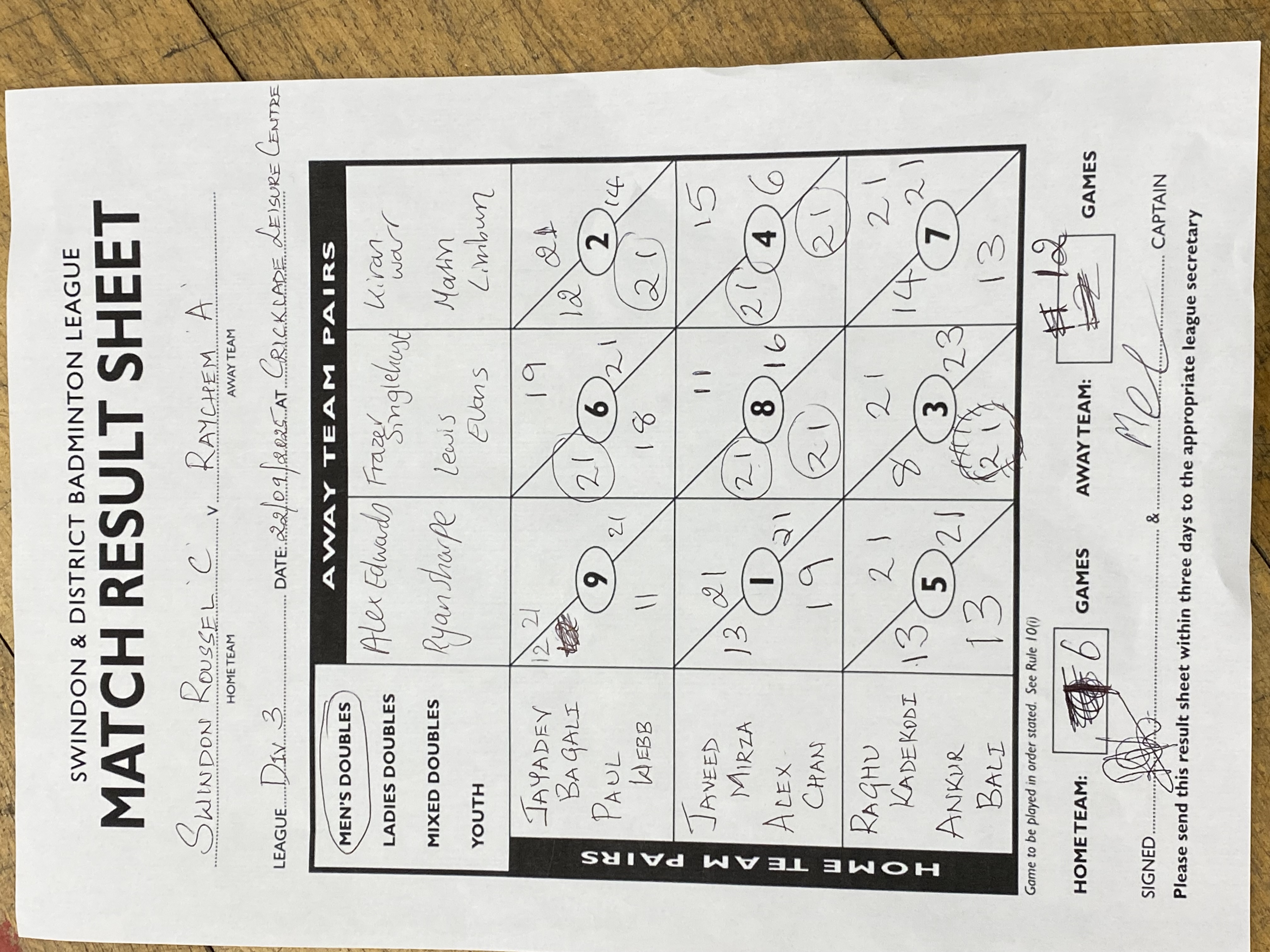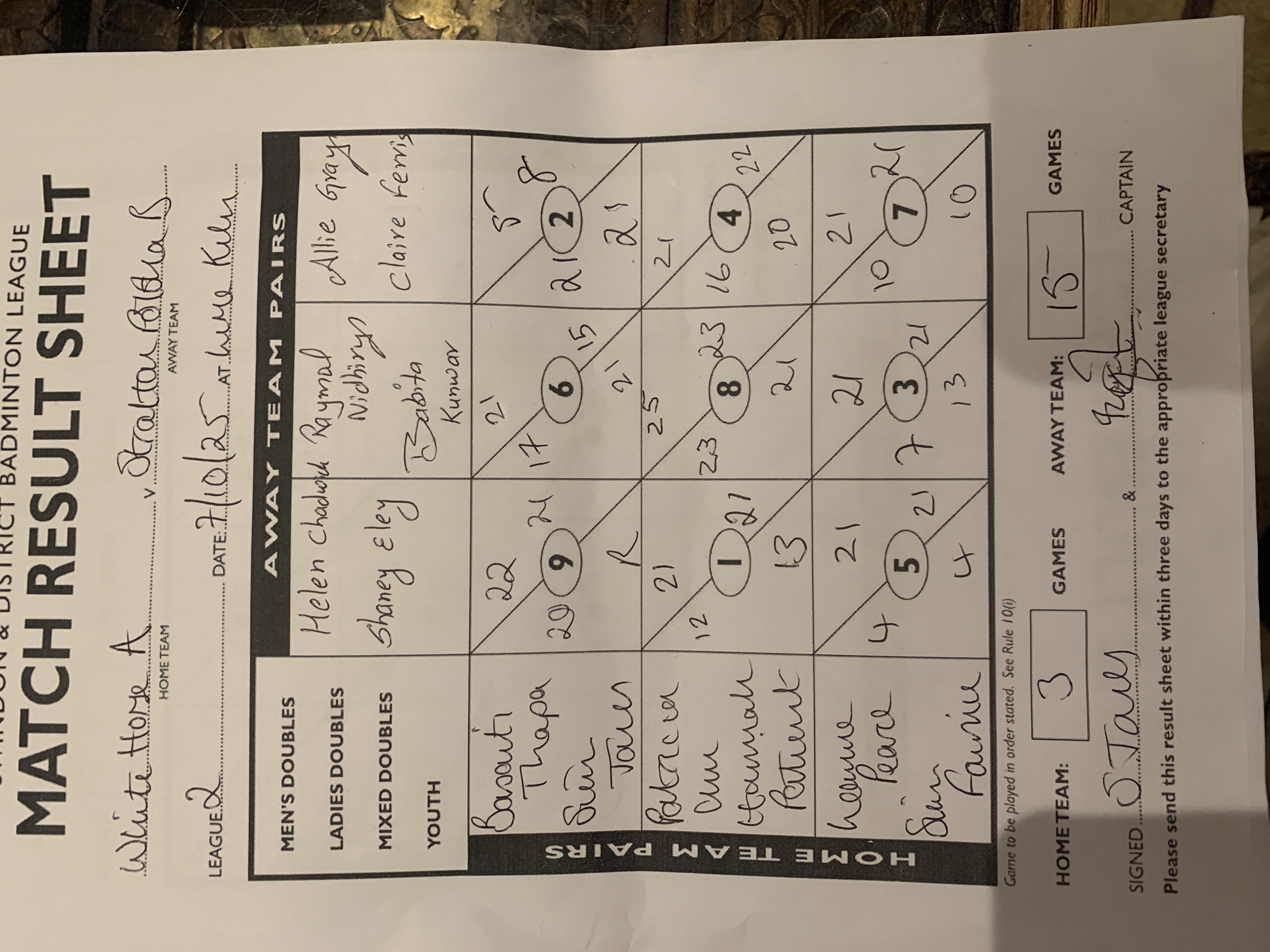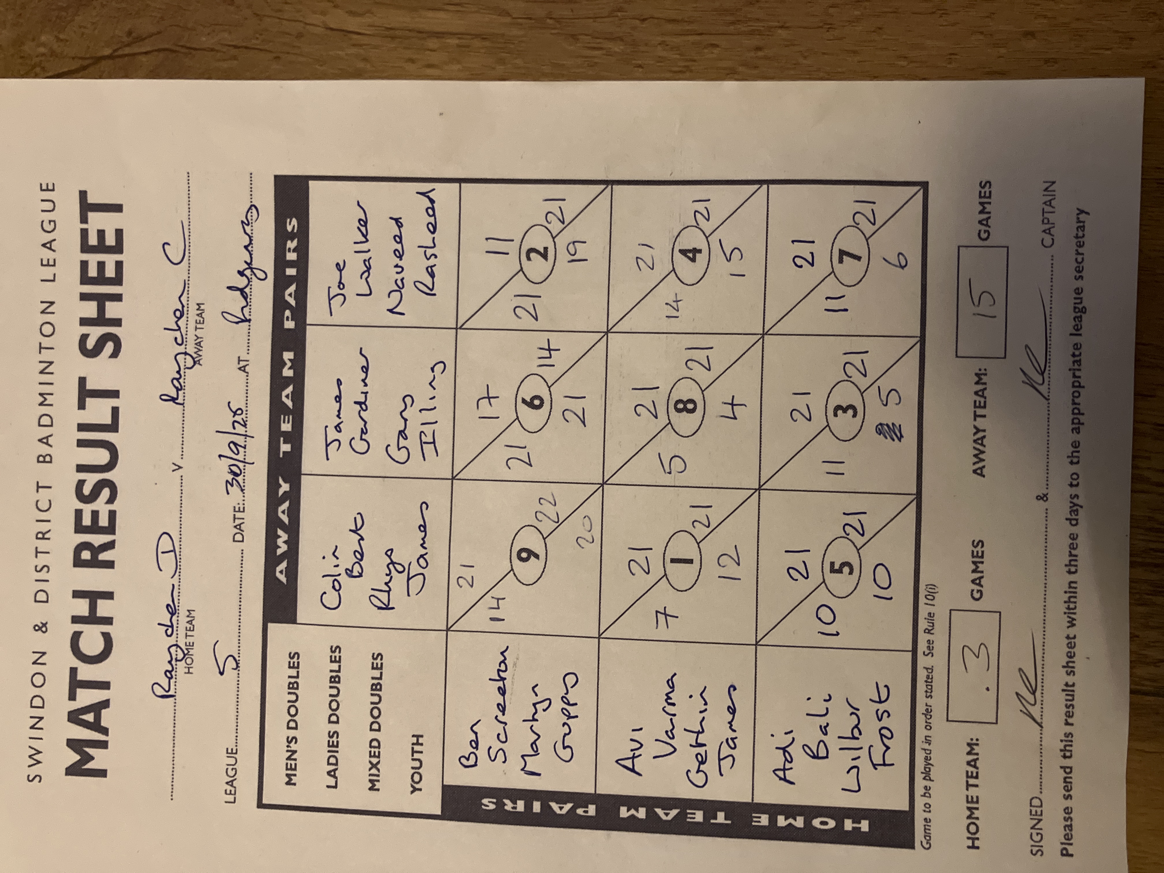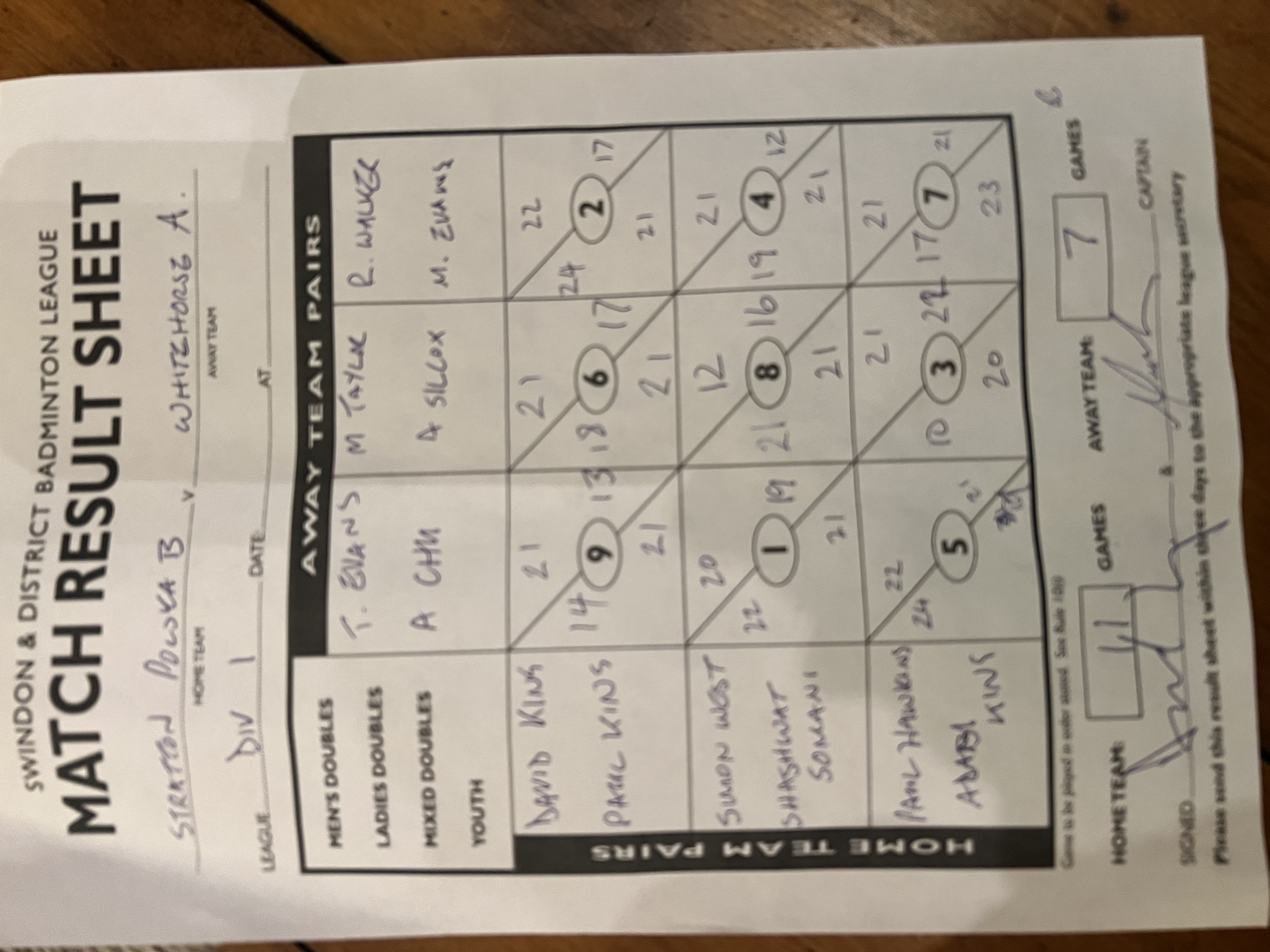 26-09-2025 | 19:00 | Friday | Swindon-Roussel B | 16 Feathers B | Ridgeway Leisure Centre, Inverary Road, Wroughton, Swindon, SN4 9DJ | 11 - 7 | |