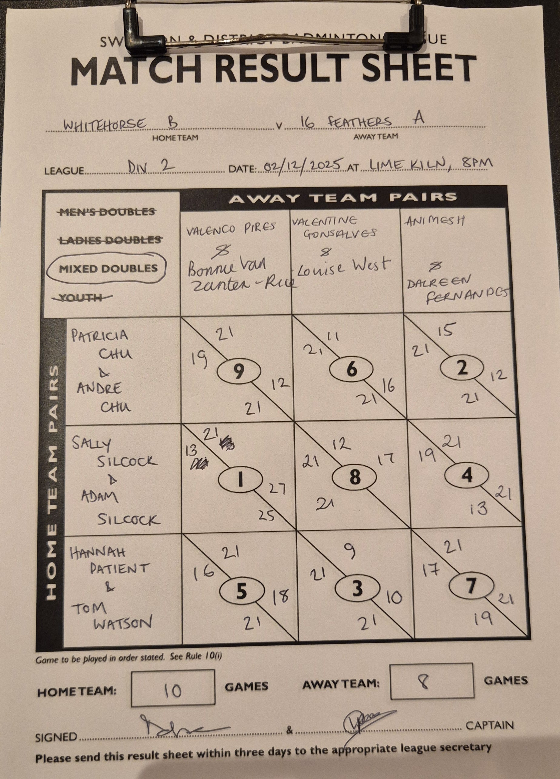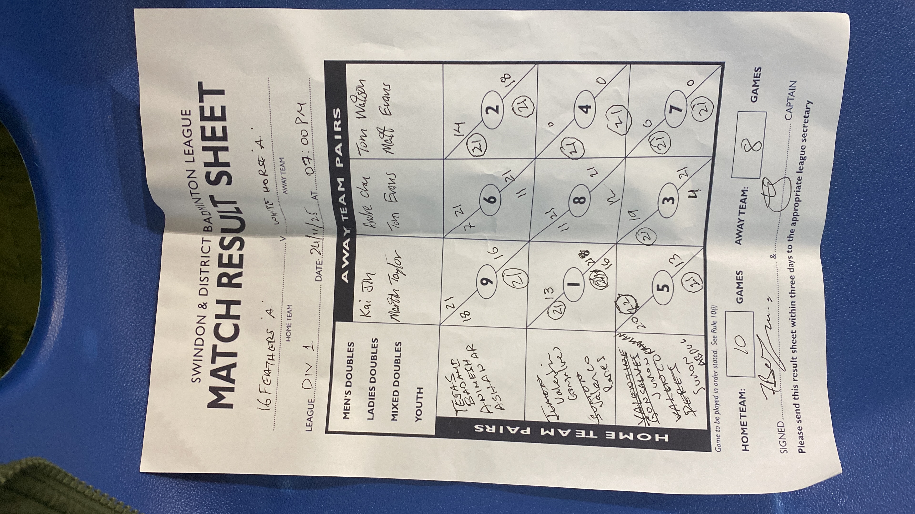 | 04-02-2026 | 20:00 | Wednesday | 16 Feathers A | Swindon-Roussel B | Lime Kiln Leisure Centre, Royal Wootton Bassett, Swindon, SN4 7HG | Upload | |