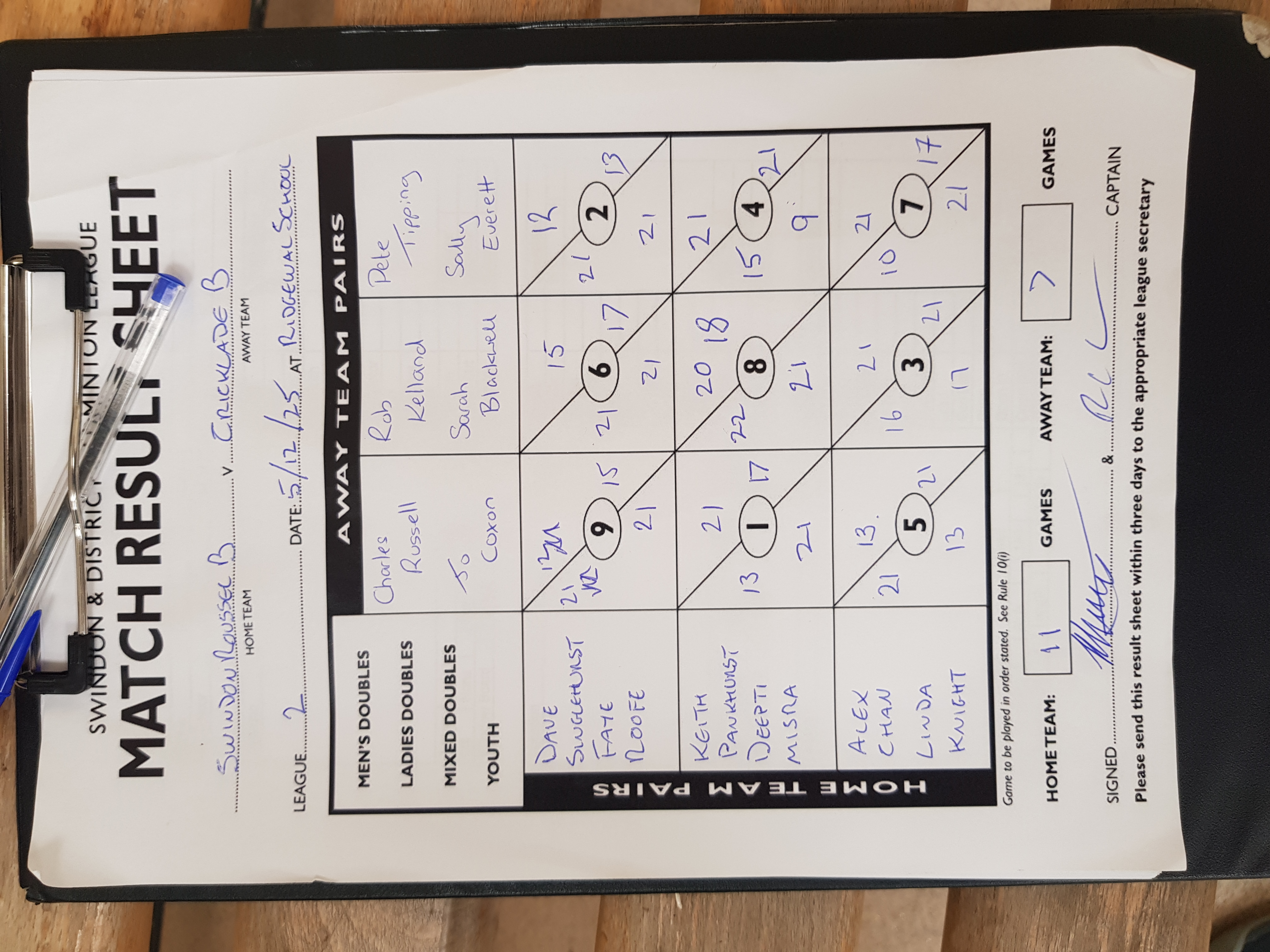 | 17-12-2025 | 19:30 | Wednesday | Cricklade B | Swindon-Roussel B | Cricklade Leisure Centre, Stones Lane, Cricklade, Swindon, Wiltshire, SN6 6JW | Upload | |
