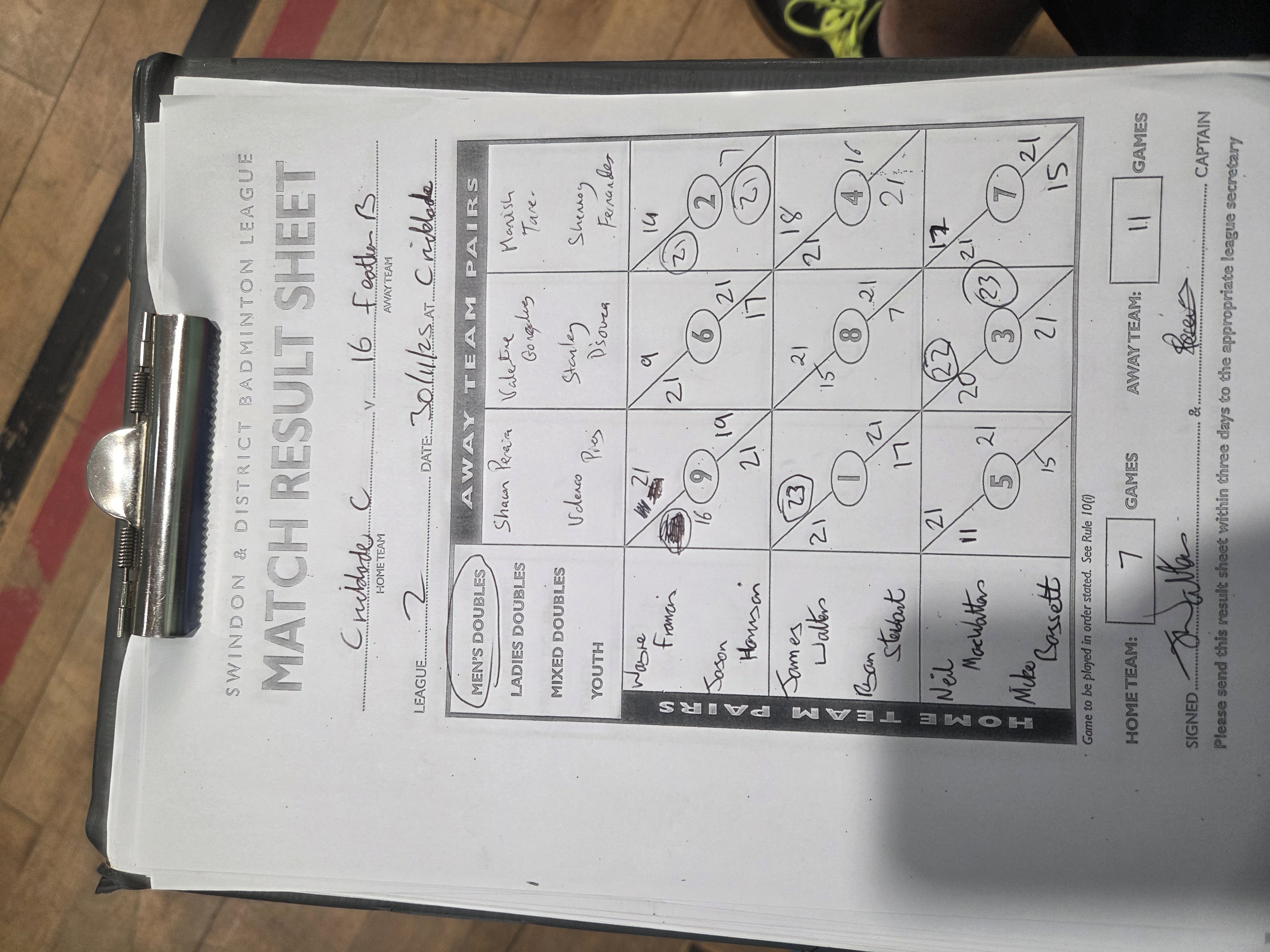 | 11-02-2026 | 19:30 | Wednesday | Cricklade B | 16 Feathers B | Cricklade Leisure Centre, Stones Lane, Cricklade, Swindon, Wiltshire, SN6 6JW | Upload | |