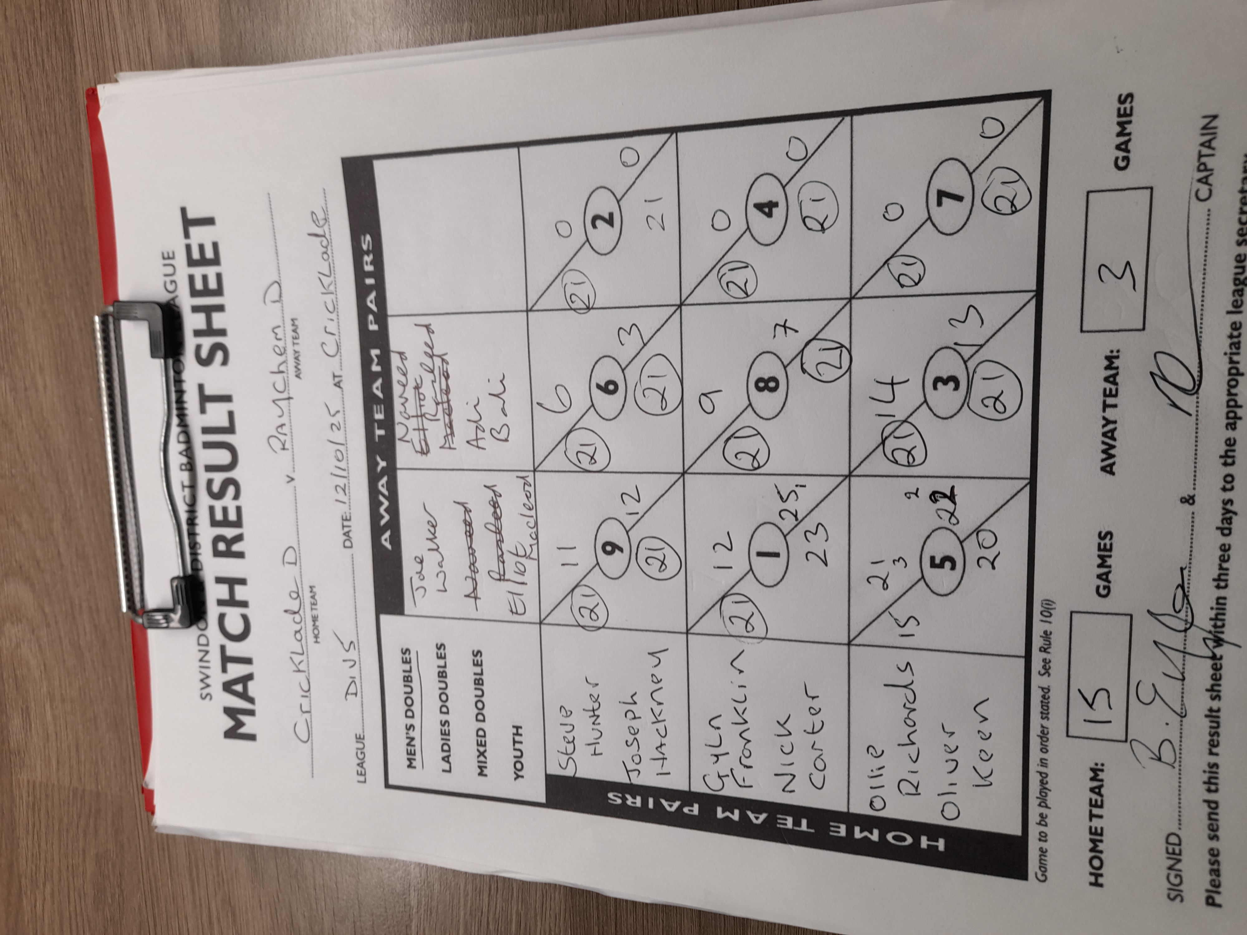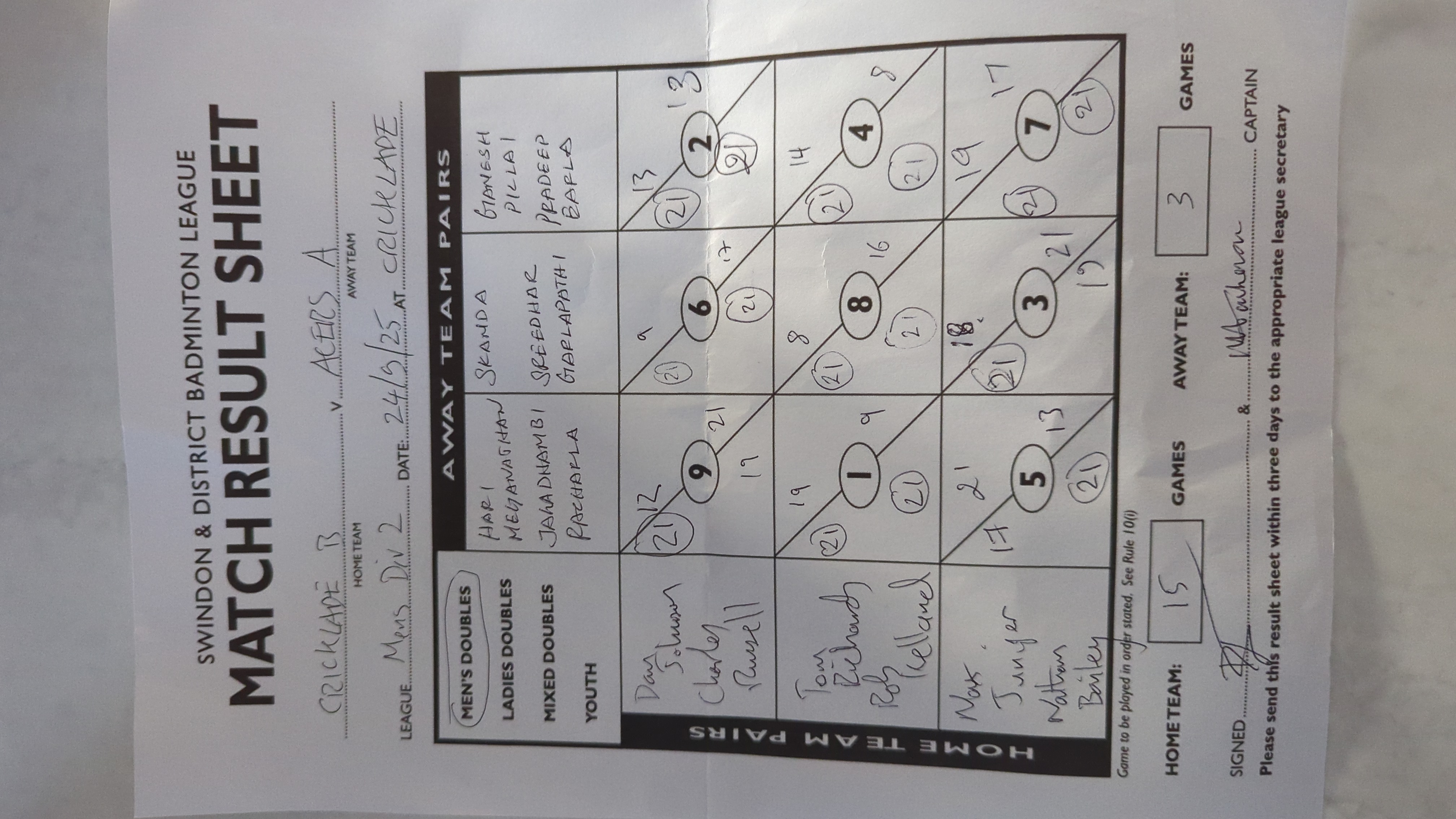 26-11-2025 | 19:30 | Wednesday | Cricklade B | Swindon-Roussel B | Cricklade Leisure Centre, Stones Lane, Cricklade, Swindon, Wiltshire, SN6 6JW | Upload | |