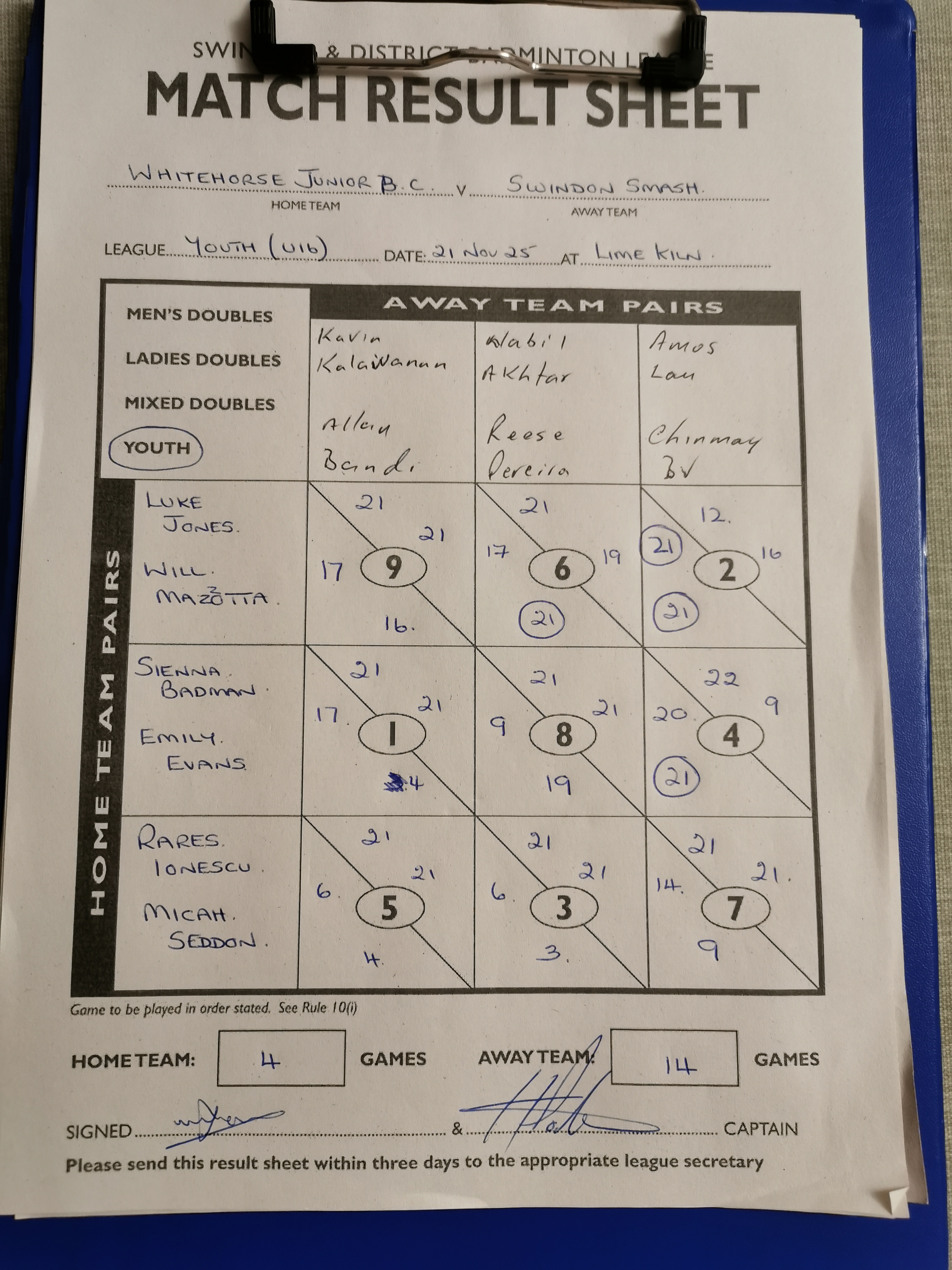 | 21-11-2025 | 18:00 | Friday | Wootton Bassett Whitehorse Juniors A | Swindon Smash Juniors U16A | Lime Kiln Sports Centre, Royal Wootton Bassett, Swindon, SN4 7HG | 4 - 14 | |