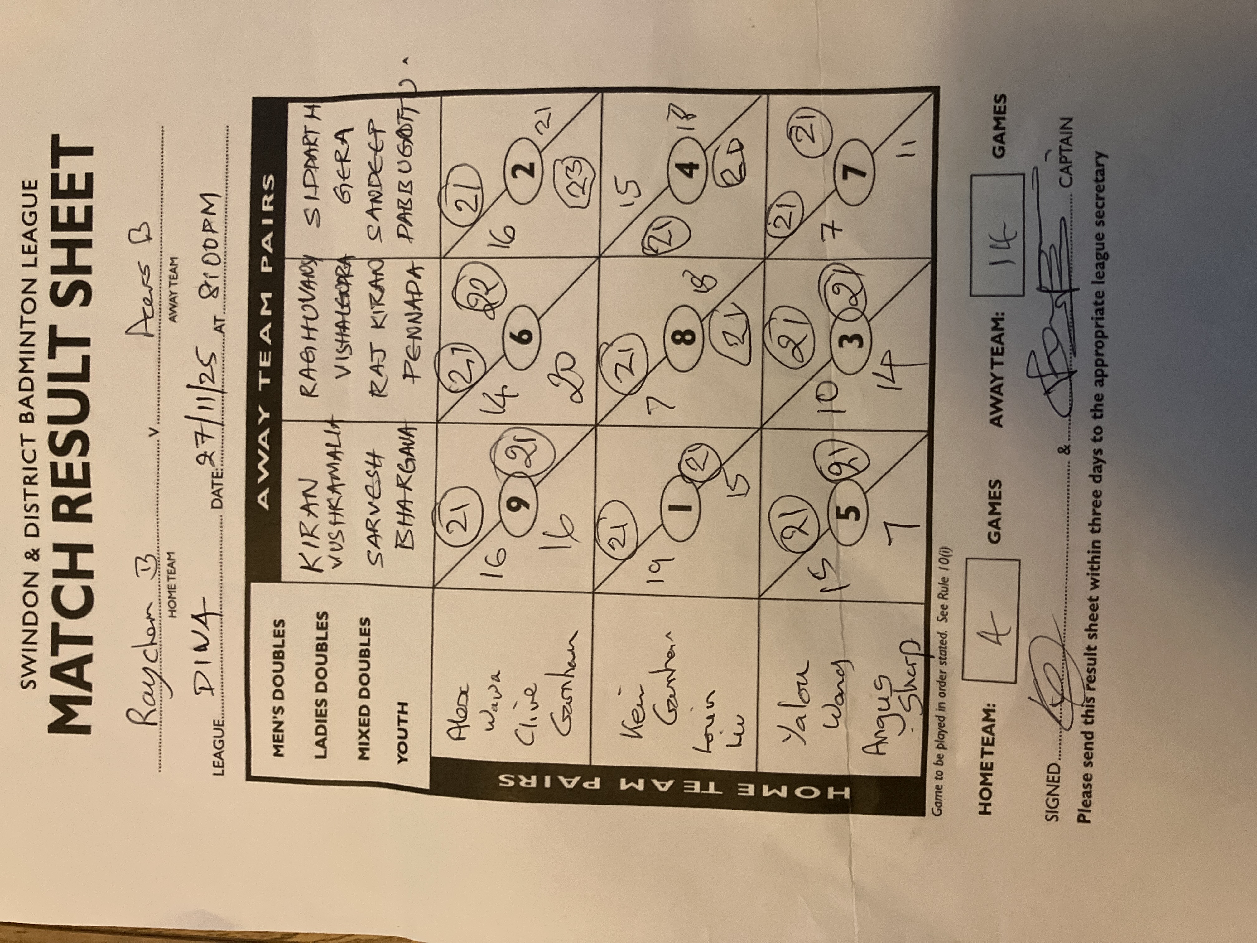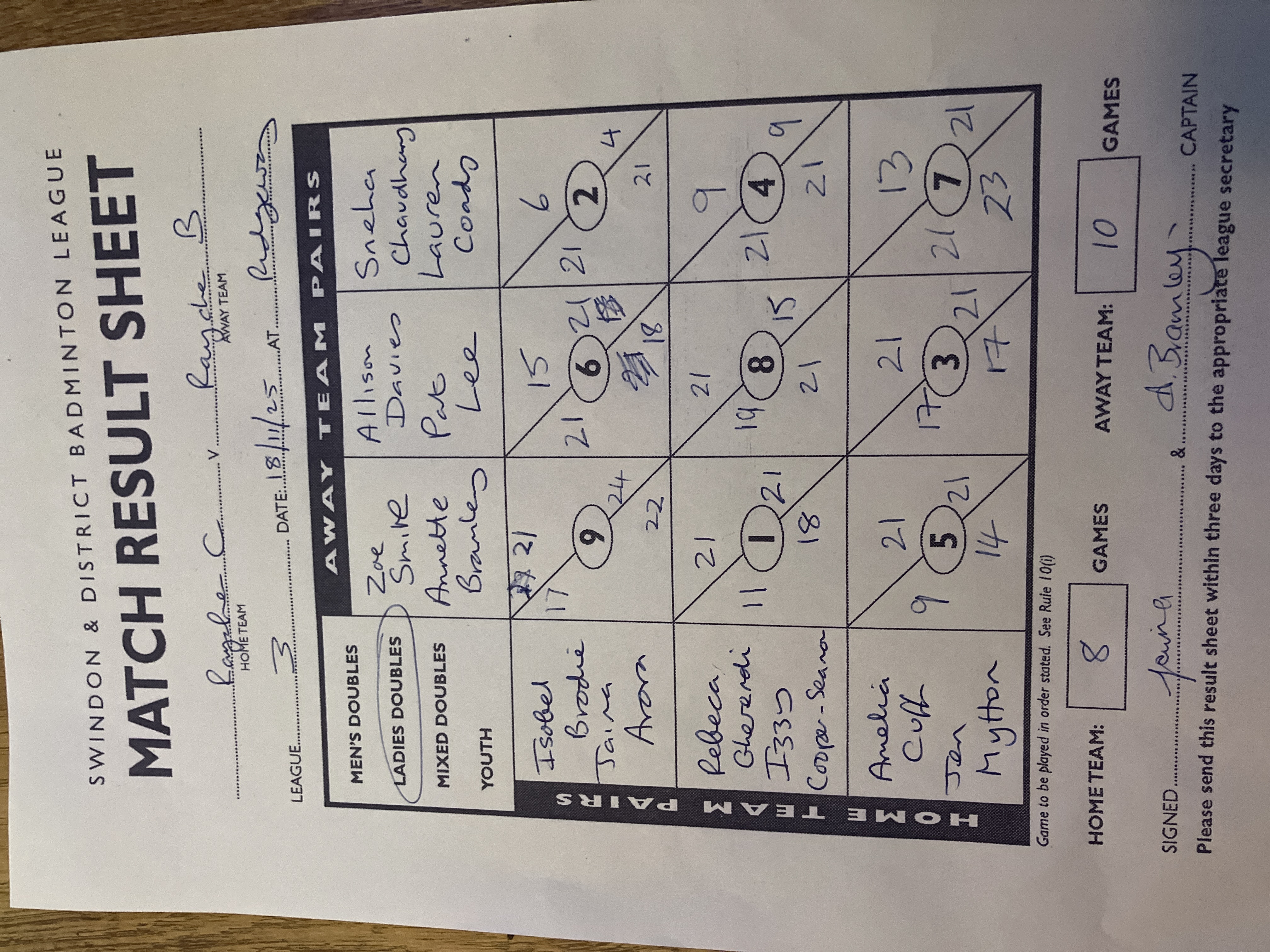 | 25-09-2025 | 20:00 | Thursday | Raychem B | David Lloyd | Ridgeway Leisure Centre, Inverary Road, Wroughton, Swindon, SN4 9DJ | 10 - 8 | |