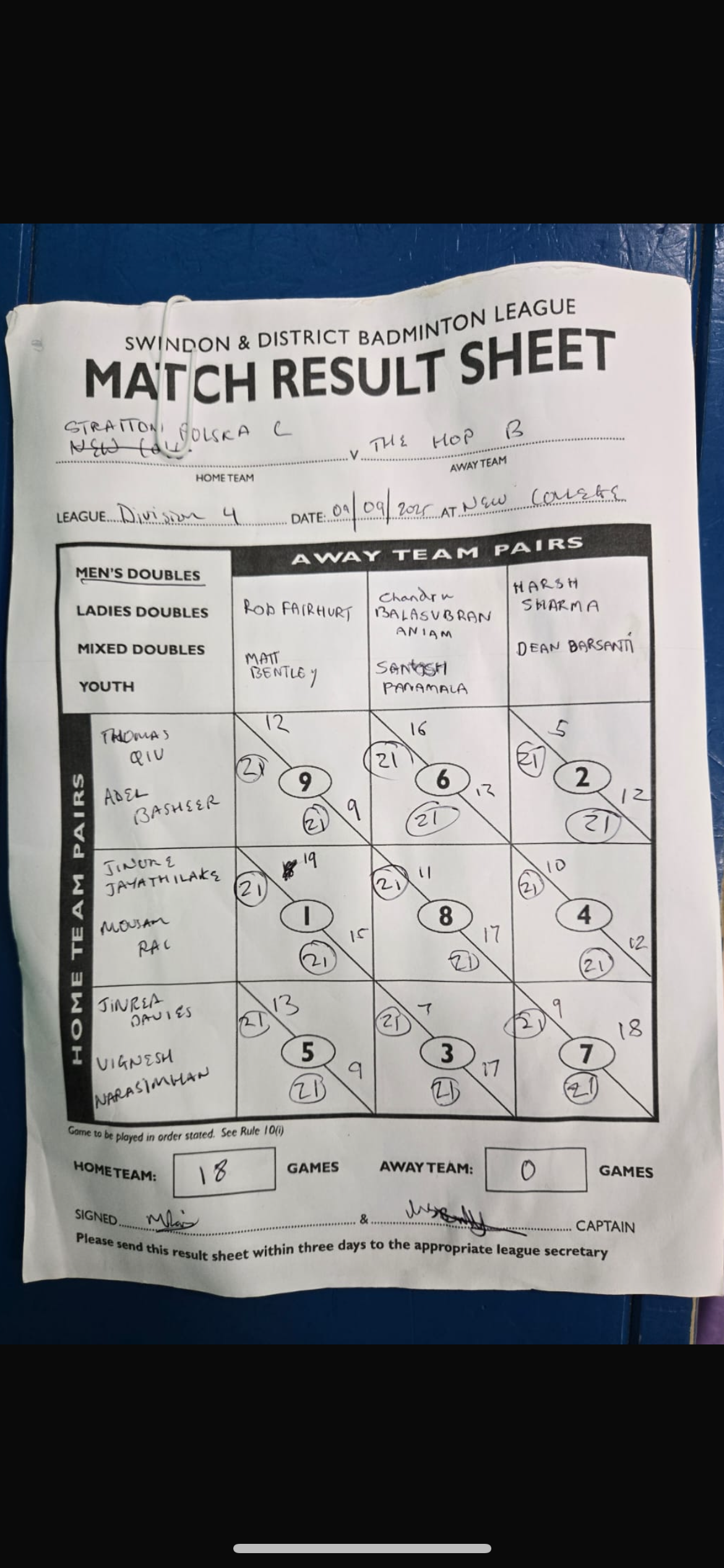 09-09-2025 | 19:00 | Tuesday | Stratton Polska C | The Hop B | New College Sports Centre , New College Drive Swindon, SN3 1AH | 12 - 6 | |