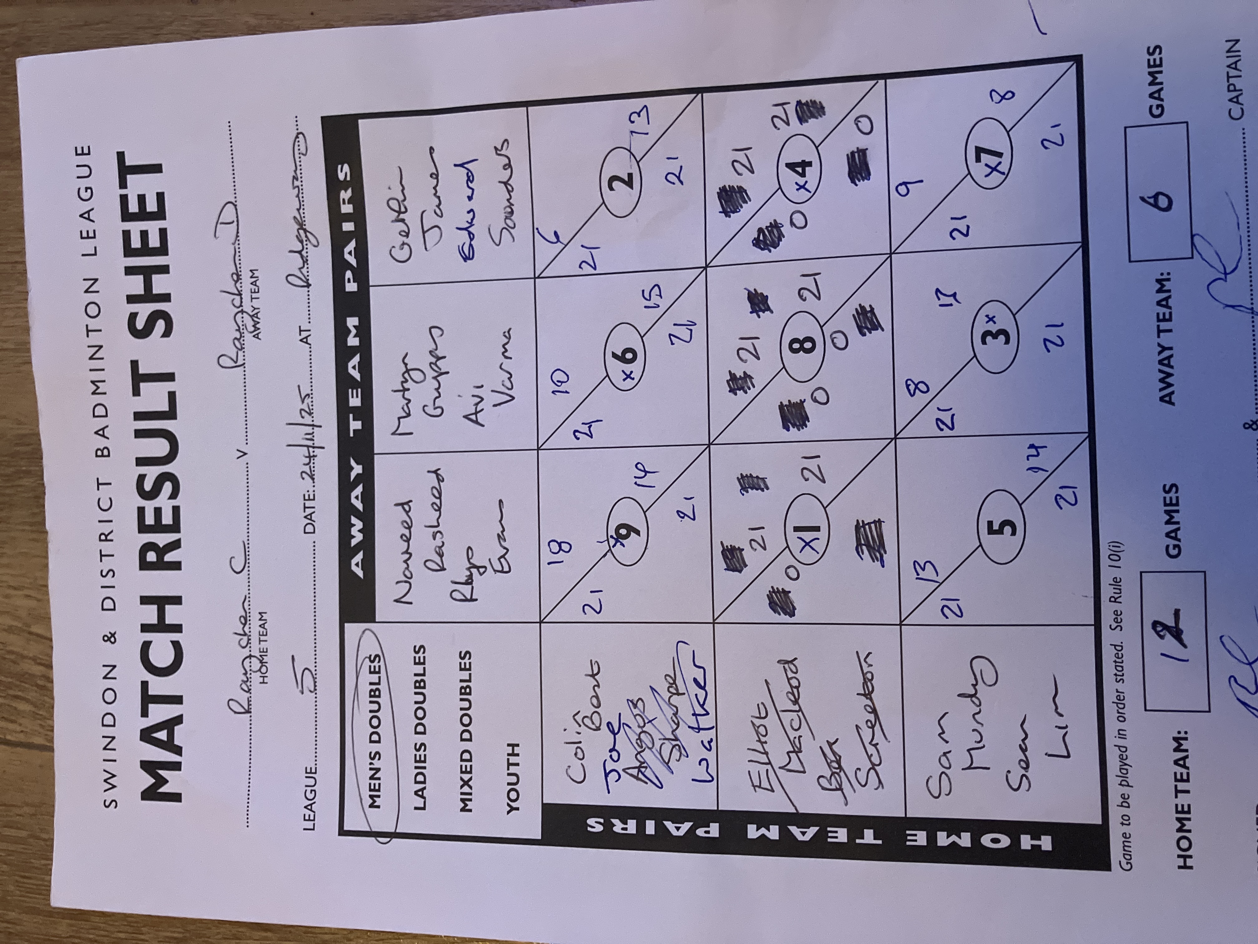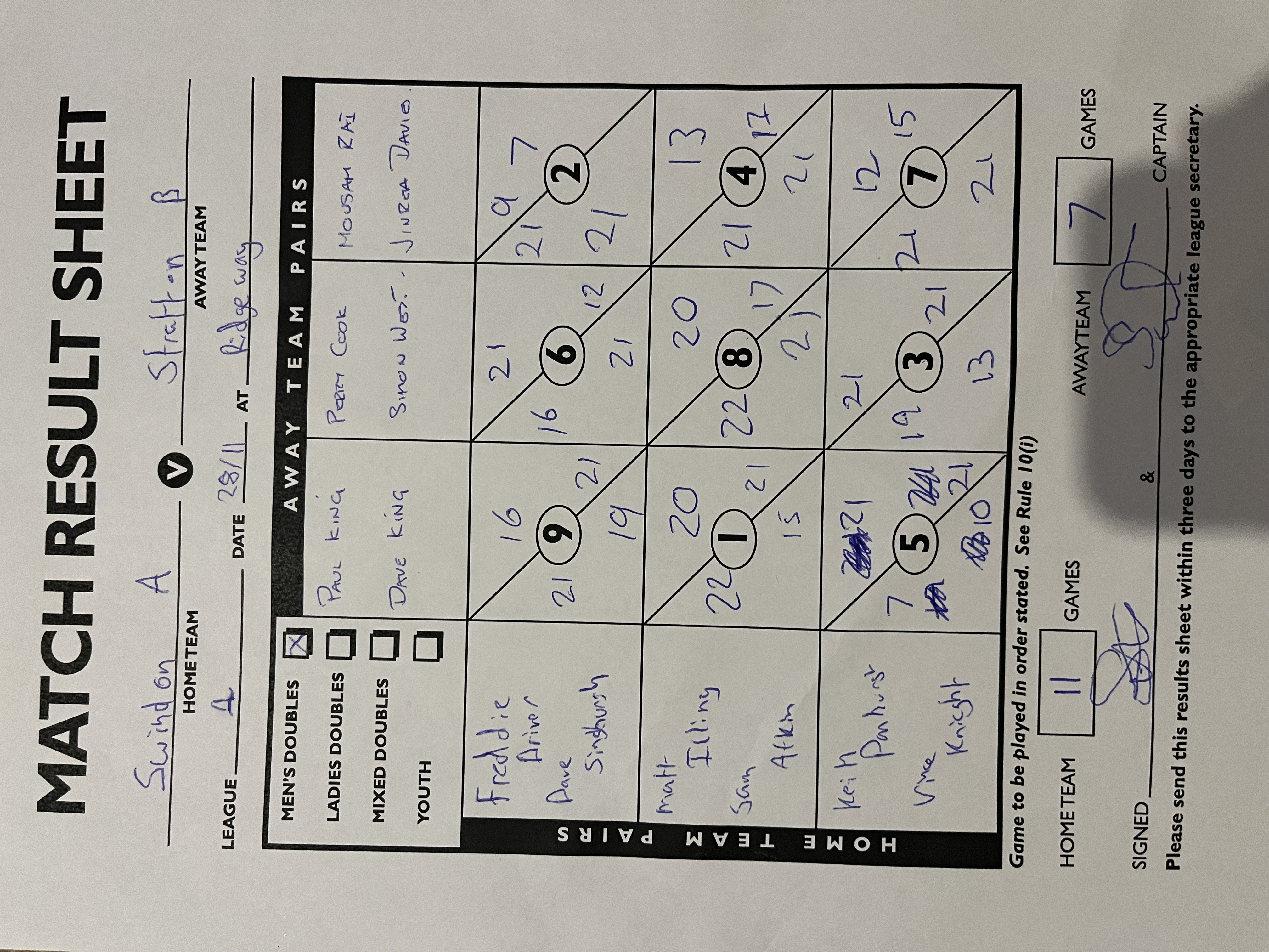 | 03-11-2025 | 19:00 | Monday | 16 Feathers B | Brecon A | Grange Leisure and Community Centre, Grange Dr, Swindon, SN3 4JY | 12 - 6 | |